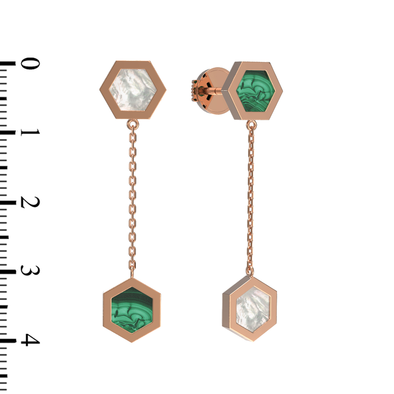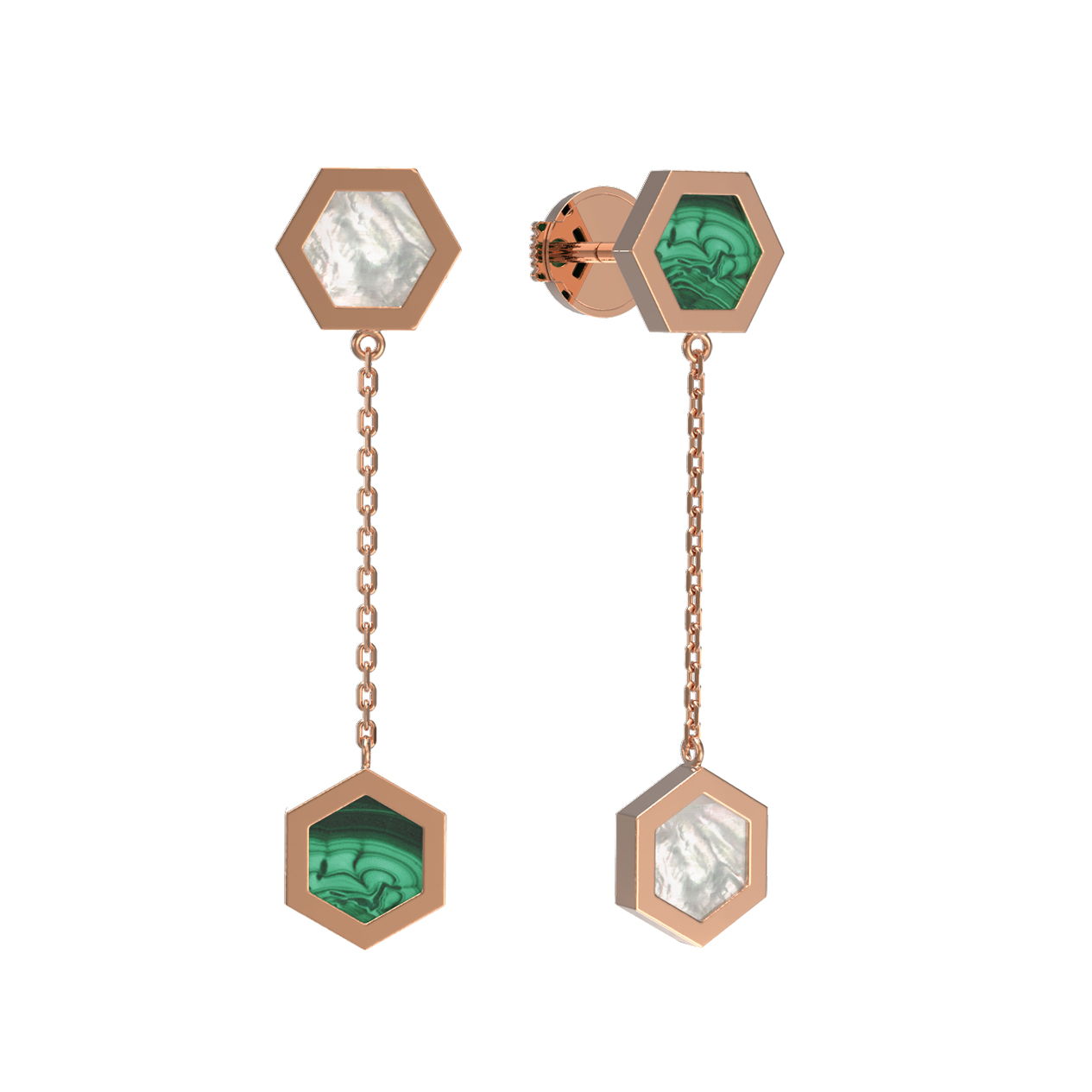 В центре композиции — изысканные вставки из малахита насыщенного зелёного цвета и нежного перламутра. Две вставки гармонично дополняют друг друга, создавая уникальную игру текстур и оттенков при каждом движении. Общее количество вставок в паре — две. Эти серьги из коллекции De Luxe — Молекула универсальны и подходят как для женщин, так и для мужчин, предпочитающих смелые и архитектурные украшения.