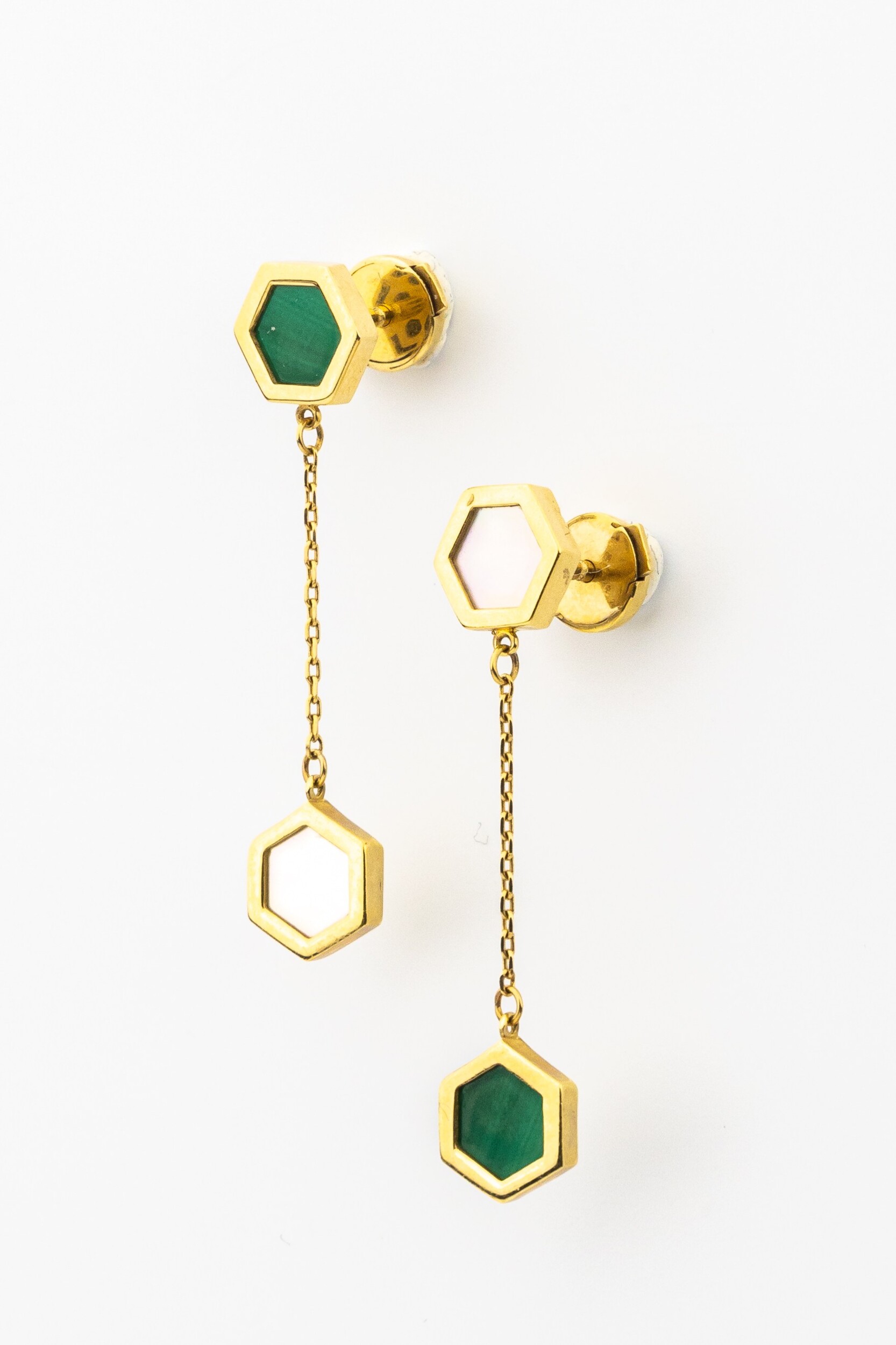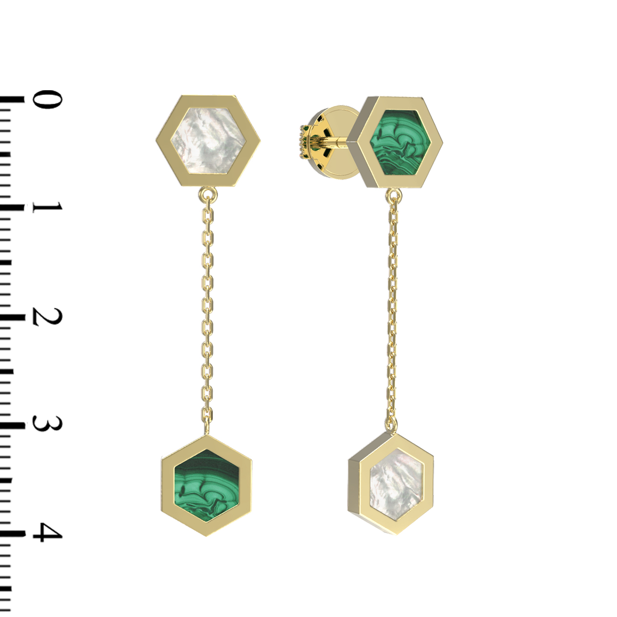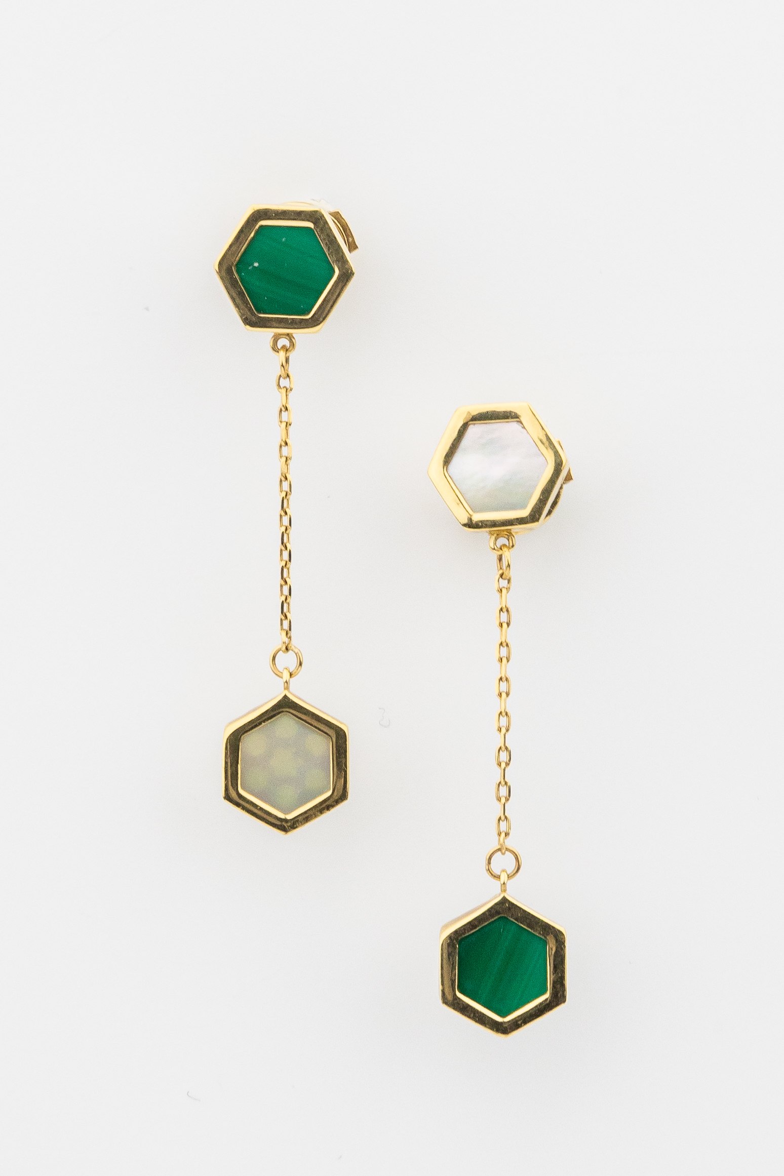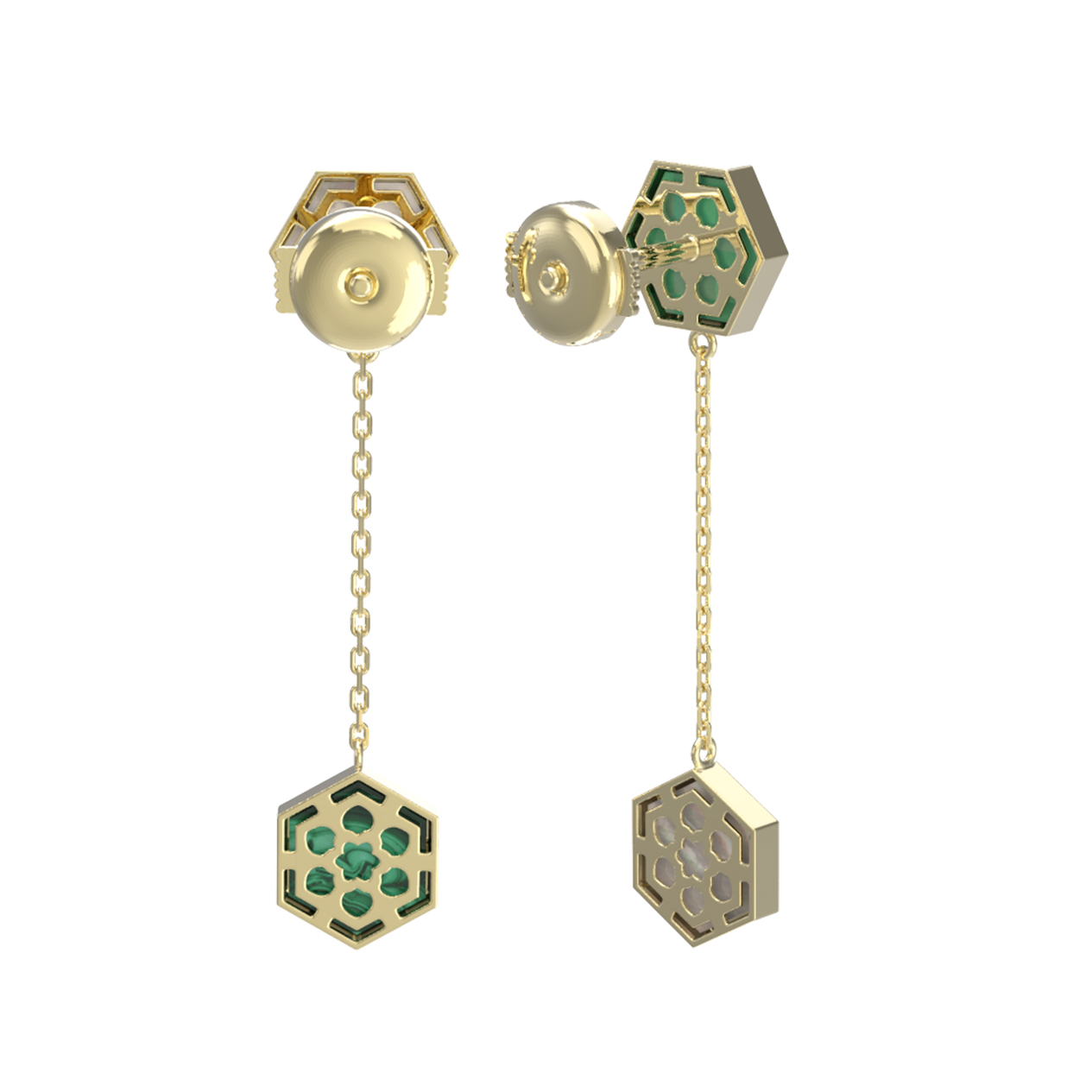 В центре композиции — контрастный дуэт природных материалов: насыщенный зеленый малахит с его неповторимым рисунком и нежный, переливчатый перламутр. В каждой серьге расположено по 2 вставки, создающих динамичную игру света при движении. Благодаря своей универсальной эстетике, эти серьги подходят как для женщин, так и для мужчин, предпочитающих современные ювелирные решения.