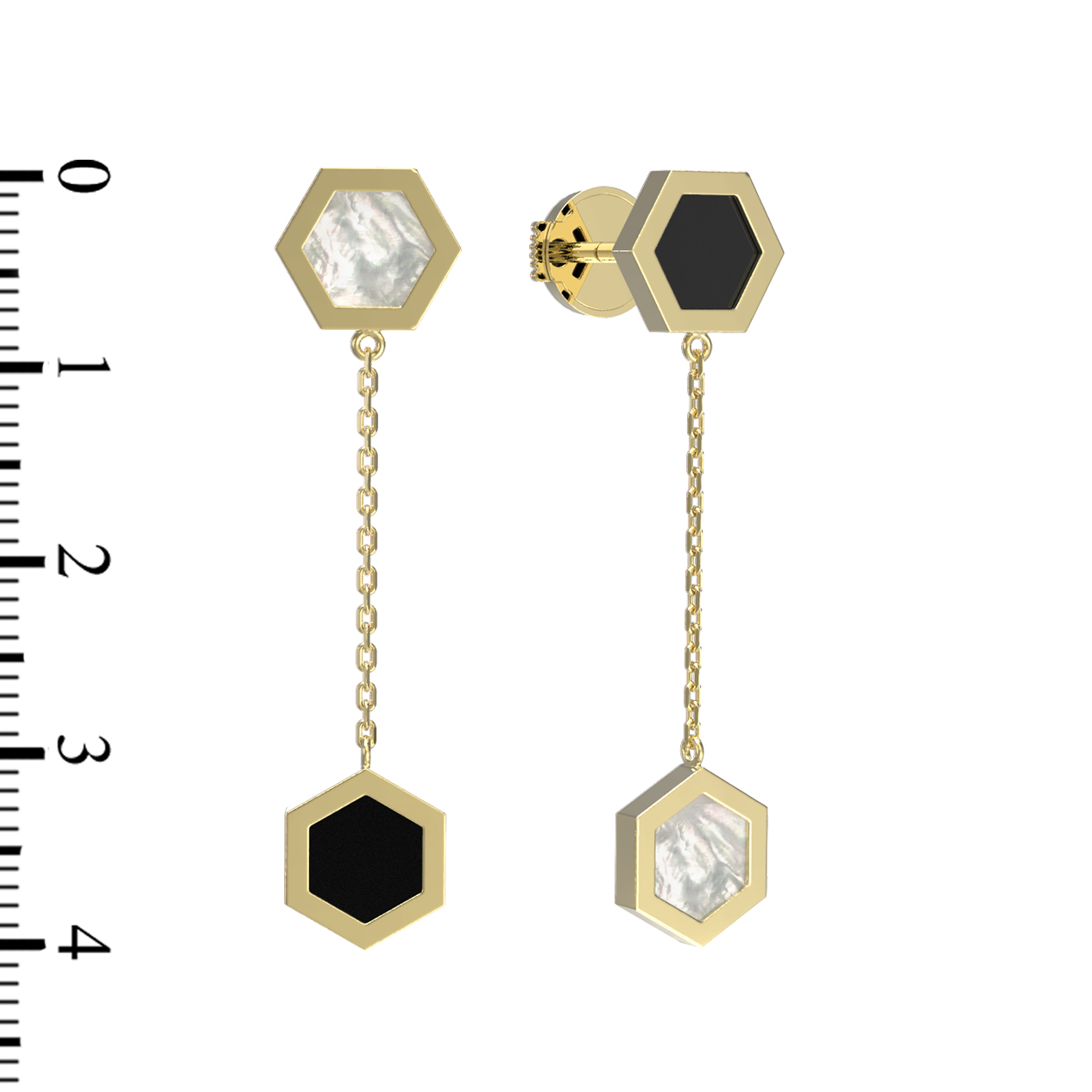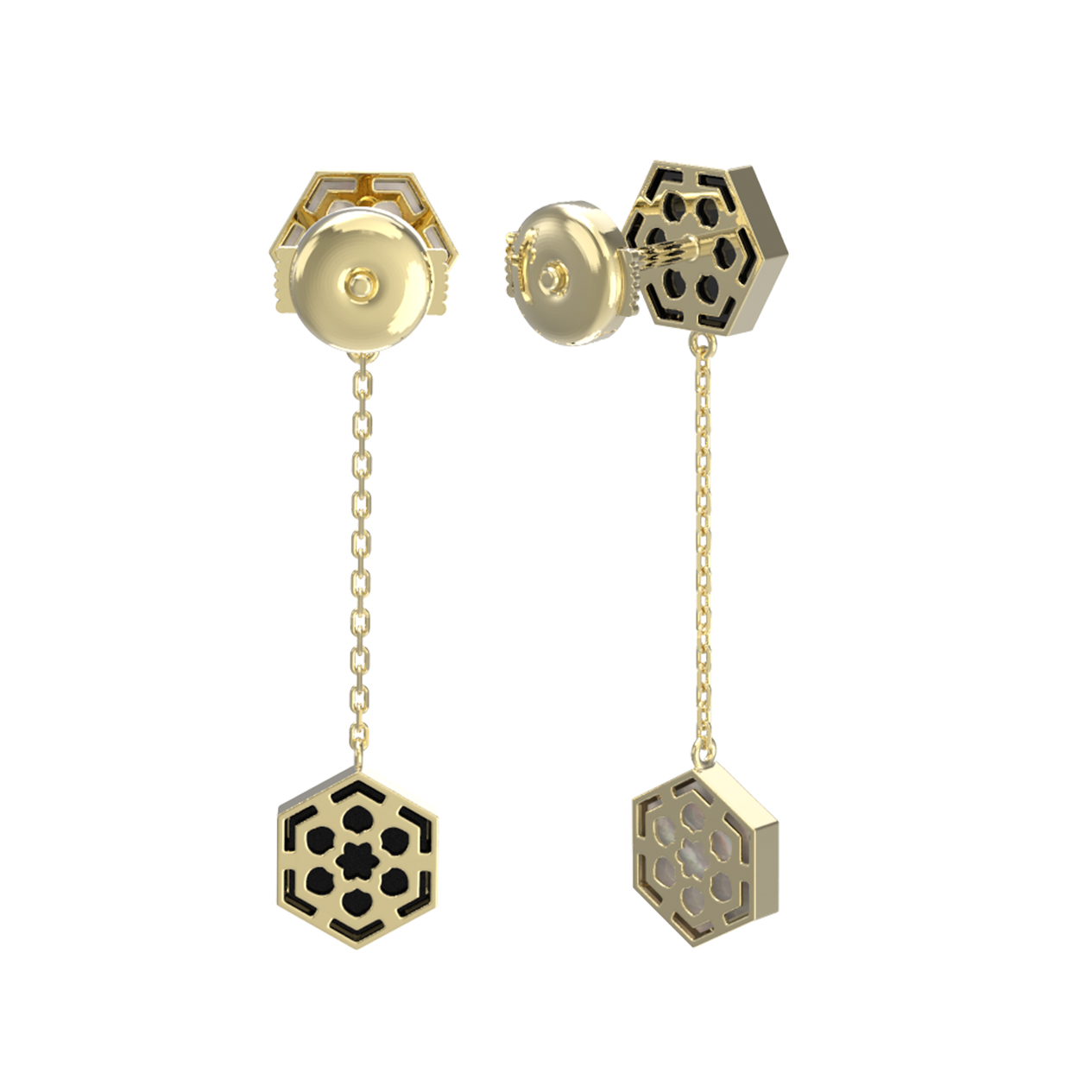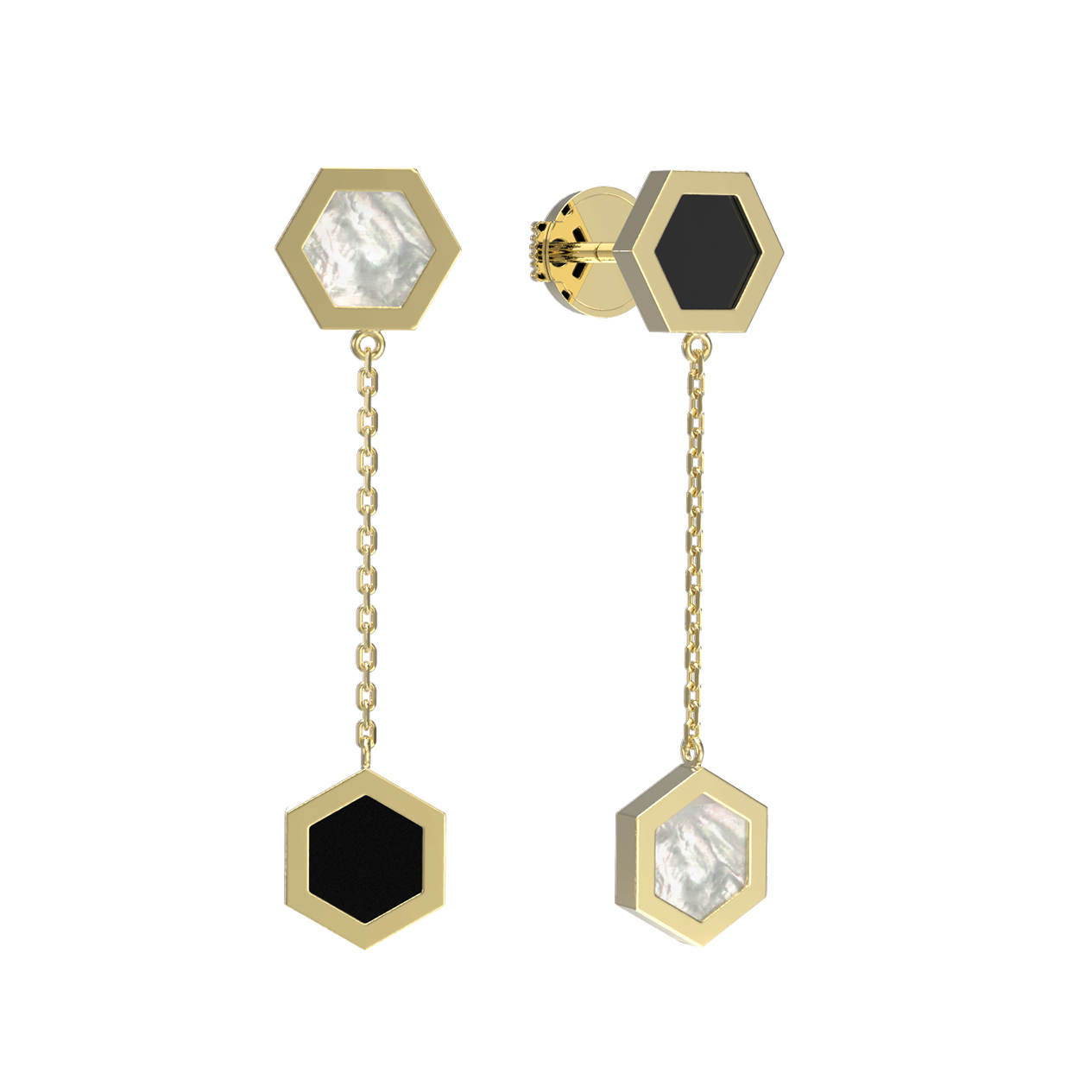 Эффектные серьги из лимонного золота 585 пробы станут воплощением вашего стиля и индивидуальности. Украшение выполнено в необычном дизайне Молекула, вдохновленном эстетикой геометрии и чистоты форм. Главная особенность изделия заключается в гармоничном сочетании двух контрастных вставок: глубокого черного оникса и нежного переливчатого перламутра, которые имеют актуальную форму шестигранника.