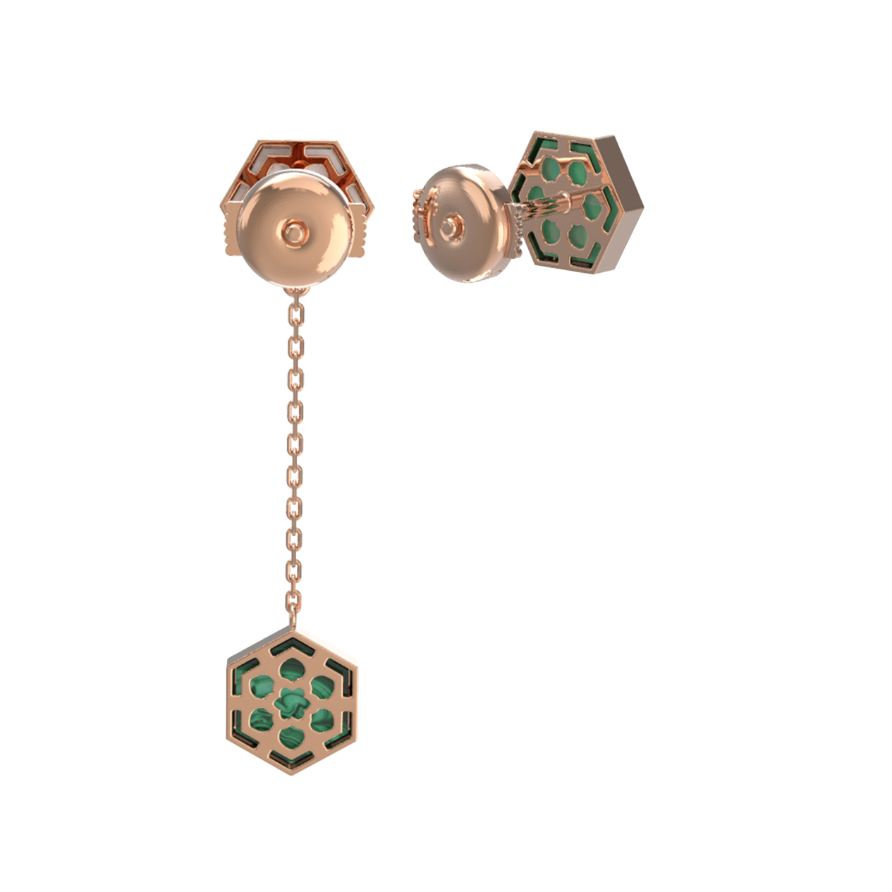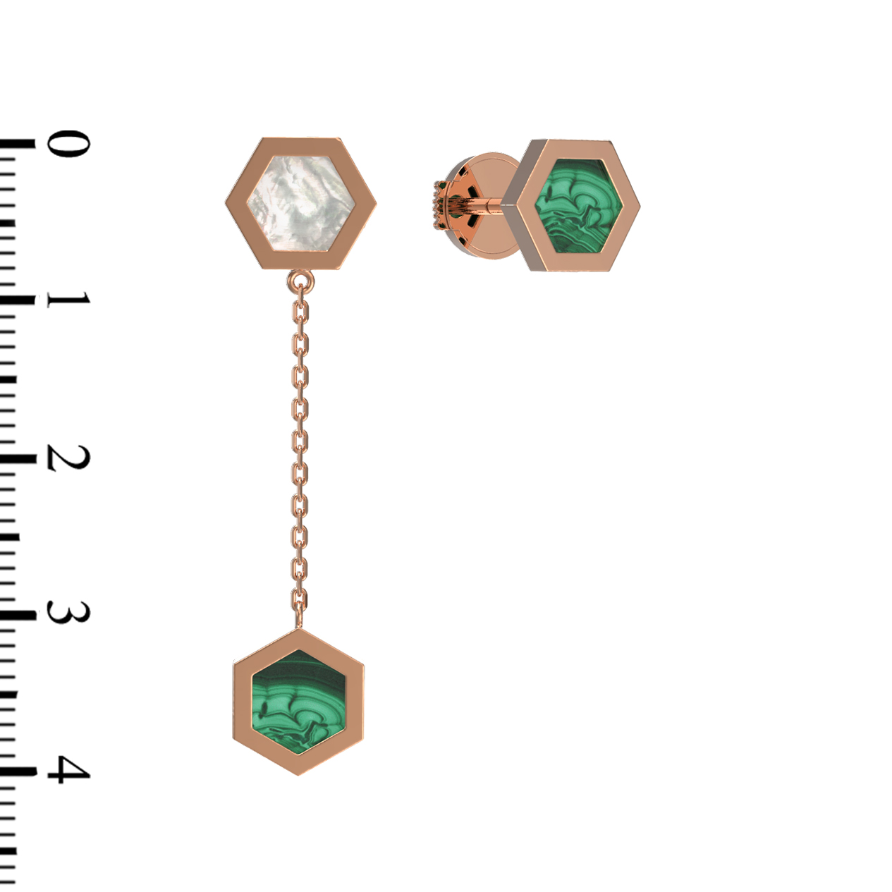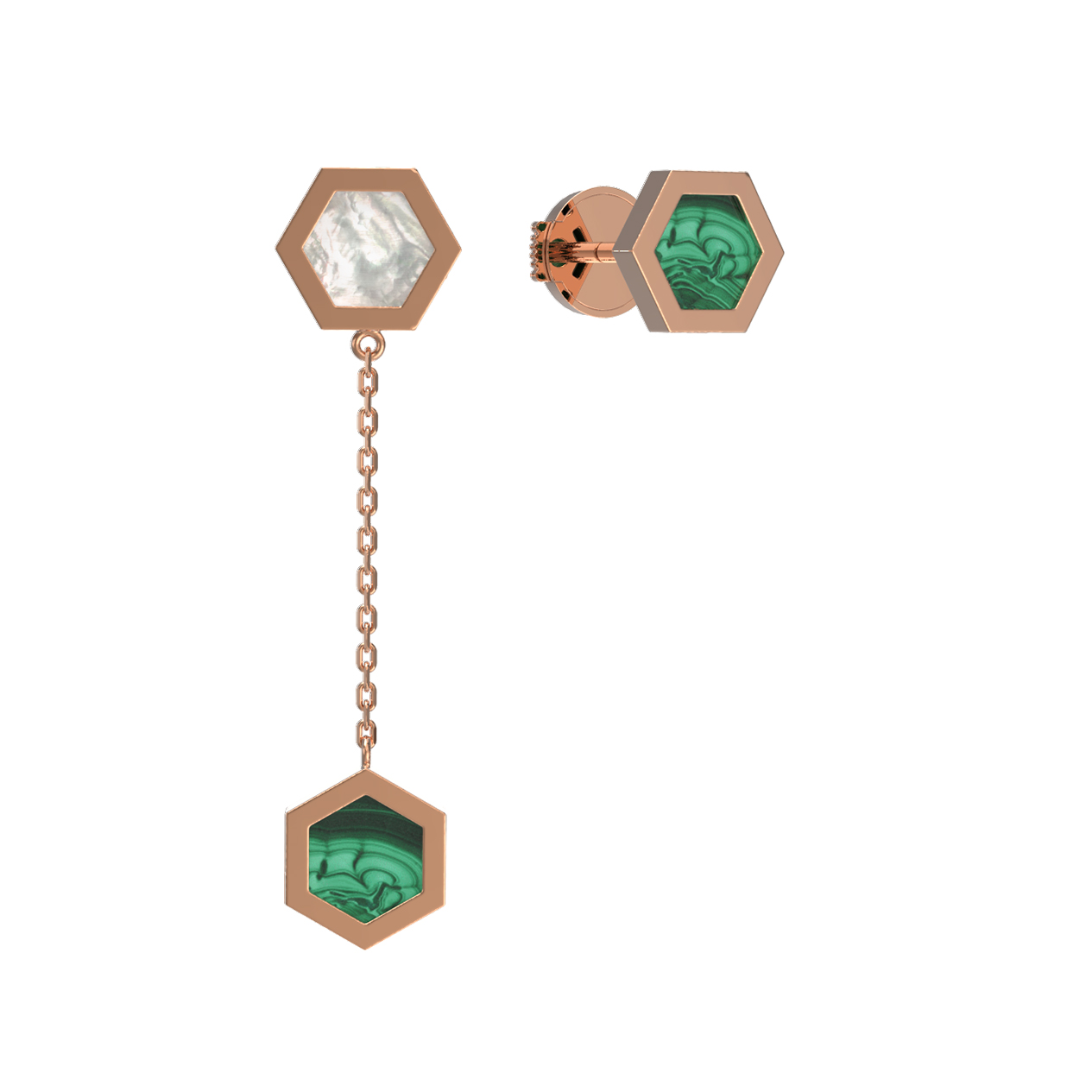 Особую художественную ценность украшению придают вставки в форме шестигранника. В данных серьгах гармонично соседствуют малахит с его завораживающим зелёным рисунком и нежный перламутр с мягким переливом. Всего в изделии использованы 2 вставки, которые создают эффектный контраст и подчеркивают глубину исполнения. Дизайн в стиле молекула придает украшению динамичность, позволяя ему выглядеть актуально и статусно.