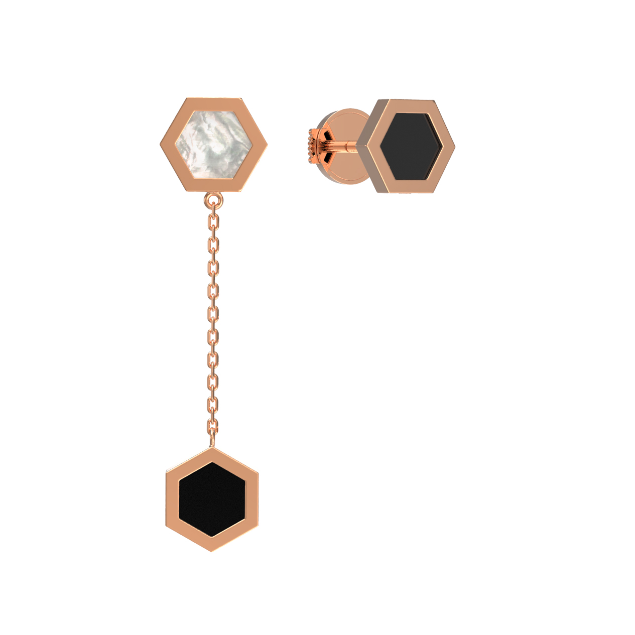 В центре композиции расположены две вставки: глубокий черный оникс и нежный перламутр, контрастное сочетание которых придает украшению особую выразительность. Геометрические вставки имеют форму правильного шестигранника, подчеркивая выверенность линий и современный стиль. Теплый оттенок красного золота гармонично дополняет переливы перламутра и насыщенный тон оникса, создавая баланс между классикой и актуальными трендами.