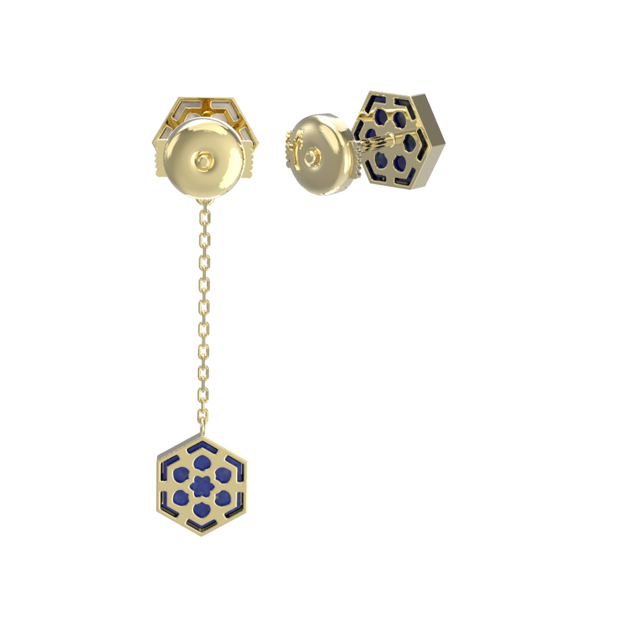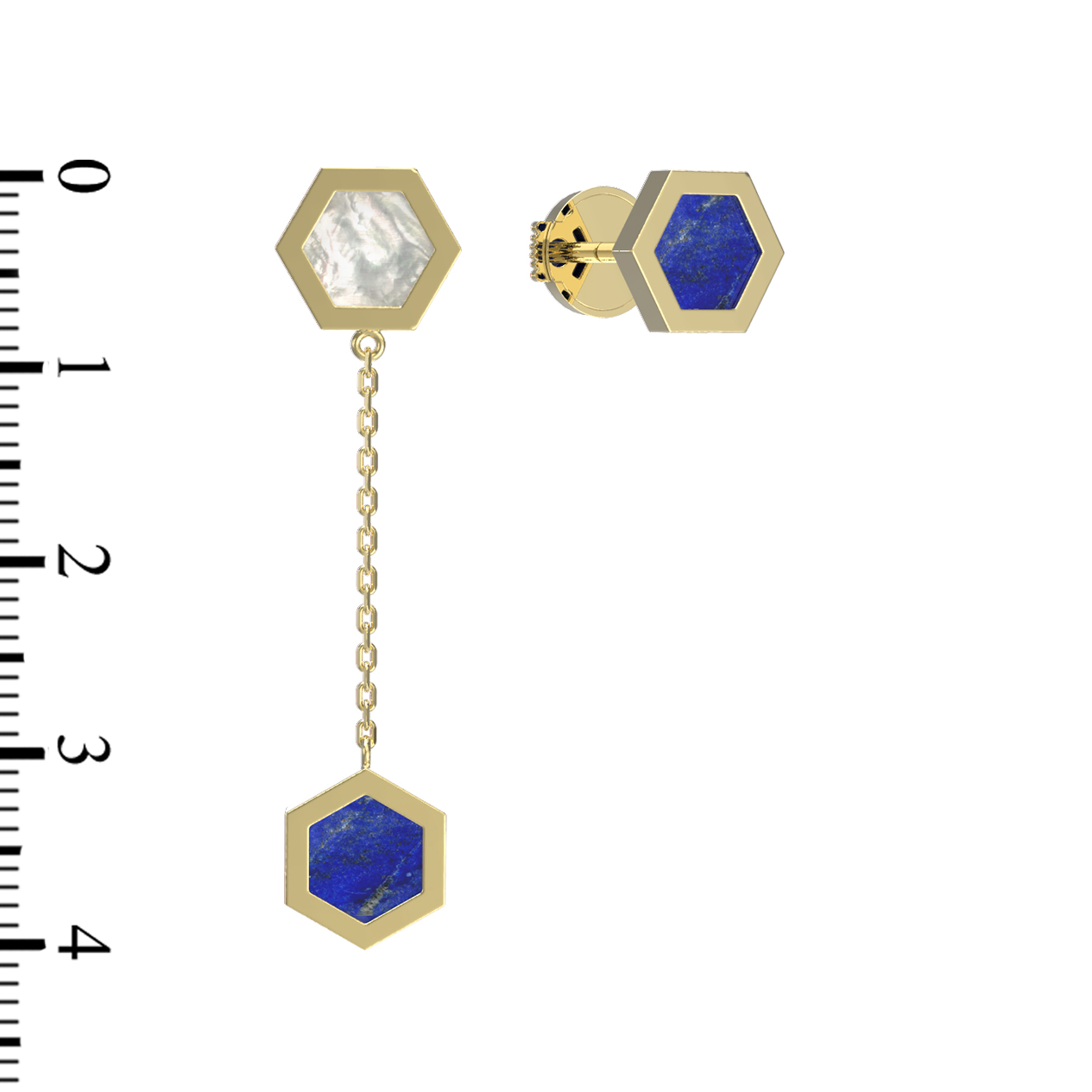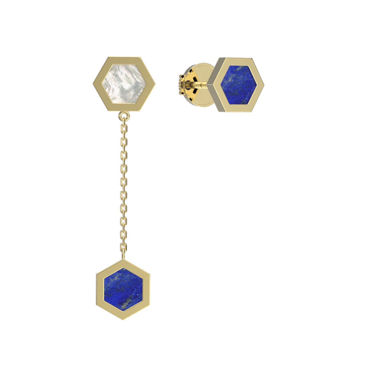 В этой модели использованы 2 вставки необычной формы — правильный шестигранник. Глубокий синий цвет лазурита в сочетании с нежным перламутром создает завораживающий визуальный эффект. Четкие линии и выверенная геометрия делают эти серьги универсальным аксессуаром, который подойдет как для женщин, так и для мужчин, предпочитающих нестандартные украшения. Асимметричный дизайн добавляет динамики, превращая серьги в яркий акцент любого образа.