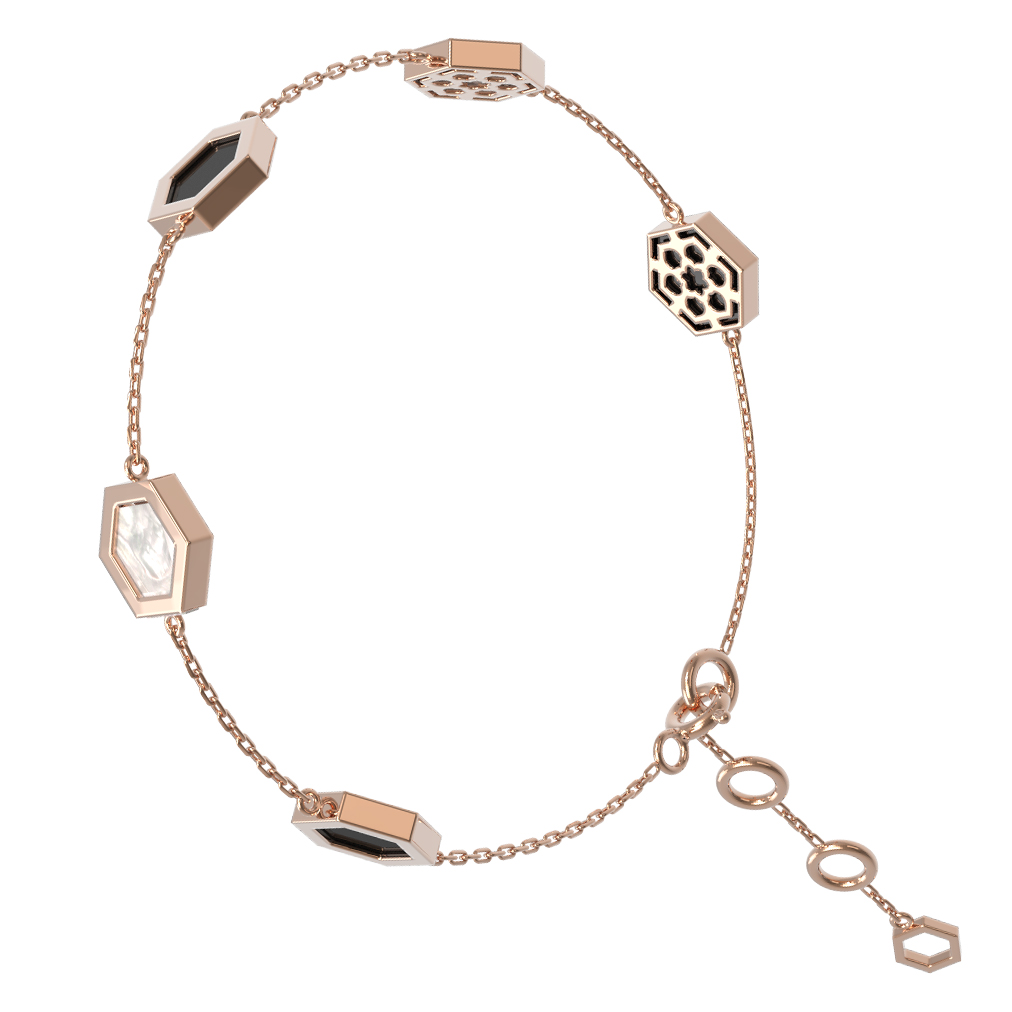 Особую выразительность браслету придает сочетание контрастных материалов. Вставки из черного оникса и нежного перламутра гармонично дополняют друг друга, создавая сбалансированную композицию. Глубокий черный цвет оникса эффектно контрастирует с мягким сиянием перламутра, делая украшение универсальным акцентом как для строгого делового костюма, так и для вечернего наряда. Тонкая, изящная цепочка комфортно располагается на запястье, обеспечивая легкость и удобство при ношении.