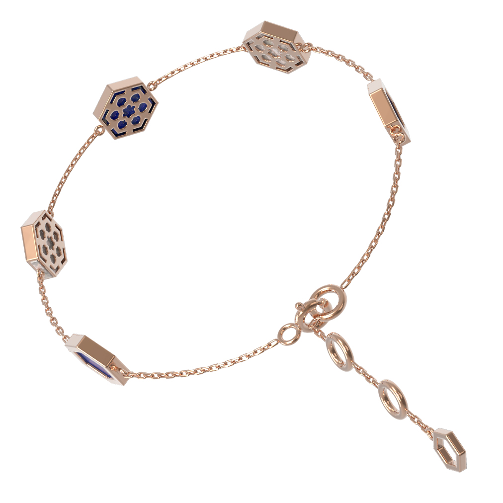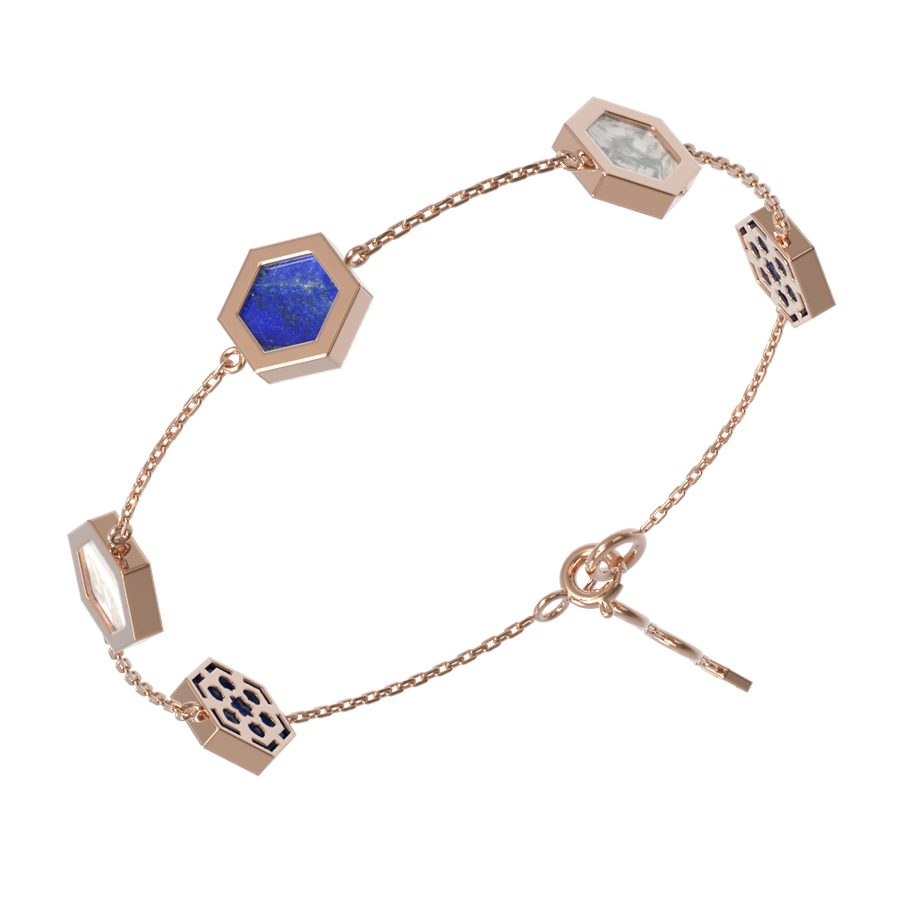 Центральными элементами композиции выступают три вставки в форме шестигранника. Глубокий синий цвет натурального лазурита эффектно соседствует с нежным, переливчатым перламутром, создавая выразительную игру оттенков. Лаконичная цепочка надежно соединяет декоративные элементы, обеспечивая комфортную посадку на запястье. Такой браслет универсален в своем исполнении: он одинаково органично смотрится как в женском, так и в мужском образе, подчеркивая индивидуальность владельца.