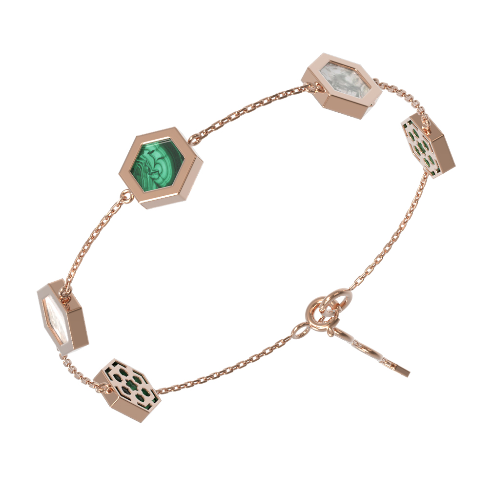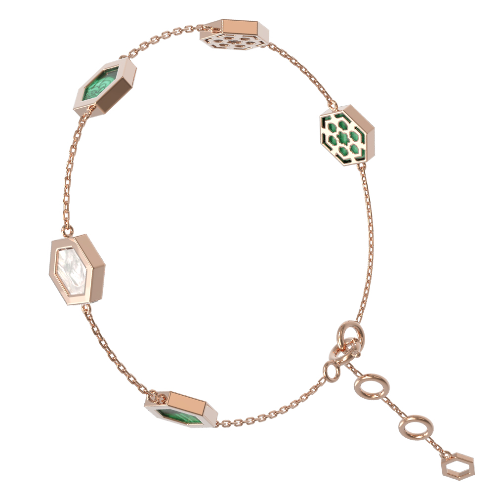 Элегантный браслет из красного золота 585 пробы из коллекции De Luxe — Молекула станет достойным дополнением вашего ювелирного гардероба. Дизайн изделия вдохновлен структурой молекулы, что придает украшению современный и концептуальный вид. В качестве центральных акцентов выступают три вставки в форме правильного шестигранника. Глубокий зеленый цвет малахита гармонично сочетается с мягким перламутровым блеском, создавая эффектный контраст.