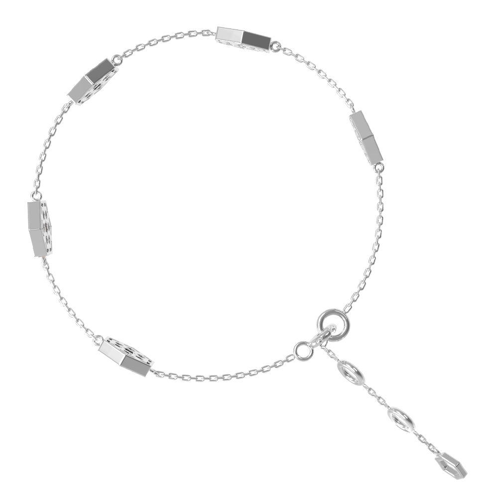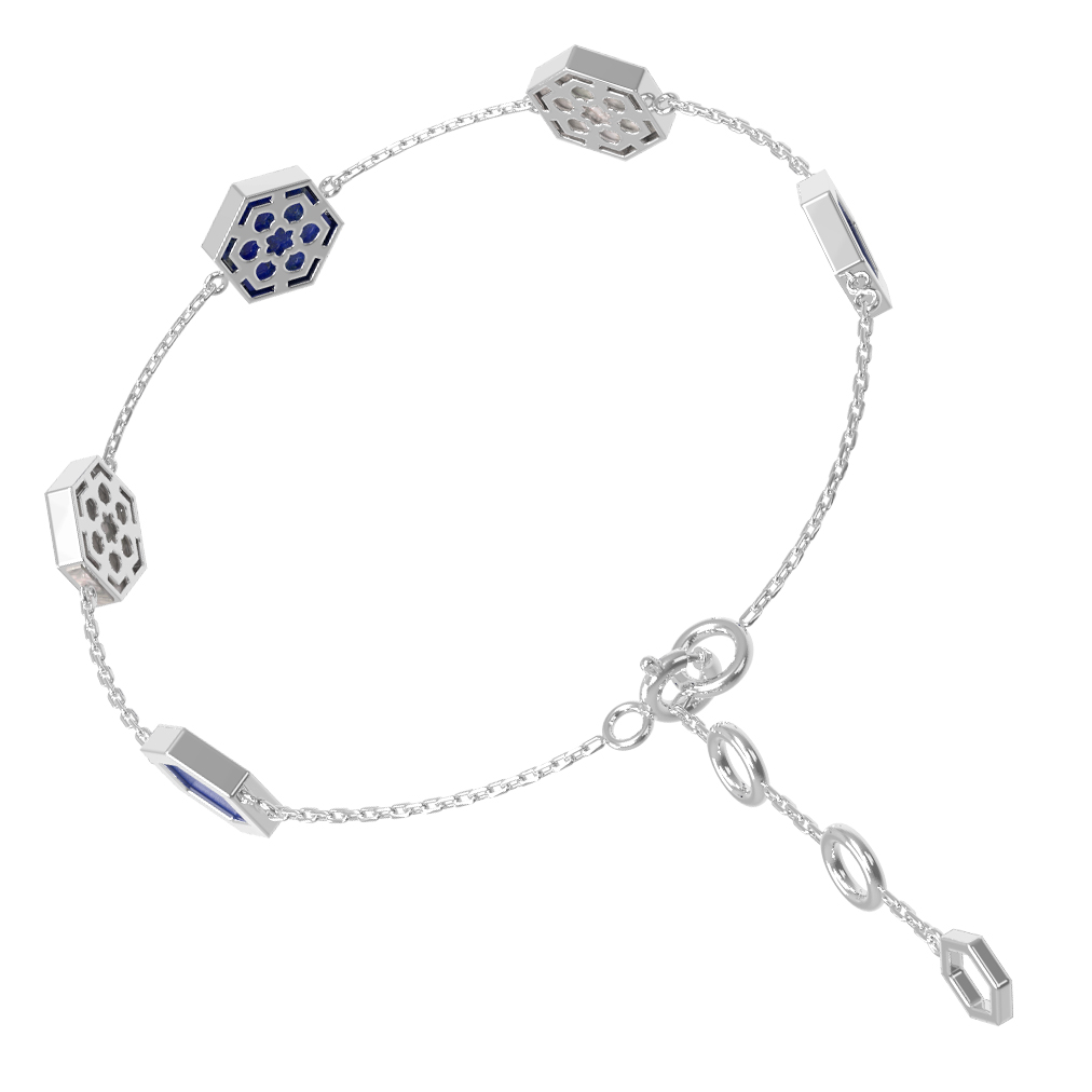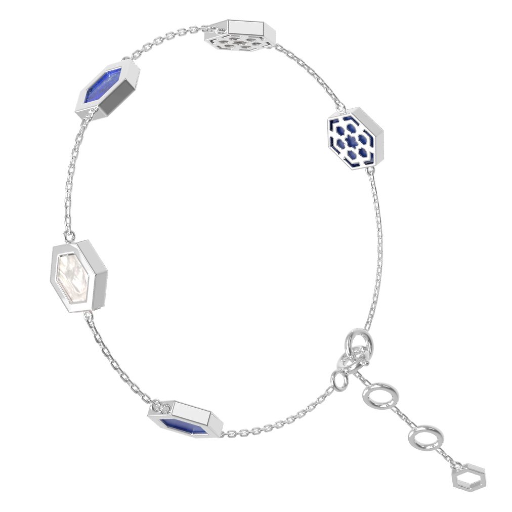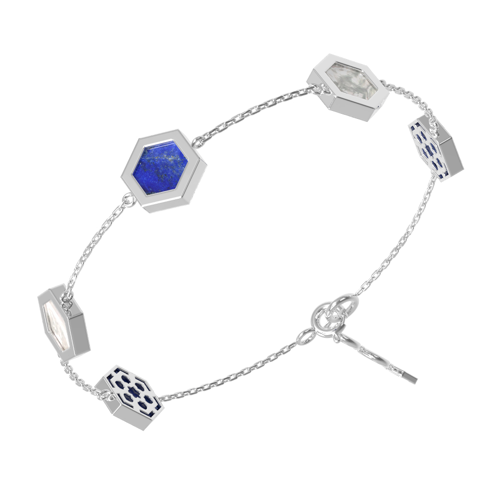 Элегантный браслет из белого золота 585 пробы из коллекции De Luxe — Молекула — это воплощение современной геометрии и утонченного стиля. Дизайн украшения, вдохновленный структурой молекулы, превращает аксессуар в концептуальное произведение ювелирного искусства. Центральными элементами композиции выступают 3 вставки правильной шестигранной формы, которые гармонично сочетают в себе глубокий синий лазурит и нежное сияние перламутра.