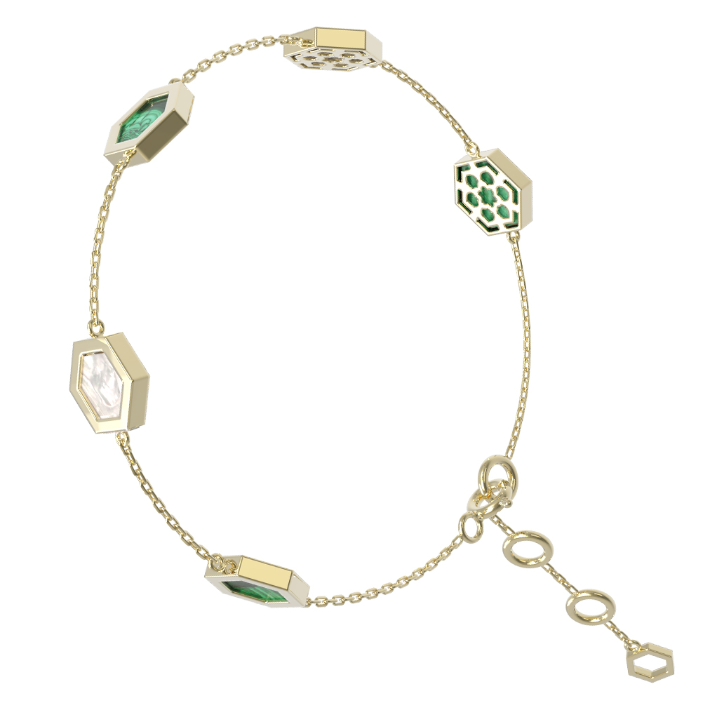Откройте для себя гармонию геометрии и благородных материалов с этим уникальным браслетом из коллекции De Luxe — Молекула. Украшение выполнено из лимонного золота 585 пробы, которое подчеркивает изысканность дизайна в стиле «Молекула». Визуальный акцент изделия строится на контрасте: три вставки в форме шестигранника из природного малахита глубокого зеленого цвета и нежного перламутра создают динамичную и современную композицию.