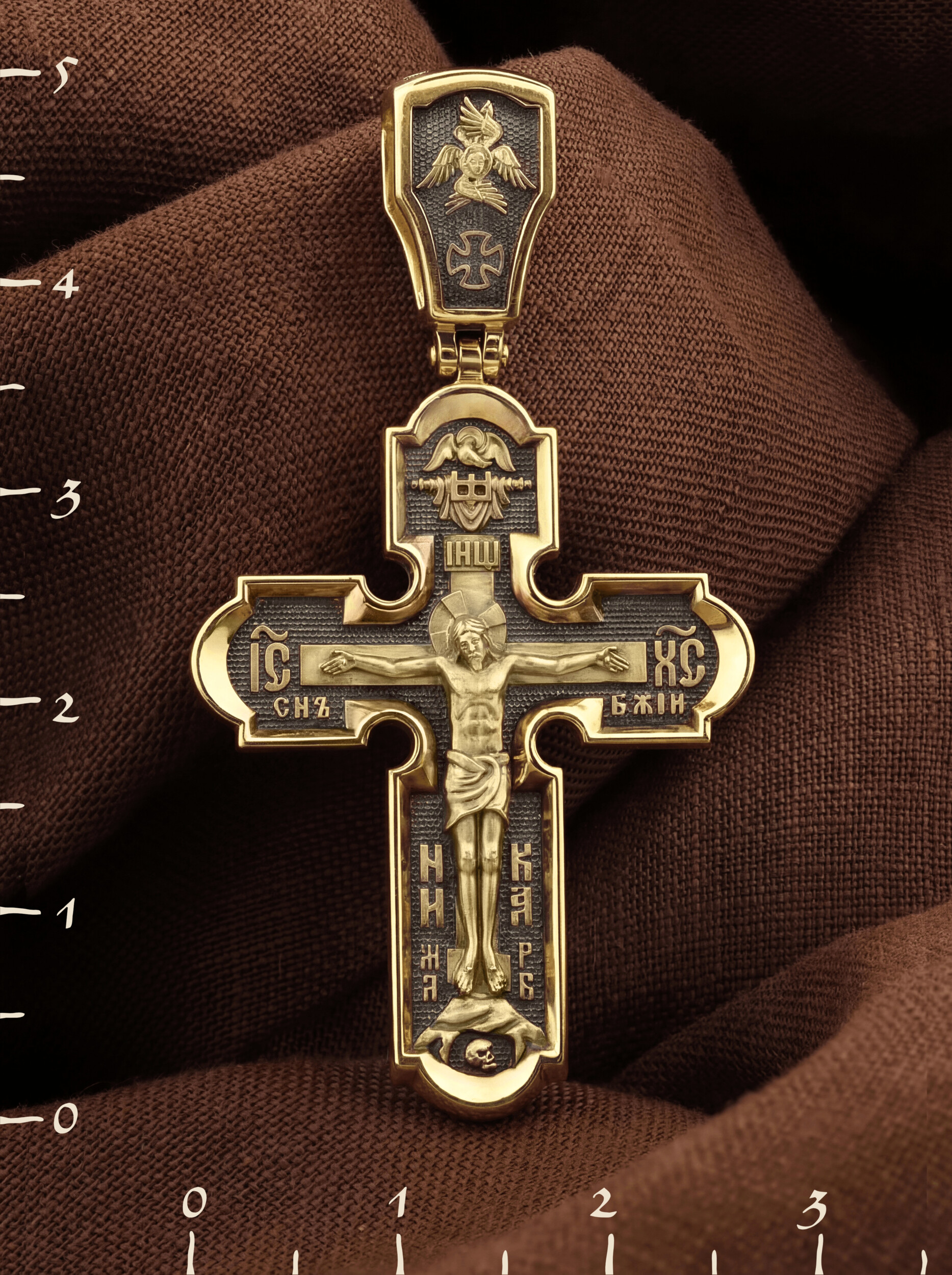 На лицевой стороне креста изображено Распятие Господа и Спасителя нашего Иисуса Христа. Христос, подвергнутый на кресте мучительной казни, своими страданиями искупил нас от древнего греха и даровал нам жизнь вечную. Без Распятия не было бы Воскресения Христова, и поэтому Крест из орудия казни обратился в святыню, в которой действует Благодать Божия. Над Распятием изображен Дух Святой в виде голубя, сходящего с Небес. Распятие сопровождается каноническими надписями. На верхней табличке, выше головы Иисуса, расположена надпись, составленная Понтием Пилатом на трех языках — «IНЦI». Она означает «Иисус Назорей, Царь Иудейский». Надпись «IС ХС» означает Иисус Христос и помещается на разных сторонах поперечной (большой) перекладины креста. Ниже — словосочетание «СЫН БОЖИЙ», что означает божественную природу Иисуса Христа. Крест стоит на горе камней, символизирующих Голгофу. В ее основании различается череп — это голова Адама. Надписи «Ника», что означает Победитель, и надпись «МЛРБ» — «место лобное рай бысть», что означает место лобное стало раем, размещены в нижней части креста. На кулонном кольце изображен шестикрылый Серафим.