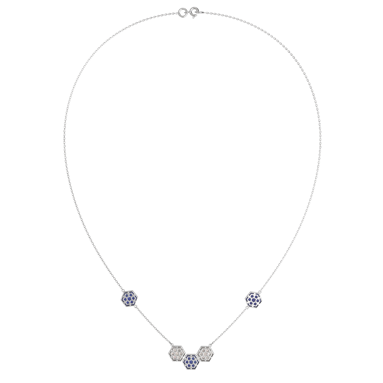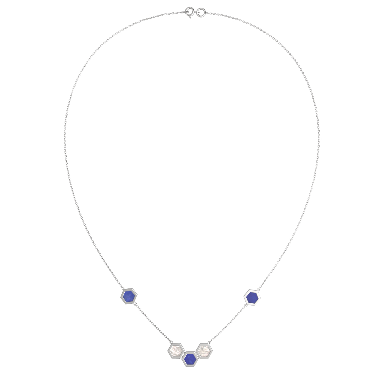 Колье из белого золота 585 пробы из коллекции De Luxe — Молекула воплощает собой оригинальный взгляд на современную ювелирную эстетику. Дизайн украшения вдохновлен структурой молекулы, где центральным элементом выступает геометрически выверенная форма шестигранника. Лаконичная, но выразительная композиция дополнена девятью вставками, гармонично сочетающими глубокий синий цвет лазурита и нежное сияние перламутра.
