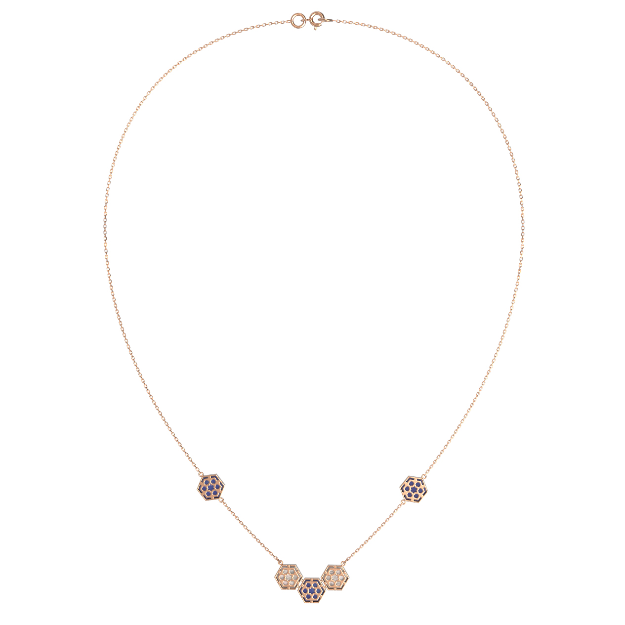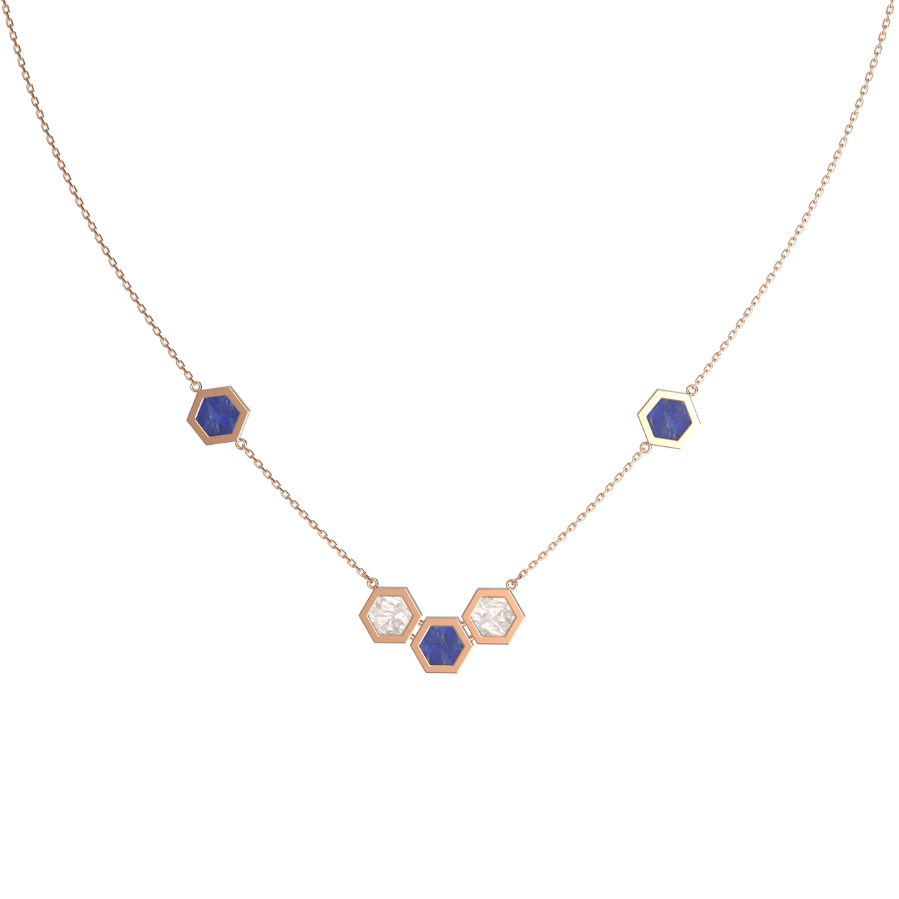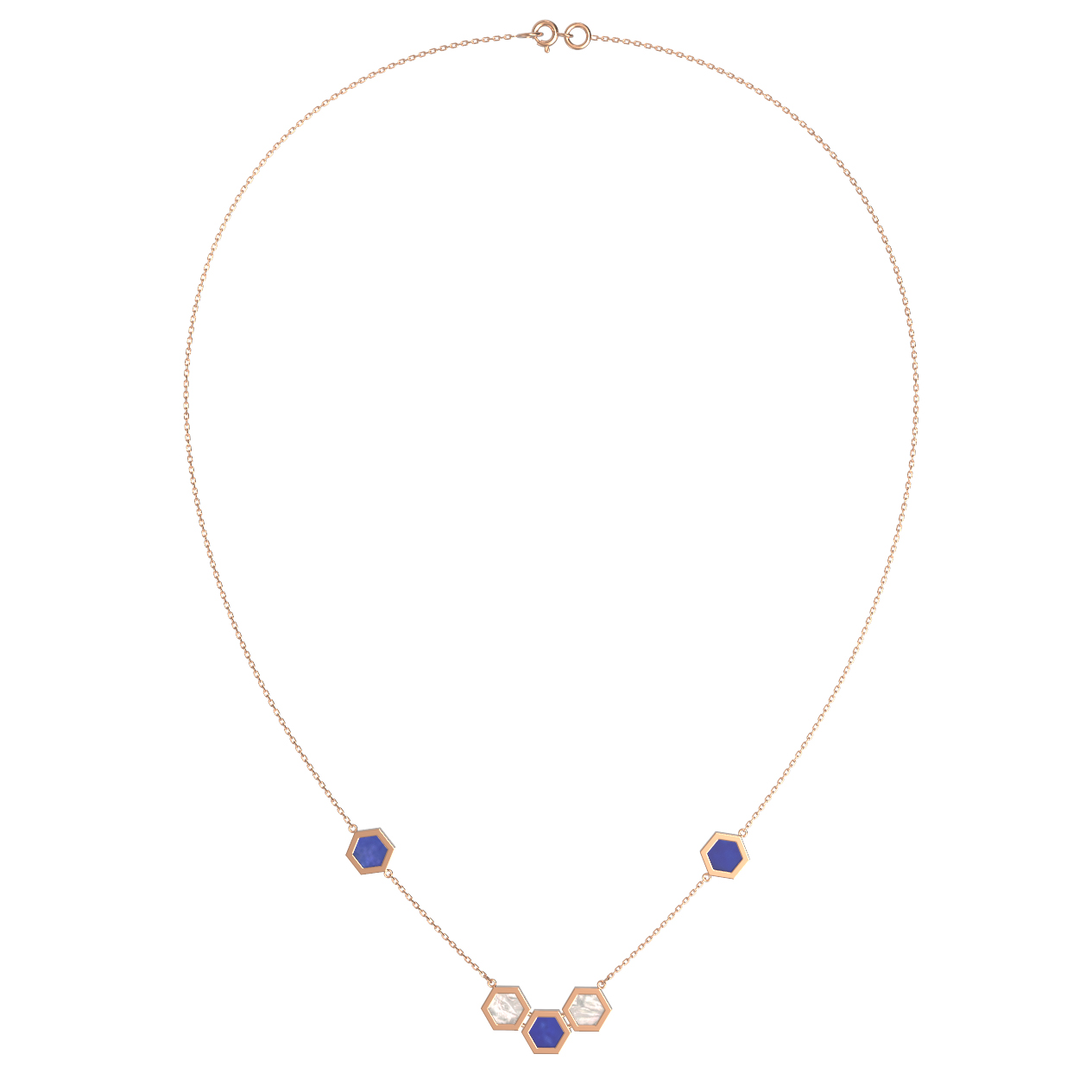 Изысканное колье из красного золота 585 пробы станет утонченным дополнением вашего образа. Это изделие, представленное в рамках коллекции De Luxe — Молекула, отличается продуманным дизайном в стиле молекула, который придает украшению современный и лаконичный вид. Центральным элементом ювелирного изделия выступают девять вставок, выполненных в форме шестигранника, гармонично расположенных на тонкой цепочке. Глубокий синий цвет лазурита эффектно контрастирует с нежным переливом перламутра, создавая притягательный визуальный акцент.