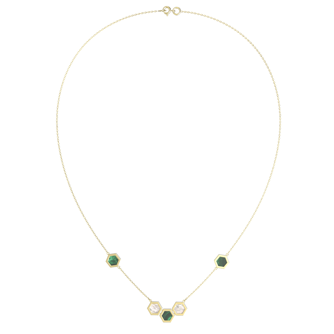 В отделке гармонично сочетаются насыщенный зеленый малахит и нежный перламутр. Контраст между природными текстурами создает уникальную игру цвета и света, привлекая внимание к зоне декольте. Лимонное золото подчеркивает благородство камней, делая украшение выразительным и запоминающимся. Колье выполнено в стиле унисекс, поэтому гармонично дополнит образ как женщины, так и мужчины, ценящих нестандартные ювелирные решения.