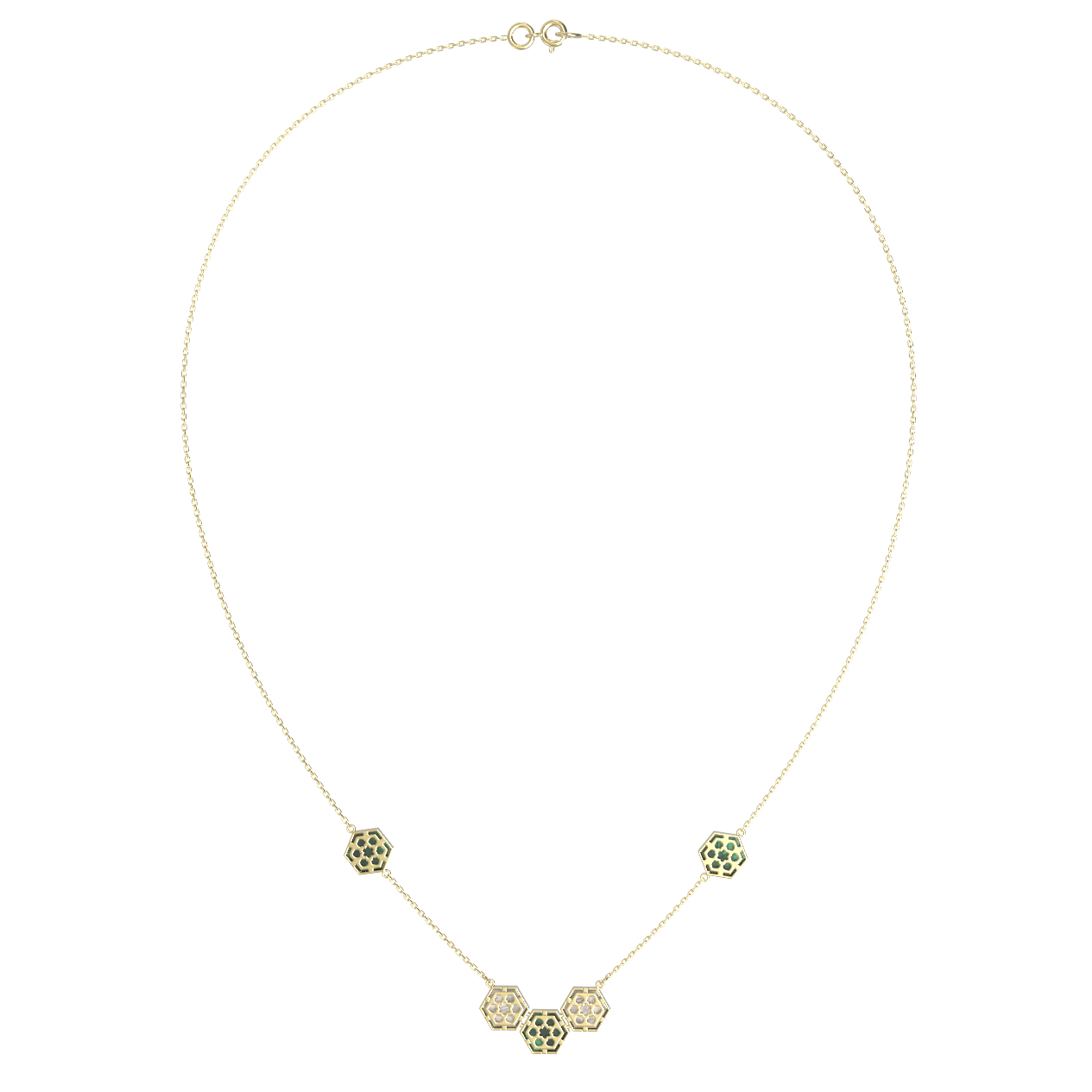 Элегантное колье из лимонного золота 585 пробы станет утонченным акцентом в вашем гардеробе. Украшение входит в серию De Luxe — Молекула, дизайн которой вдохновлен природной гармонией и научными формами. Центральным элементом композиции является стильная интерпретация молекулы, воплощенная в четких геометрических линиях. Ювелирное изделие инкрустировано девятью вставками в форме шестигранников, что придает ему особенный, футуристический облик.