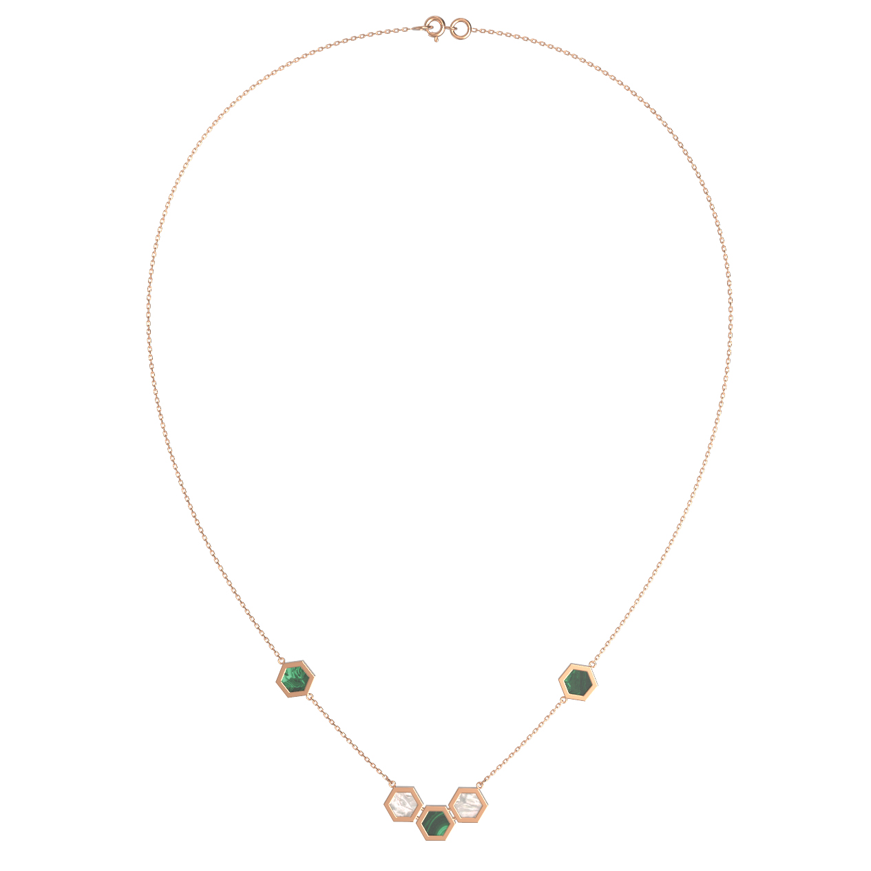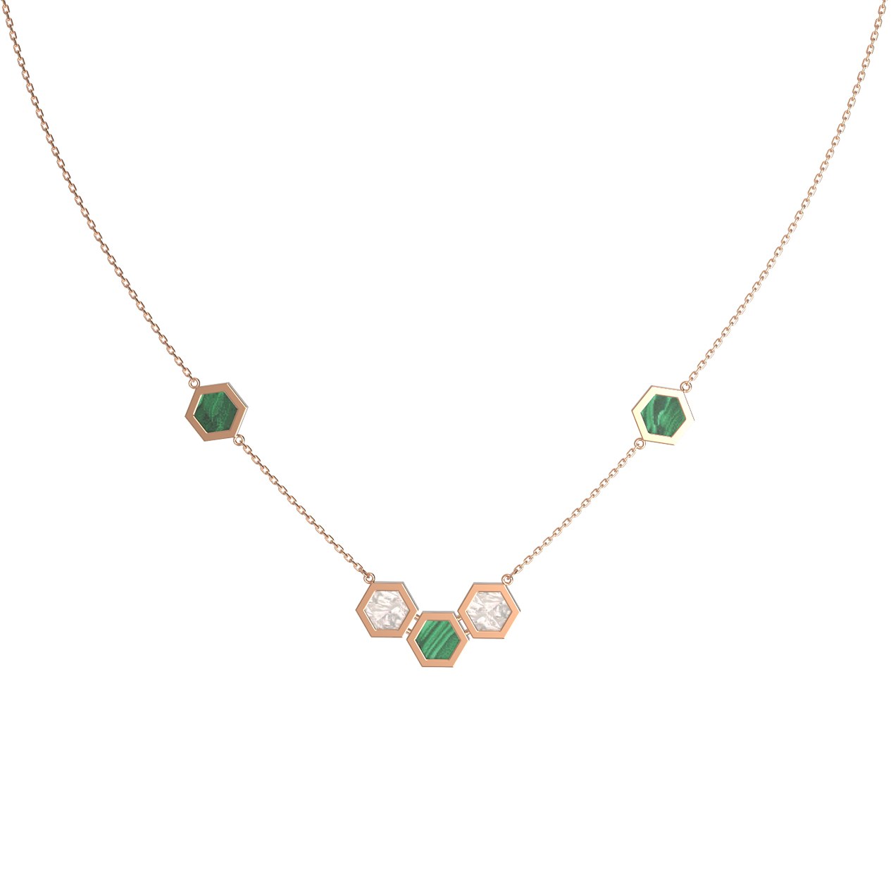 Элегантное колье из красного золота 585 пробы — это воплощение современной геометрии и благородной эстетики. Дизайн украшения, вдохновленный структурой молекулы, строится на сочетании лаконичных линий и девяти вставок в форме шестигранника. Глубокий, насыщенный зелёный цвет малахита гармонично переплетается с мягким, переливчатым сиянием перламутра, создавая уникальный визуальный контраст. Это украшение станет изысканным акцентом вашего образа, подчеркивая индивидуальность и тонкий вкус.
