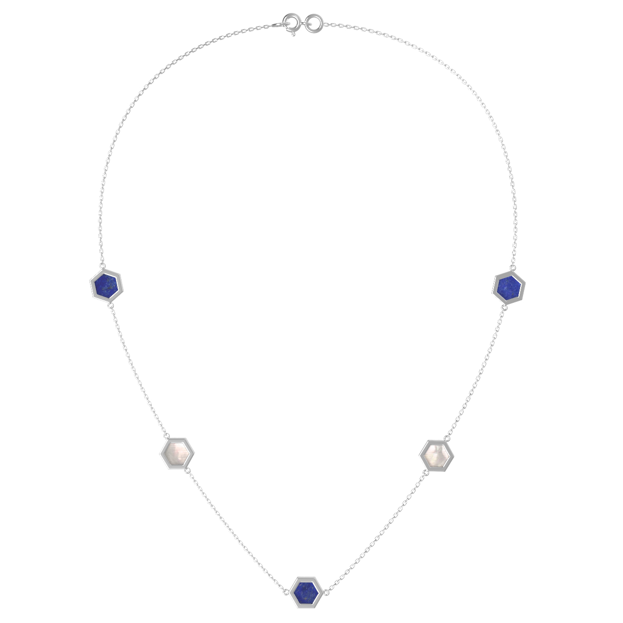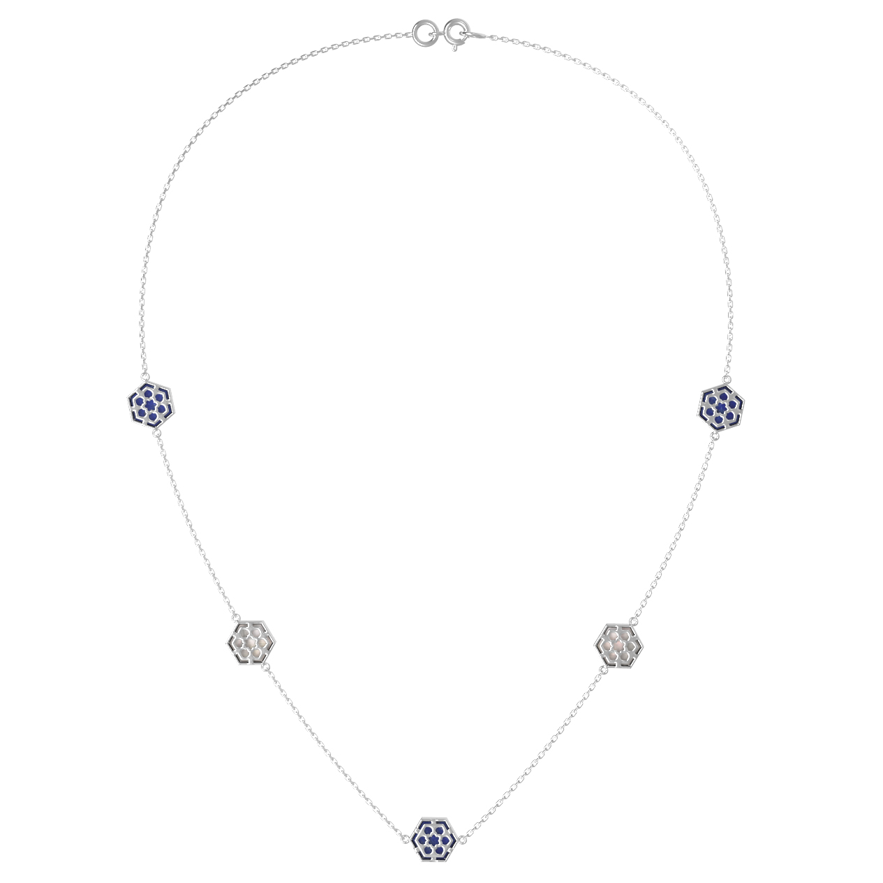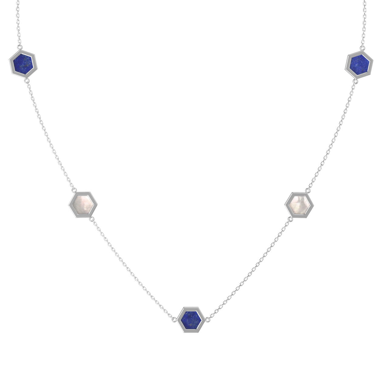 Основным акцентом дизайна выступают вставки из натурального лазурита синего цвета и нежного перламутра. Контраст глубокого синего оттенка лазурита и мягкого перламутрового сияния придает колье особую выразительность и глубину. Белый цвет металла идеально подчеркивает чистоту линий и благородство камней.