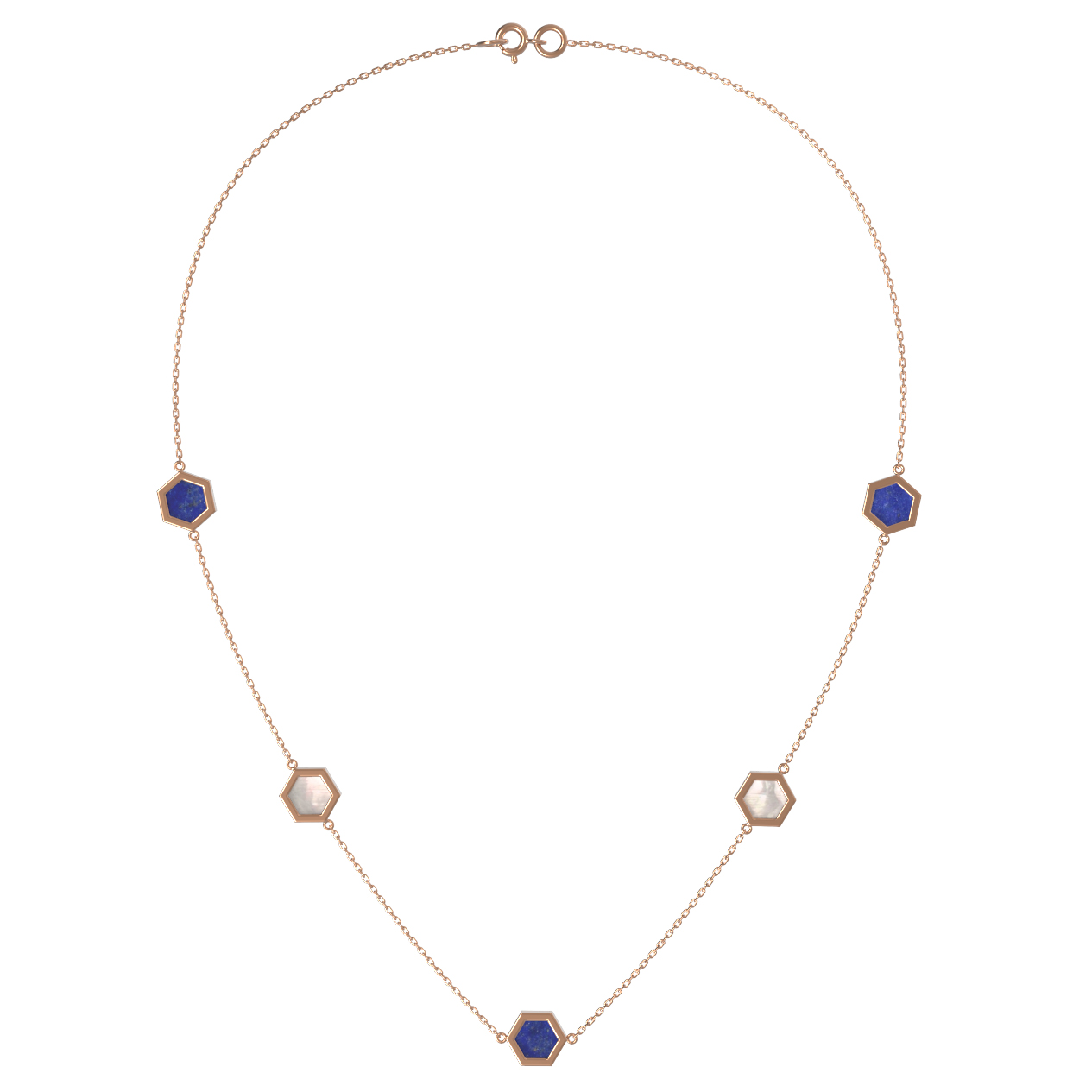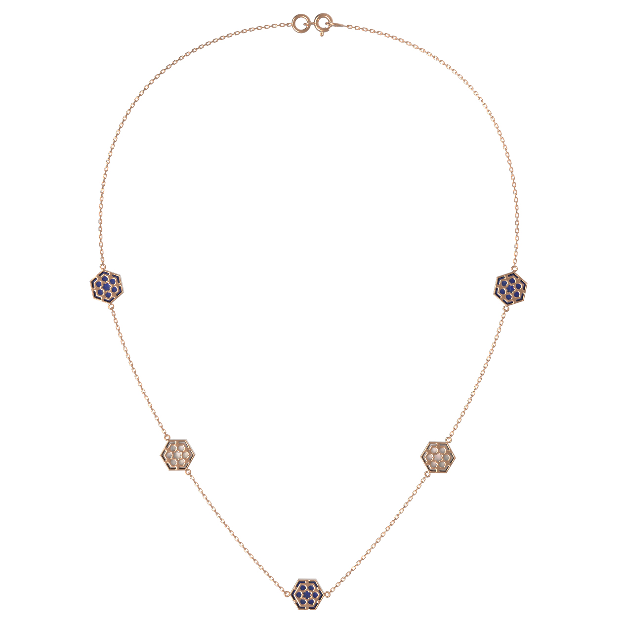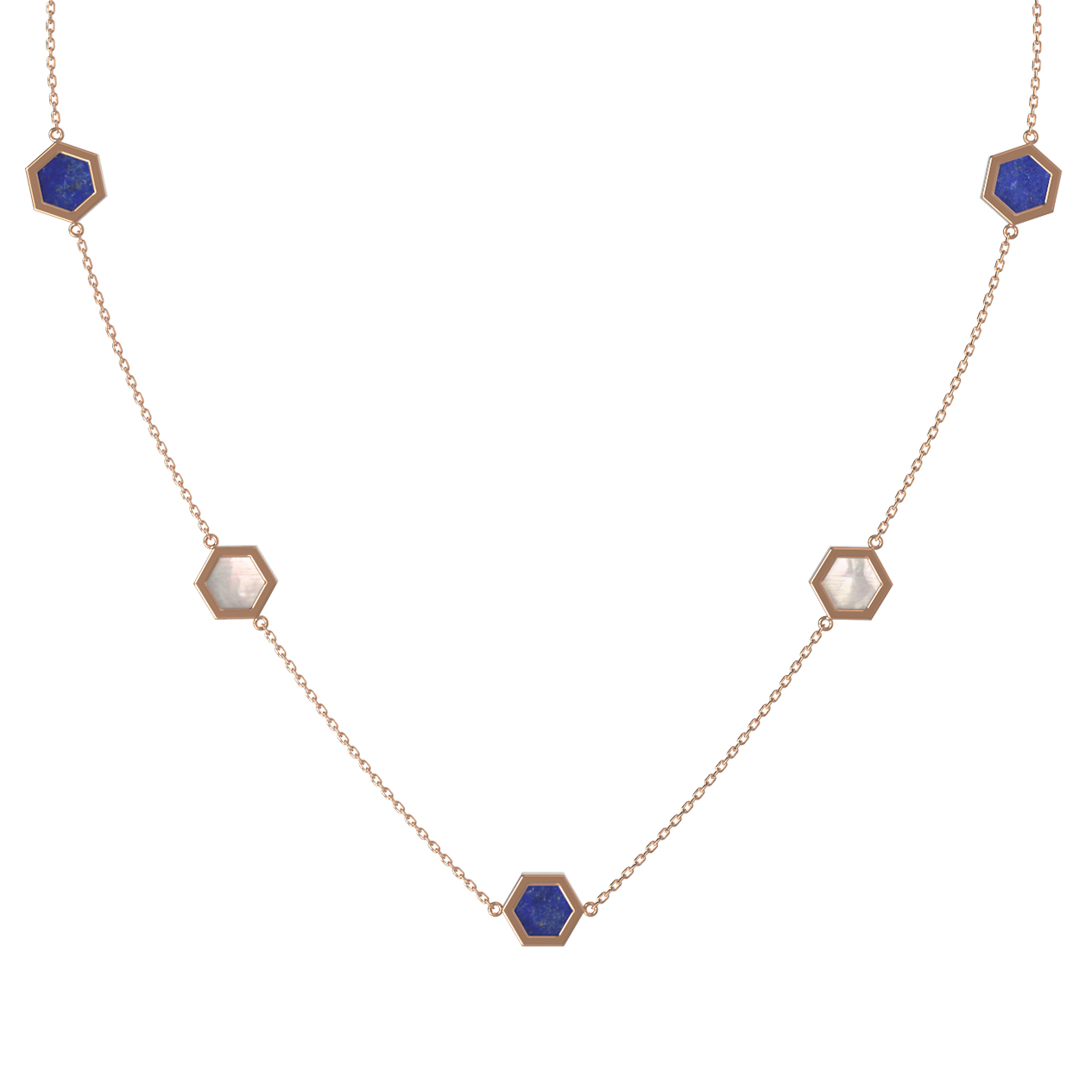 Элегантное колье из красного золота 585 пробы станет центральным акцентом вашего образа, подчеркивая индивидуальность и тонкий вкус. Украшение из коллекции De Luxe — Молекула выполнено в концептуальном дизайне «Молекула», который придает изделию современный и динамичный вид. Ювелиры использовали строгую геометрическую форму — шестигранник, для оформления девяти вставок из натурального лазурита и перламутра. Глубокий синий цвет лазурита гармонично контрастирует с нежным переливом перламутра, создавая эффектный визуальный баланс.