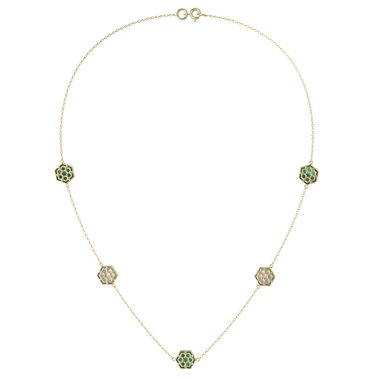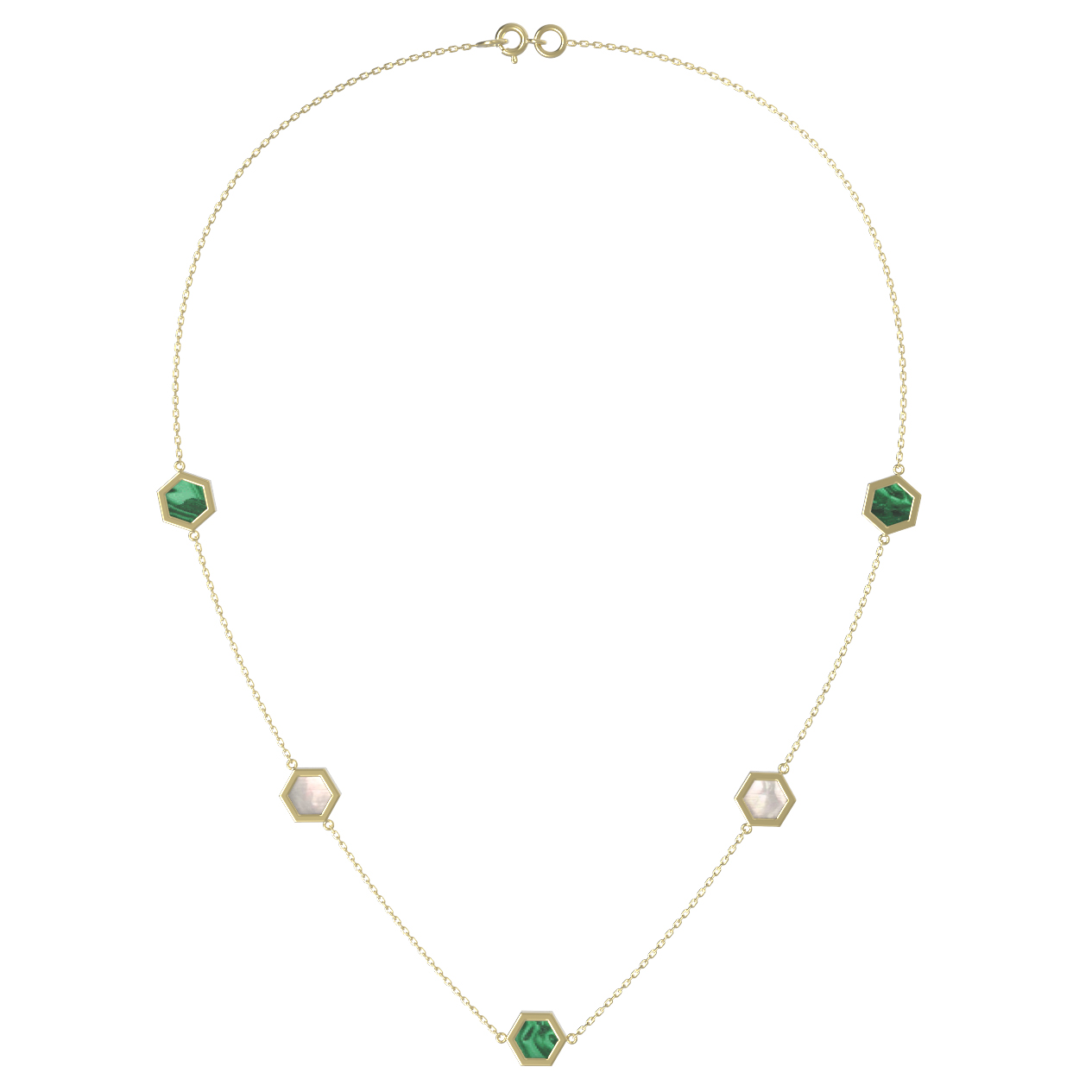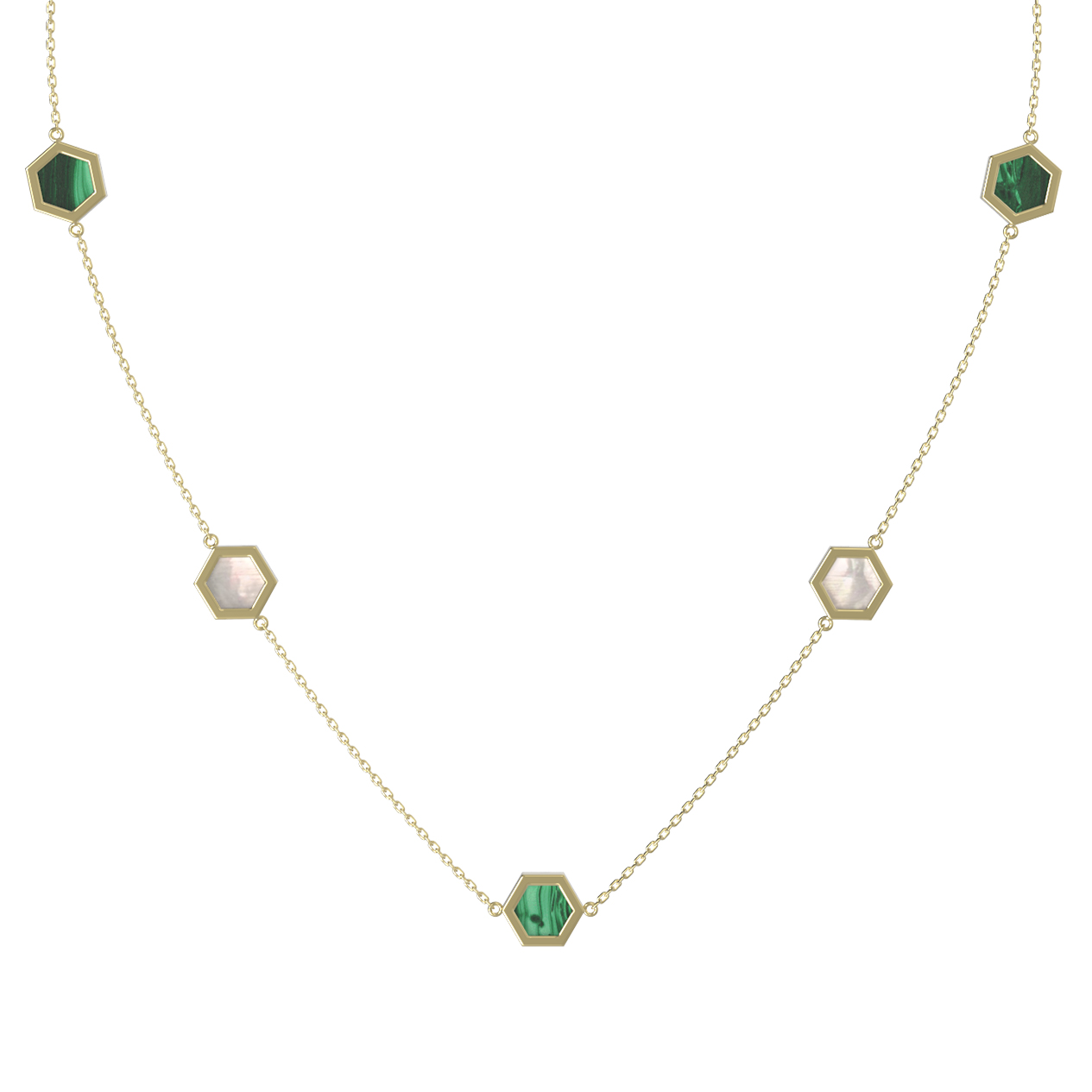 В центре внимания — 9 вставок в форме шестигранника, которые гармонично распределены по тонкой цепочке. Глубокий, насыщенный зеленый цвет малахита сочетается с нежным перламутром, создавая изысканный контраст и природную эстетику. Такое необычное сочетание материалов делает колье универсальным украшением для женщин и мужчин, ценящих оригинальные дизайнерские решения.