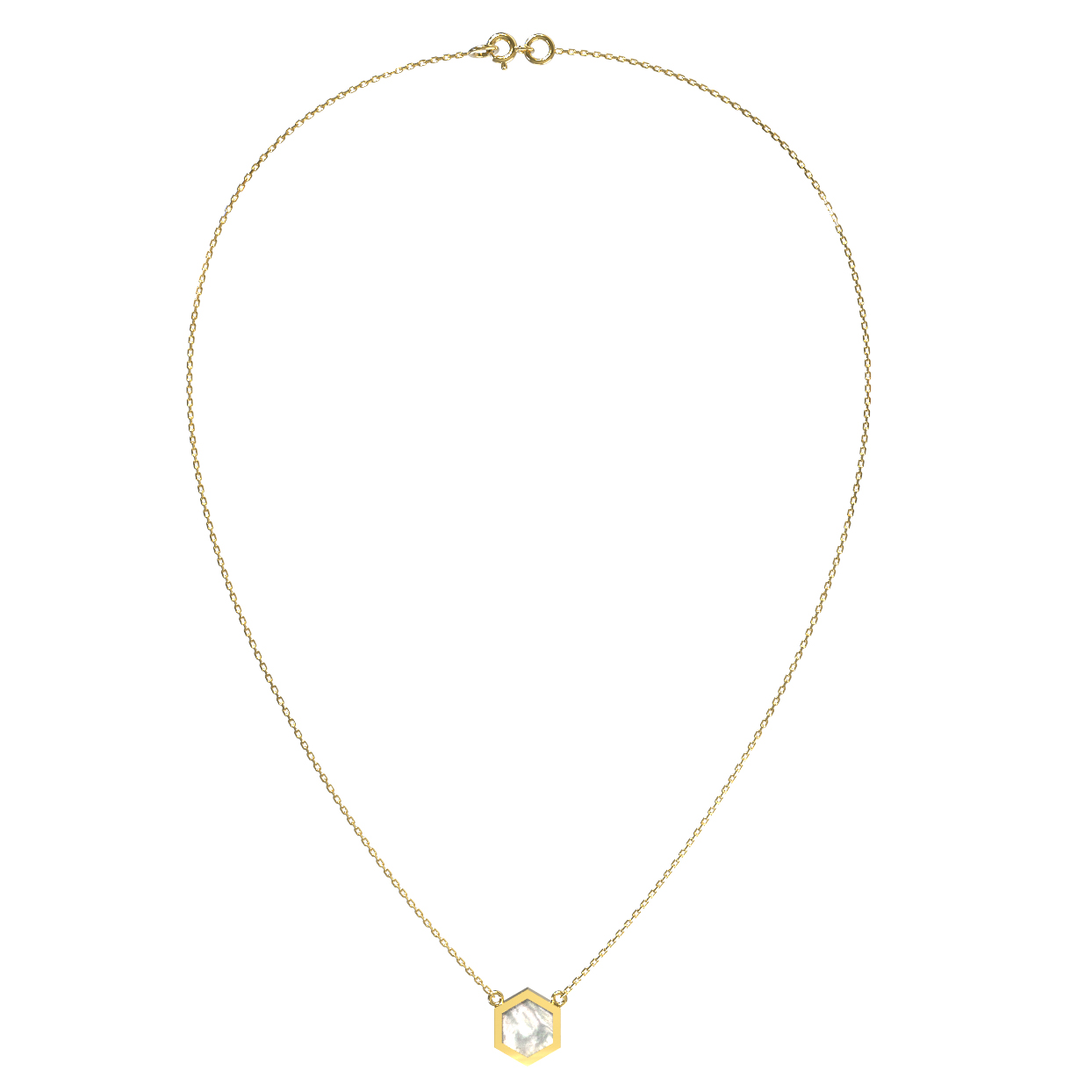 Элегантное колье из лимонного золота 585 пробы станет утонченным акцентом вашего образа. Дизайн украшения, вдохновленный концепцией молекулы, воплощает в себе гармонию строгих геометрических форм и природной мягкости. Центральным элементом ювелирного изделия выступает вставка из перламутра, выполненная в форме шестигранника. Нежное сияние перламутра идеально сочетается с теплым оттенком лимонного золота, создавая сбалансированную и притягательную композицию.