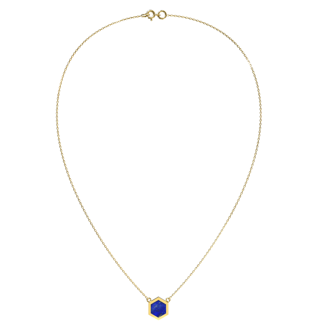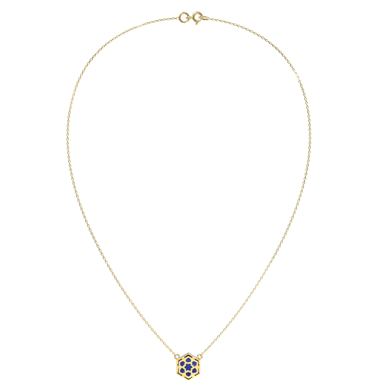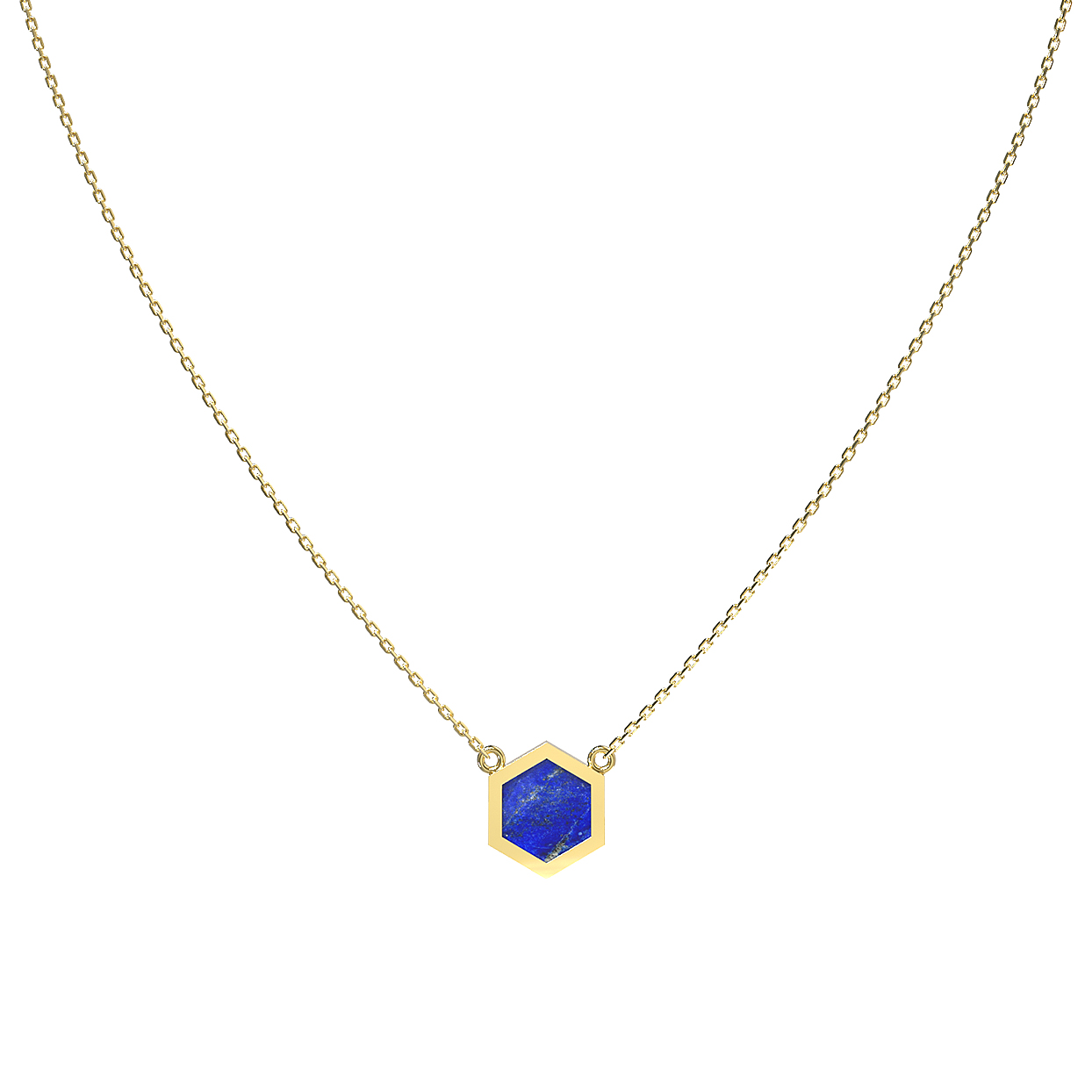 Каждая вставка выполнена в строгой форме шестигранник, что создает акцент на четких линиях и безупречной симметрии. Лимонный оттенок золота гармонично сочетается с глубоким синим тоном камня, формируя элегантное и статусное украшение. Это колье — универсальный аксессуар, который подойдет как для женщин, так и для мужчин, добавляя образу утонченности и интеллектуального шарма.