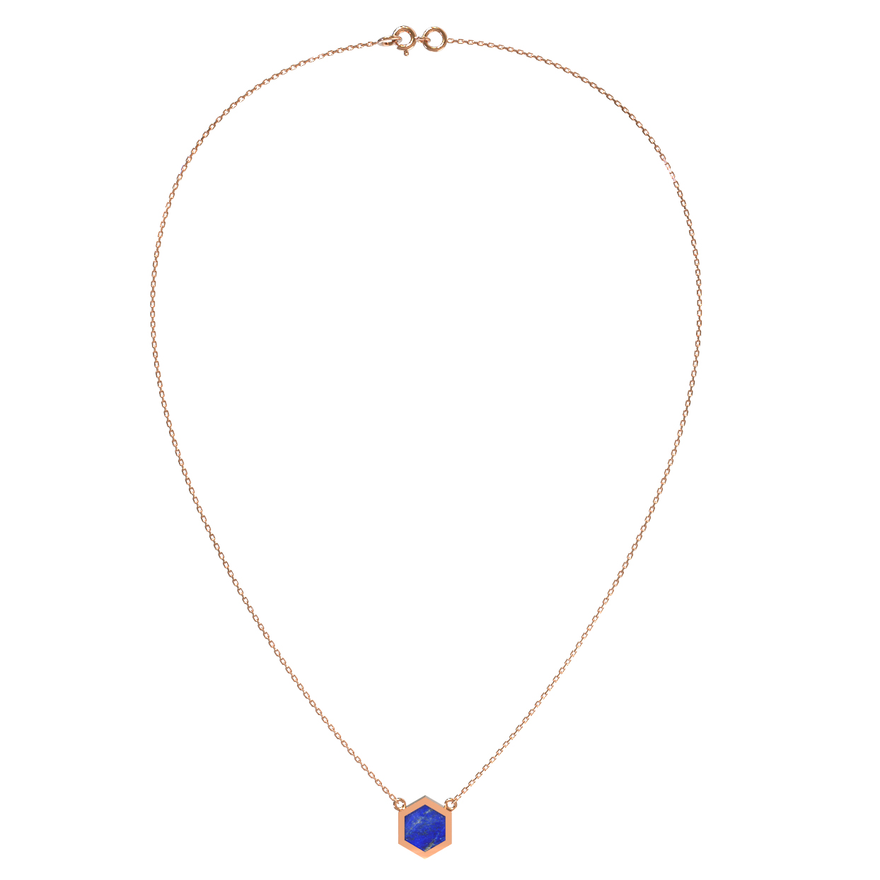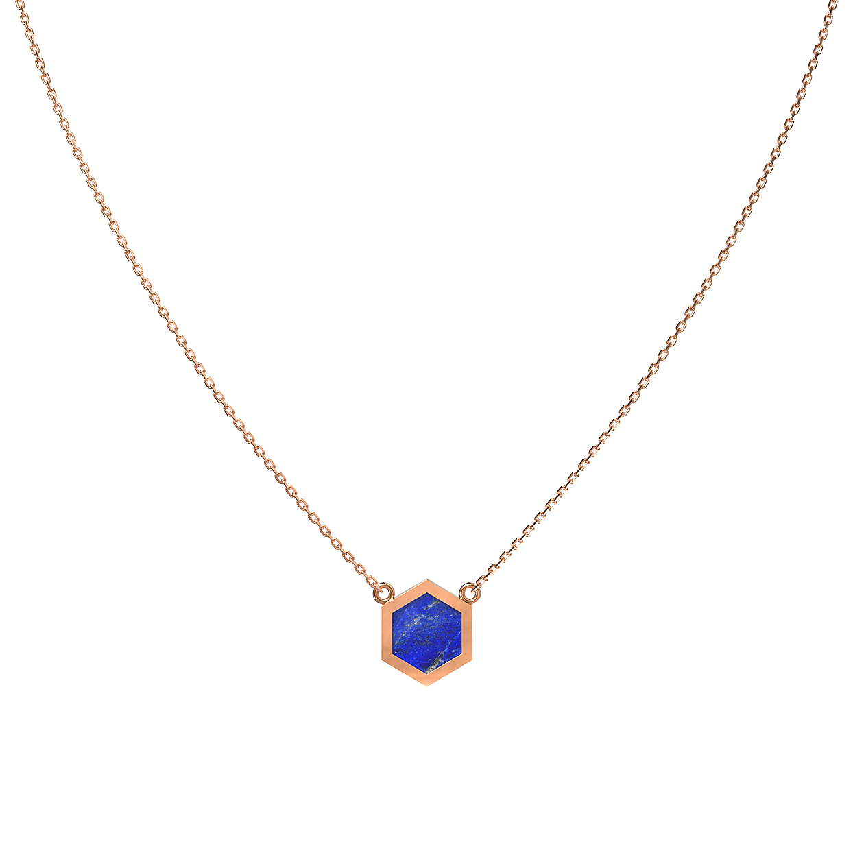 Изысканное колье из красного золота 585 пробы станет утонченным дополнением вашего образа. Украшение выполнено в оригинальном дизайне Молекула и привлекает внимание своей геометрической точностью. Центральным элементом изделия является вставка из натурального лазурита глубокого синего цвета. Форма вставки выполнена в виде правильного шестигранника, что придает колье современный и минималистичный характер.