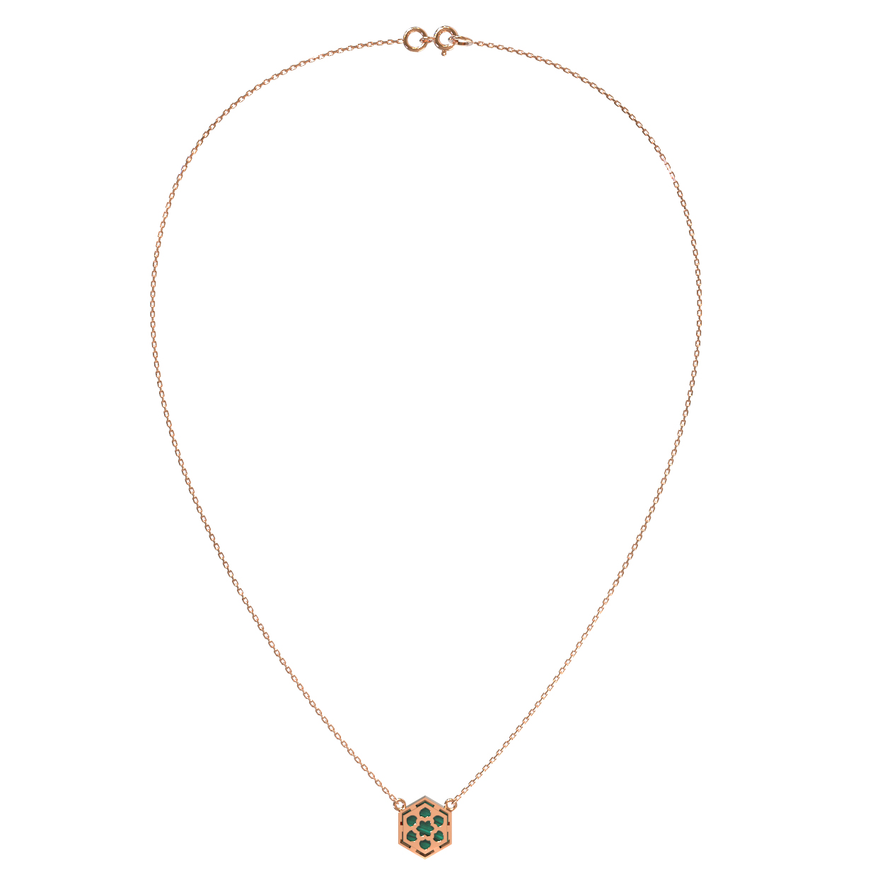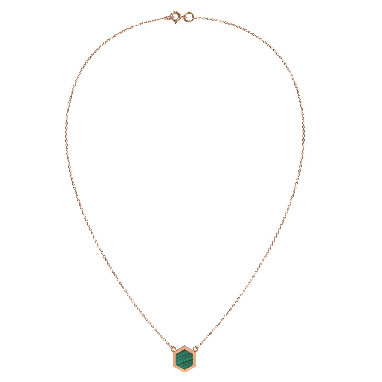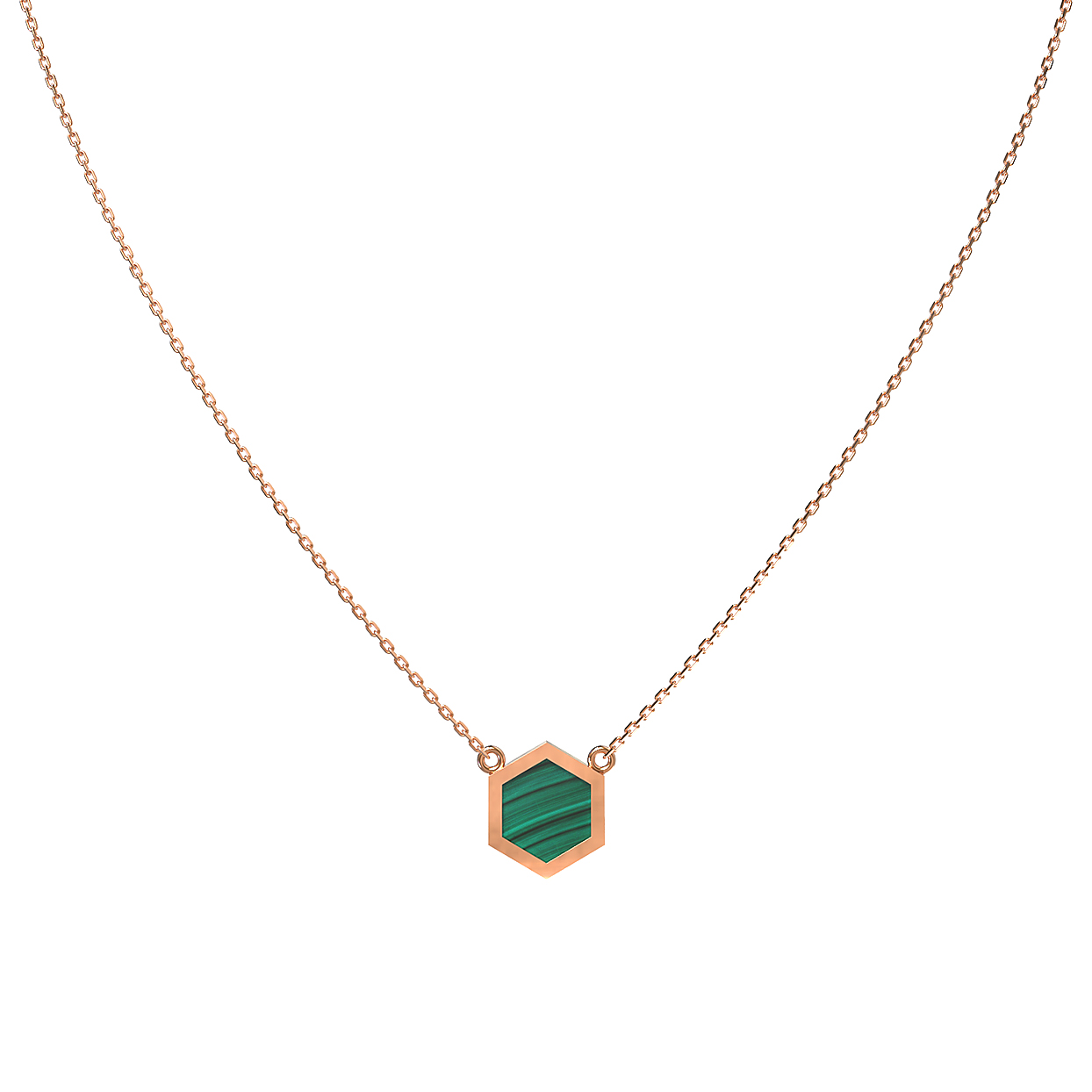 Колье из красного золота 585 пробы из коллекции De Luxe — Молекула — это воплощение лаконичного дизайна и эстетики строгих линий. Центральным элементом украшения выступает вставка из натурального малахита, обладающая глубоким зелёным цветом и уникальным природным рисунком. Форма вставки — шестигранник, которая подчеркивает концепцию молекулярного строения, заложенную в основу этой линейки изделий.