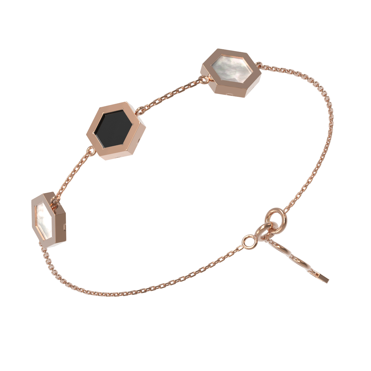 Выбирая браслет из красного золота с ониксом и перламутром, вы отдаете предпочтение украшению с уникальной геометрической эстетикой. Лаконичный дизайн-молекула идеально вписывается в современный гардероб, добавляя нотку статусности и утонченности. Это изделие создано для тех, кто ценит эстетику минимализма и высокое качество ювелирного мастерства.
