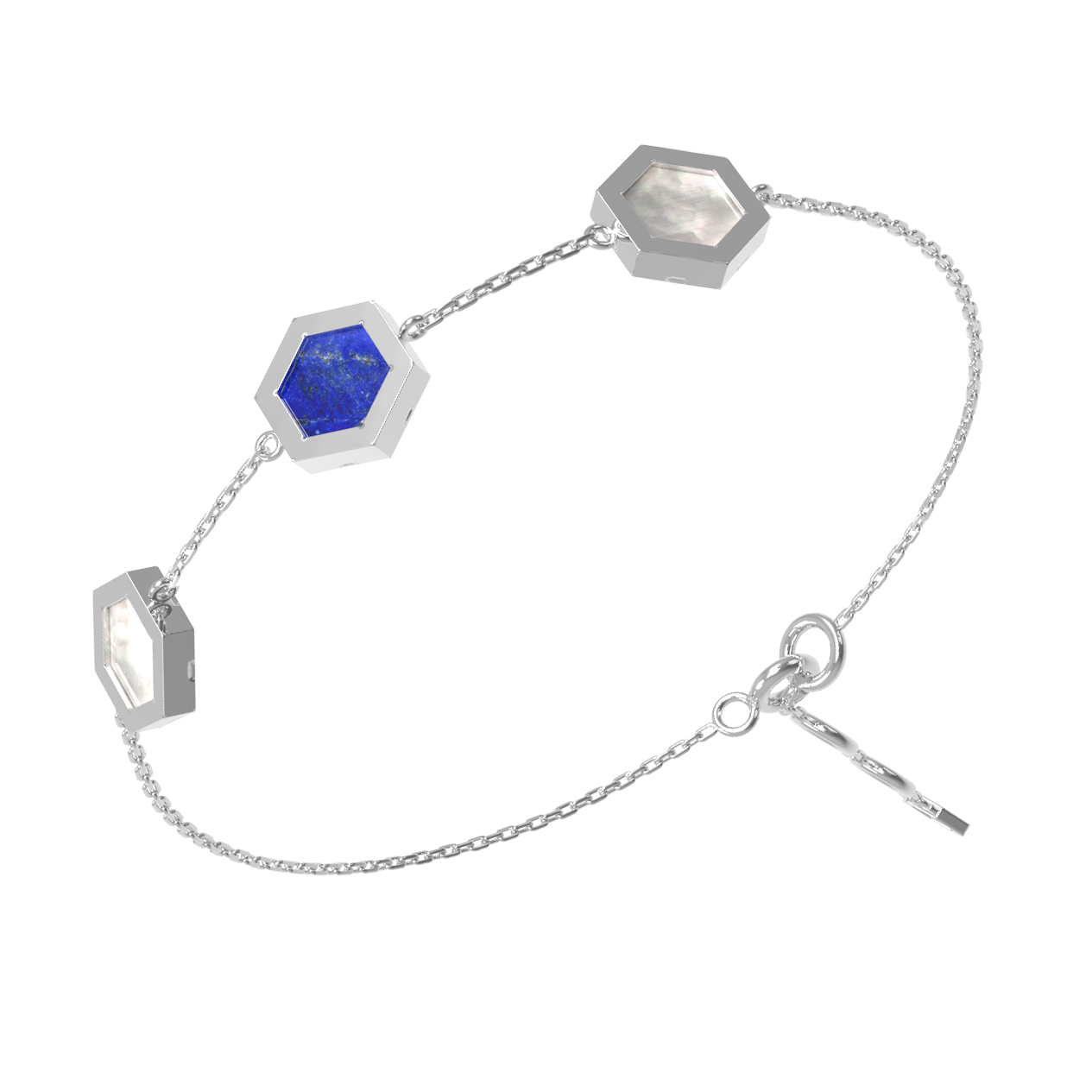 Браслет из серии De Luxe — Молекула станет достойным дополнением вашего повседневного или вечернего образа. Благодаря утонченному плетению цепочки изделие комфортно ощущается на руке, а надежная застежка обеспечивает уверенность при ношении. Данная модель также может стать частью комплекта, дополнив другие украшения из этой же линейки. Лазурит и перламутр в обрамлении белого золота — это классика, переосмысленная через призму современной эстетики. Выбирая такой аксессуар, вы делаете ставку на качество, лаконичный дизайн и сдержанную роскошь.