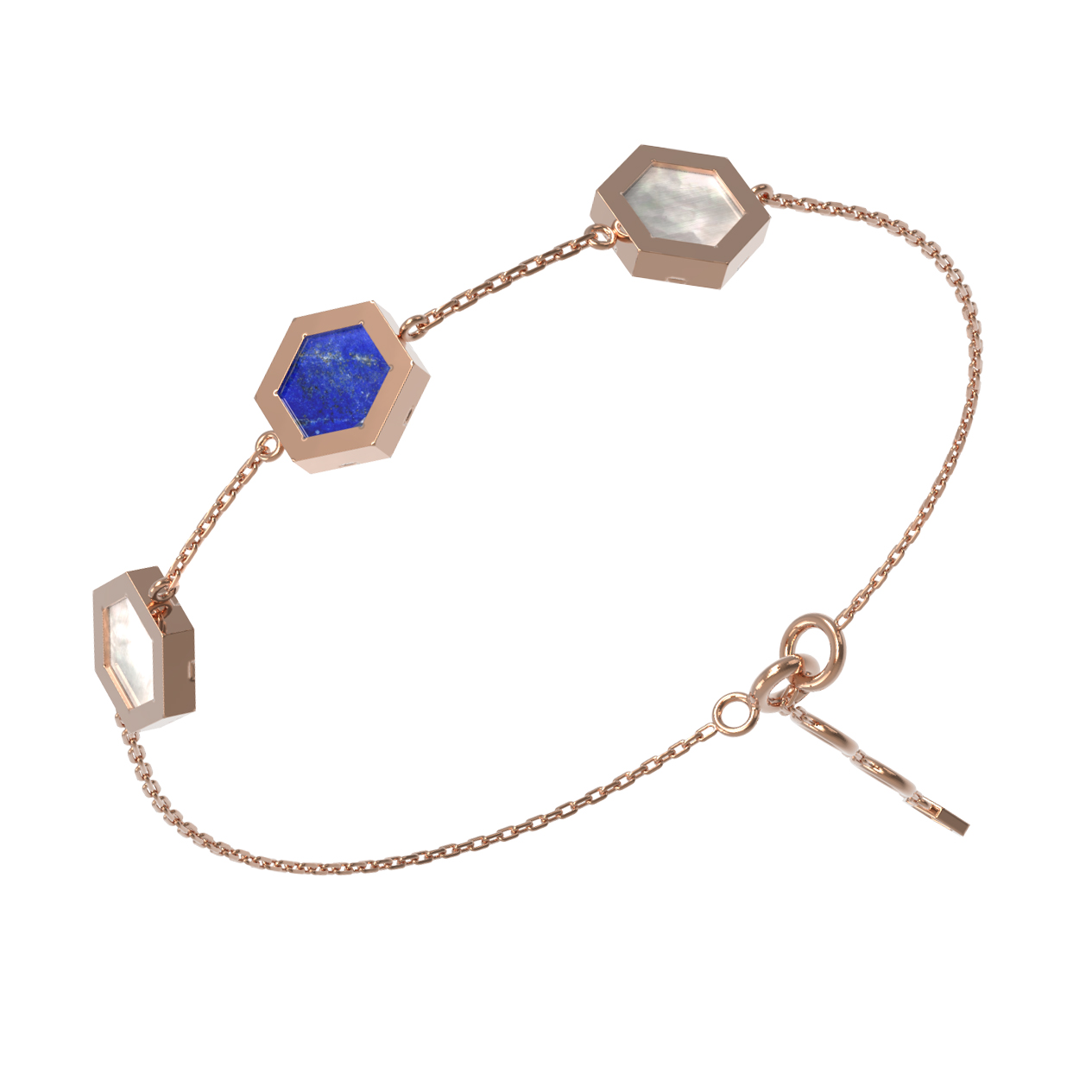 В центре композиции и по краям расположены вставки из натурального синего лазурита и нежного перламутра. Контраст между глубоким, насыщенным цветом лазурита и мягким сиянием перламутра создает гармоничное сочетание, которое эффектно смотрится на фоне красного золота. Дизайн изделия объединяет в себе строгую геометрию и природную красоту камней.