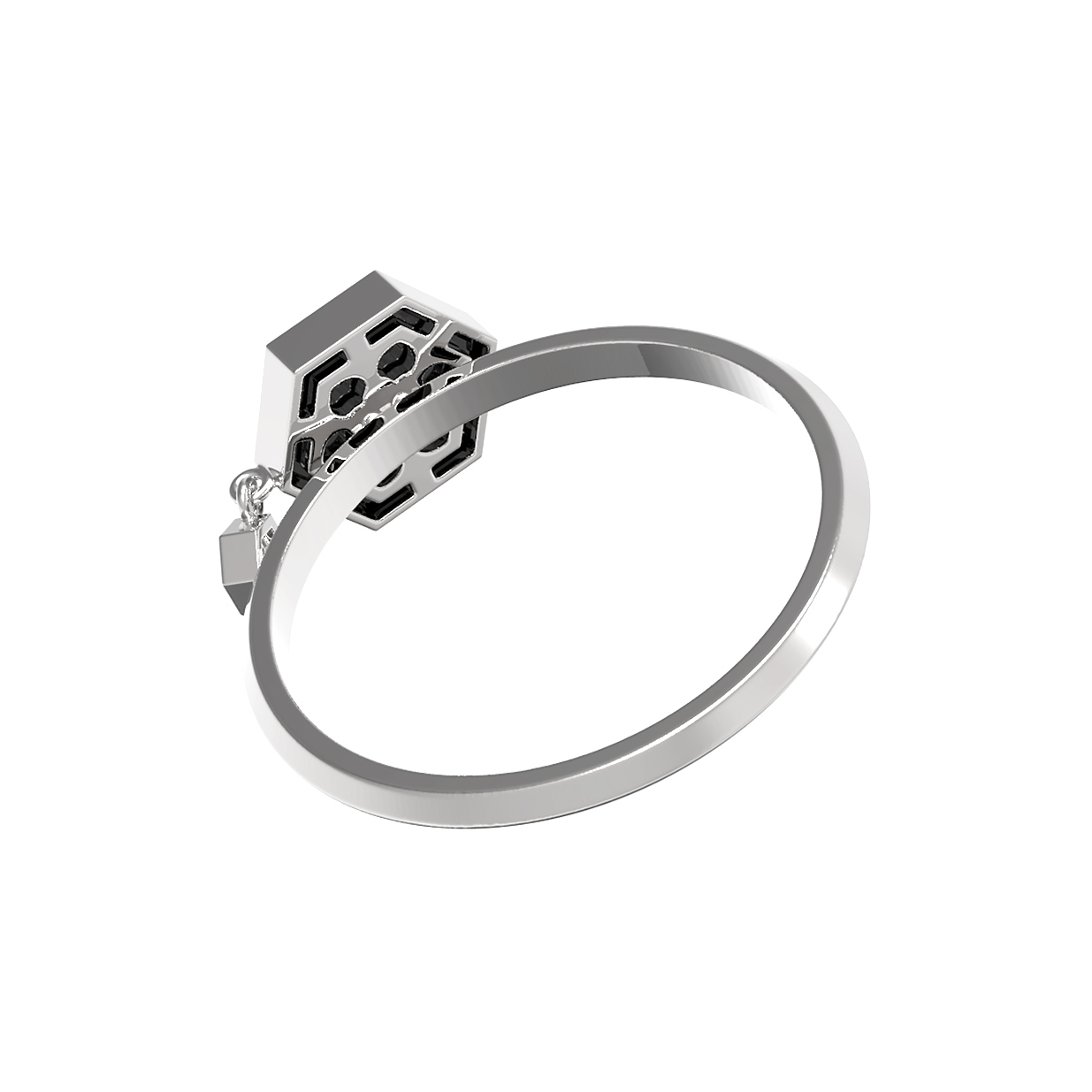 Элегантное кольцо из белого золота 585 пробы станет утонченным акцентом в вашем образе. Дизайн изделия, вдохновленный концепцией молекулы, воплощает в себе гармонию строгих геометрических форм и природной красоты драгоценных камней. В центре композиции расположен эффектный шестигранник с вставкой из глубокого черного оникса, который создает выразительный контраст с холодным блеском металла. Рядом, словно частица структуры, закреплен подвижный элемент с сияющим бриллиантом круглой формы, добавляющий украшению динамики и особого шарма.