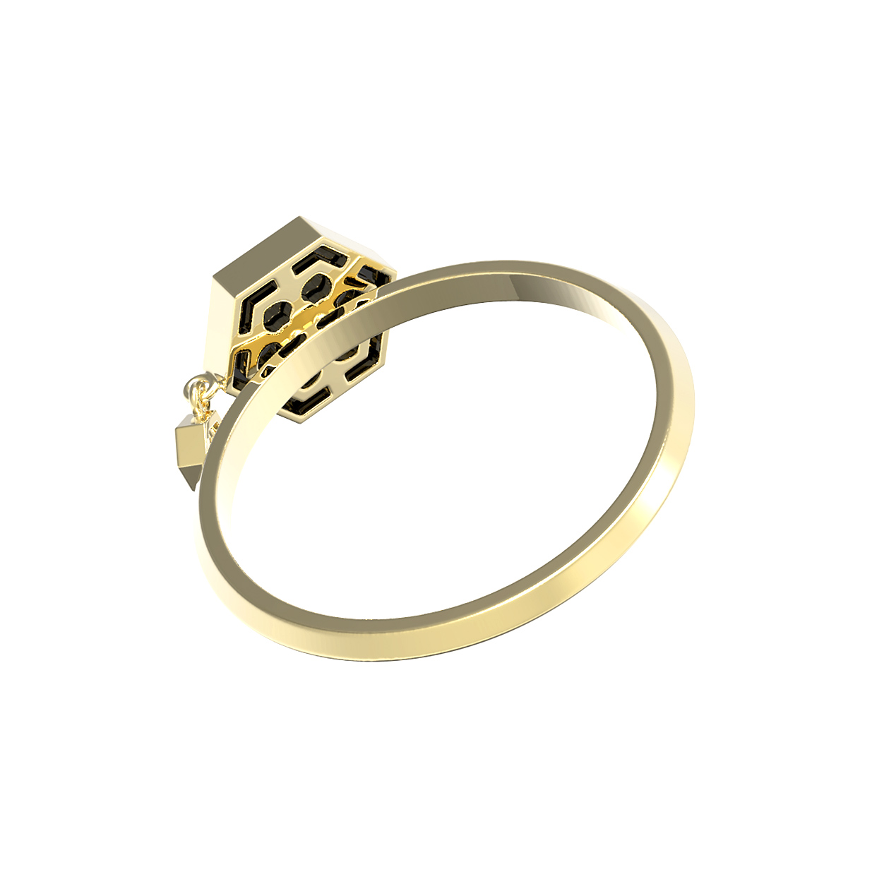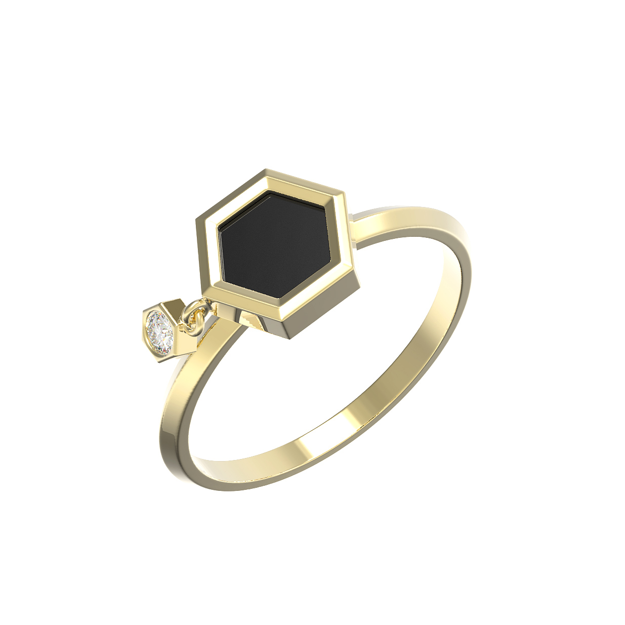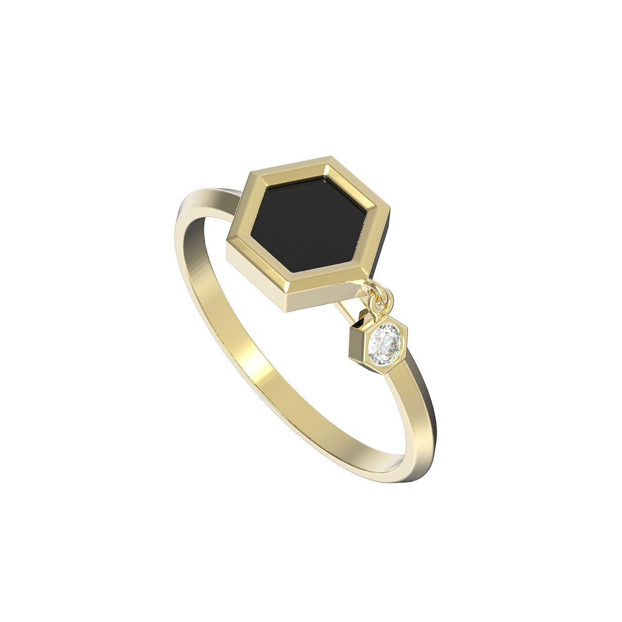 Центральным элементом композиции является оникс черного цвета в форме шестигранника, который придает кольцу глубину и выразительность. Дополняет дизайн изящный подвижный акцент — вставка в форме круга с сияющим бриллиантом белого цвета. Такое сочетание материалов и форм делает украшение универсальным: оно подойдет как для женщин, так и для мужчин, предпочитающих лаконичные, но содержательные аксессуары.