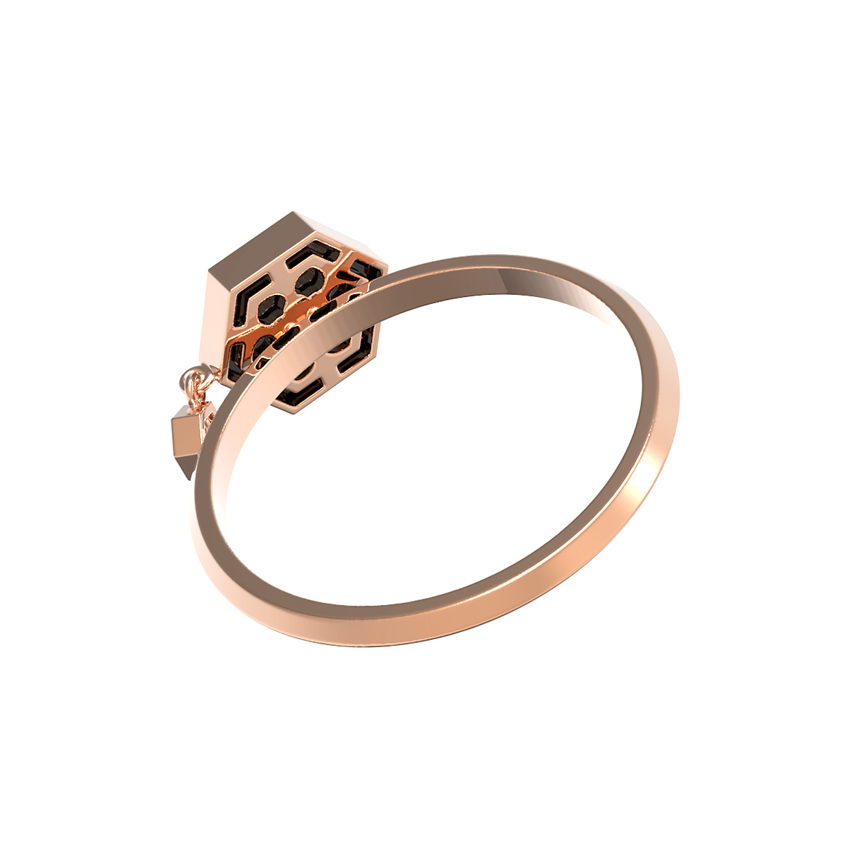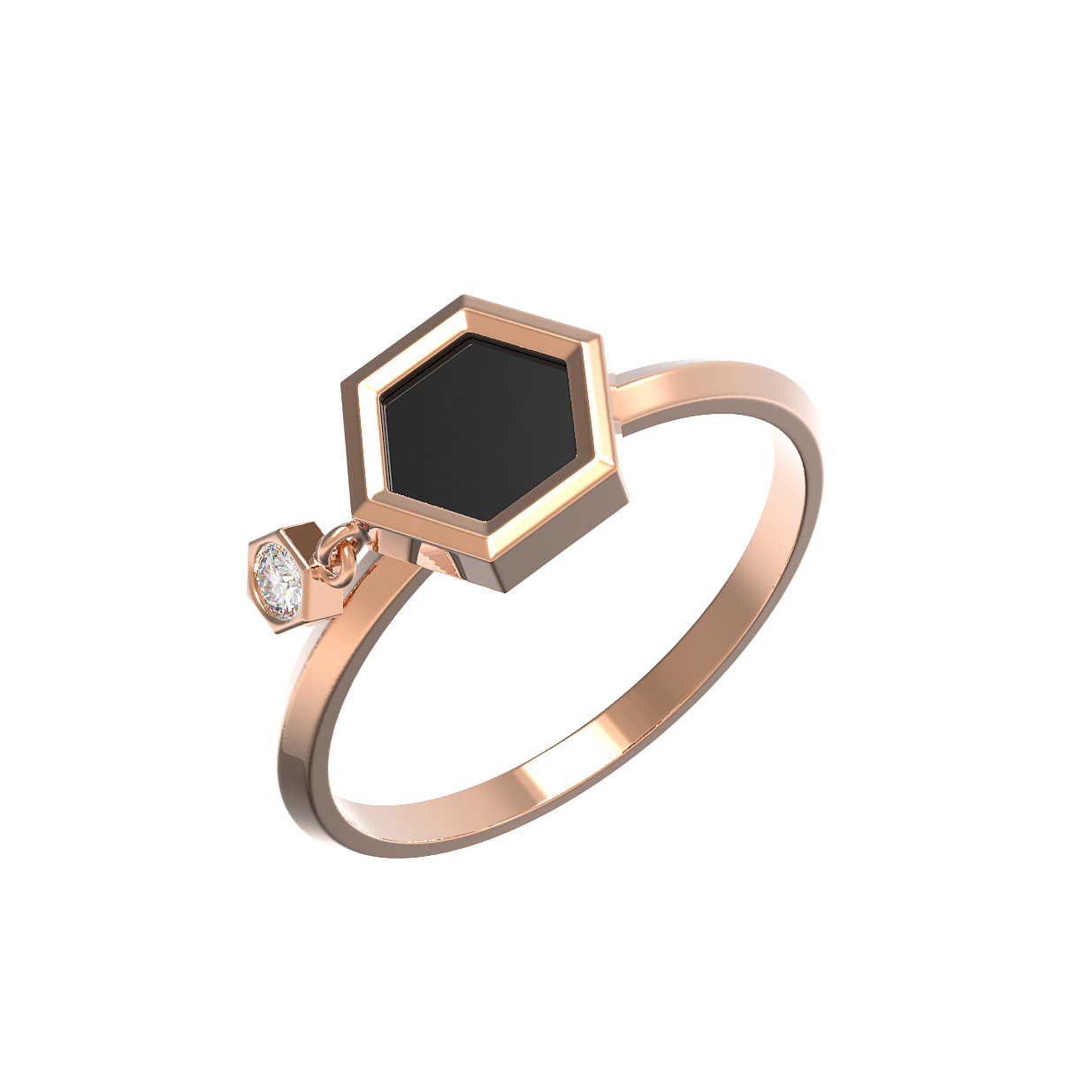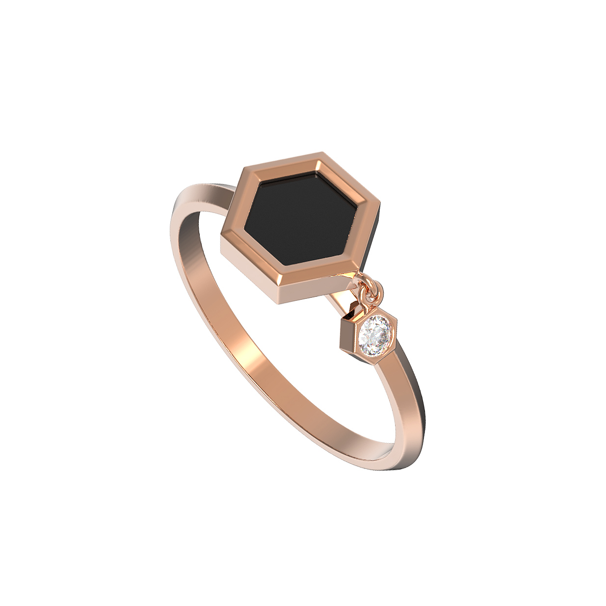 Элегантное кольцо из красного золота 585 пробы — это воплощение современной геометрии и утонченного стиля. Данное изделие из коллекции De Luxe — Молекула привлекает внимание своим необычным дизайном, вдохновленным структурой молекулы. Основным акцентом украшения является шестиугольная вставка из глубокого черного оникса, которая контрастирует с теплым блеском красного золота. Композицию гармонично дополняет изящный подвижный элемент в форме шестигранника с сияющим белым бриллиантом круглой огранки.