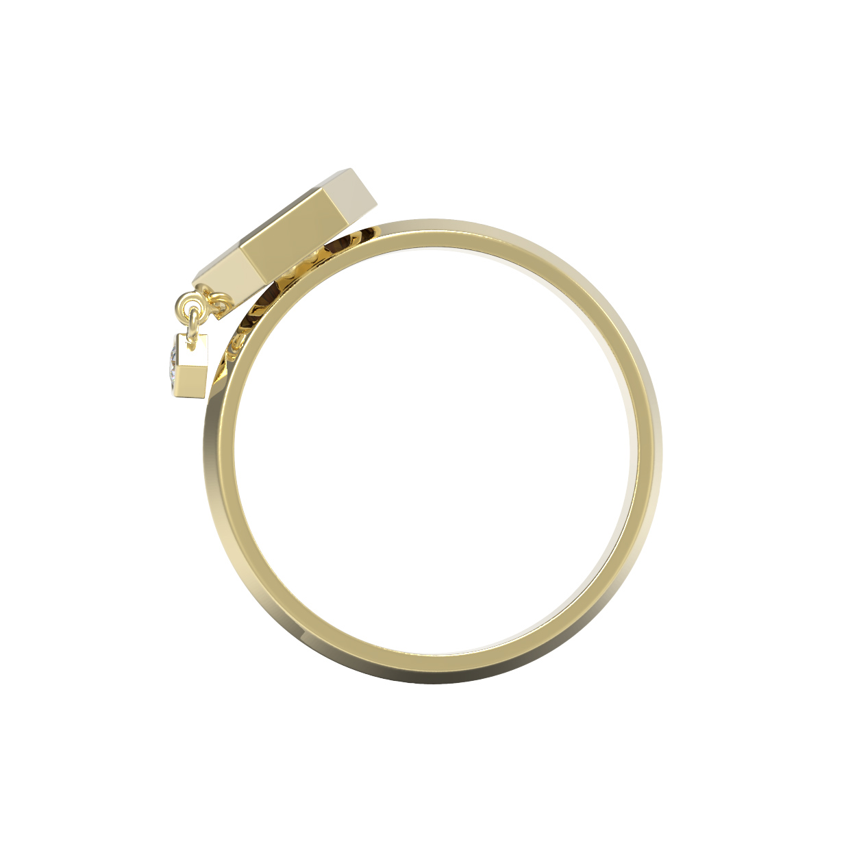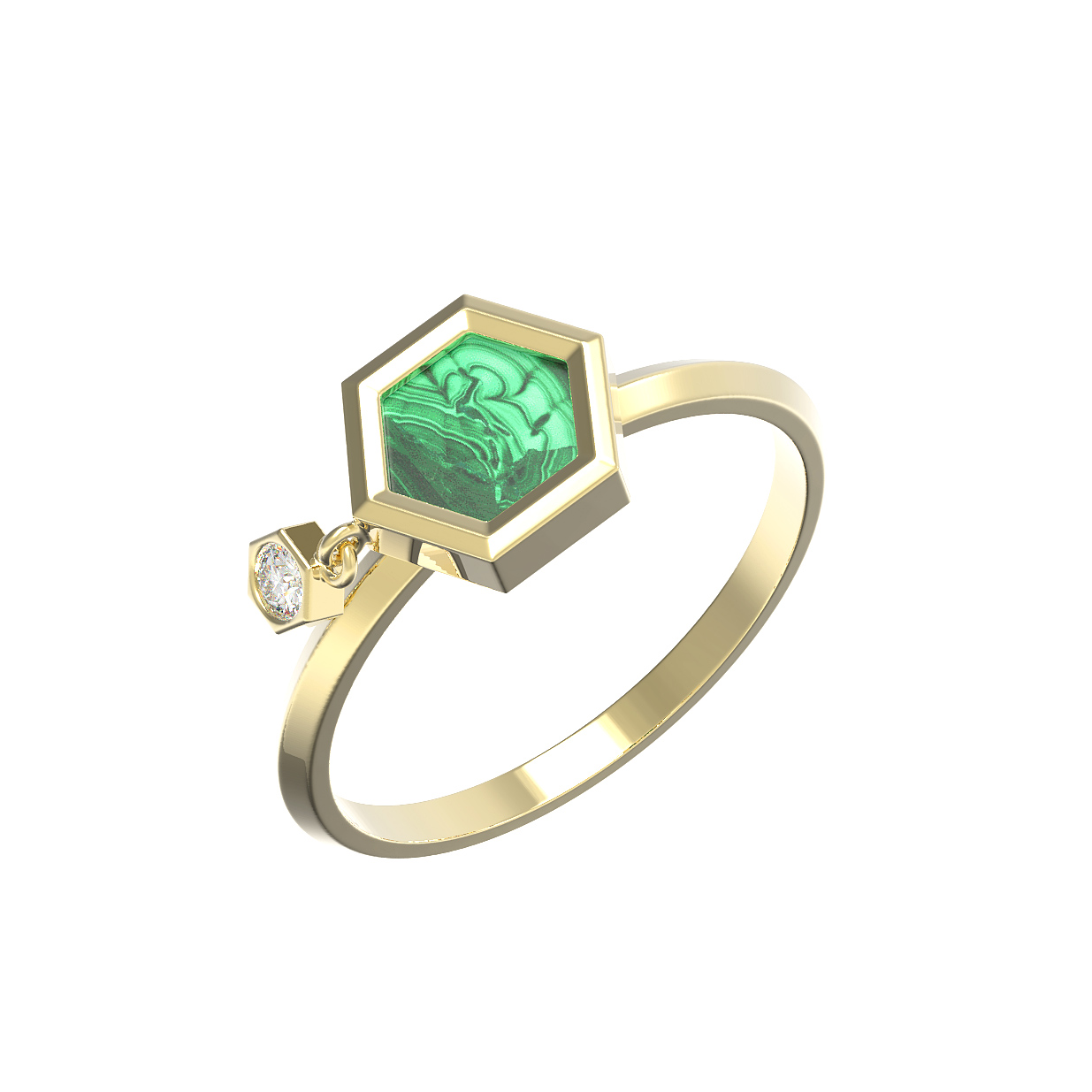 Композицию дополняет изящный подвижный элемент в форме миниатюрного шестигранника с сияющим бриллиантом белого цвета. Использование двух вставок разных фактур создает гармоничный контраст, который делает украшение запоминающимся и статусным. Лимонный оттенок золота придает кольцу особый теплый блеск, выгодно выделяя глубину малахитового узора.