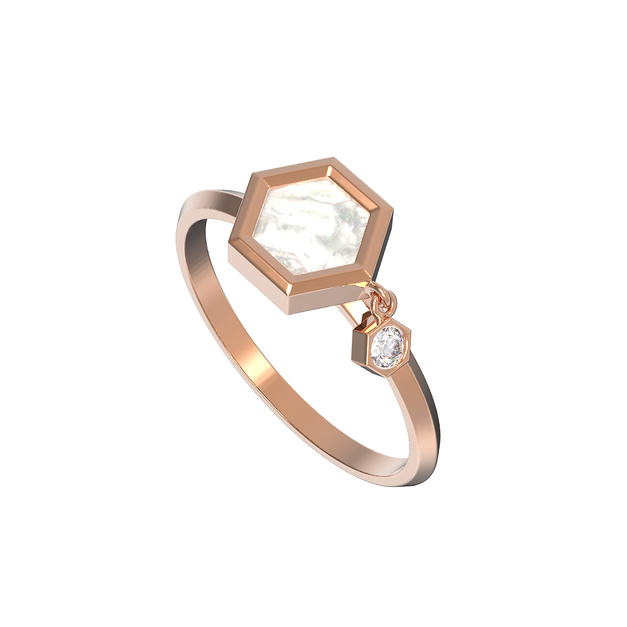 Элегантное кольцо из красного золота 585 пробы — центральный элемент коллекции De Luxe — Молекула, вдохновленной эстетикой молекулярных структур. Дизайн изделия сочетает в себе строгую геометрию и утонченную роскошь. Главным акцентом украшения является шестигранная вставка из перламутра с мягким белым свечением, которая гармонично дополнена сияющим бриллиантом круглой формы. Конструкция изделия объединяет эти два элемента в лаконичную и выразительную композицию.