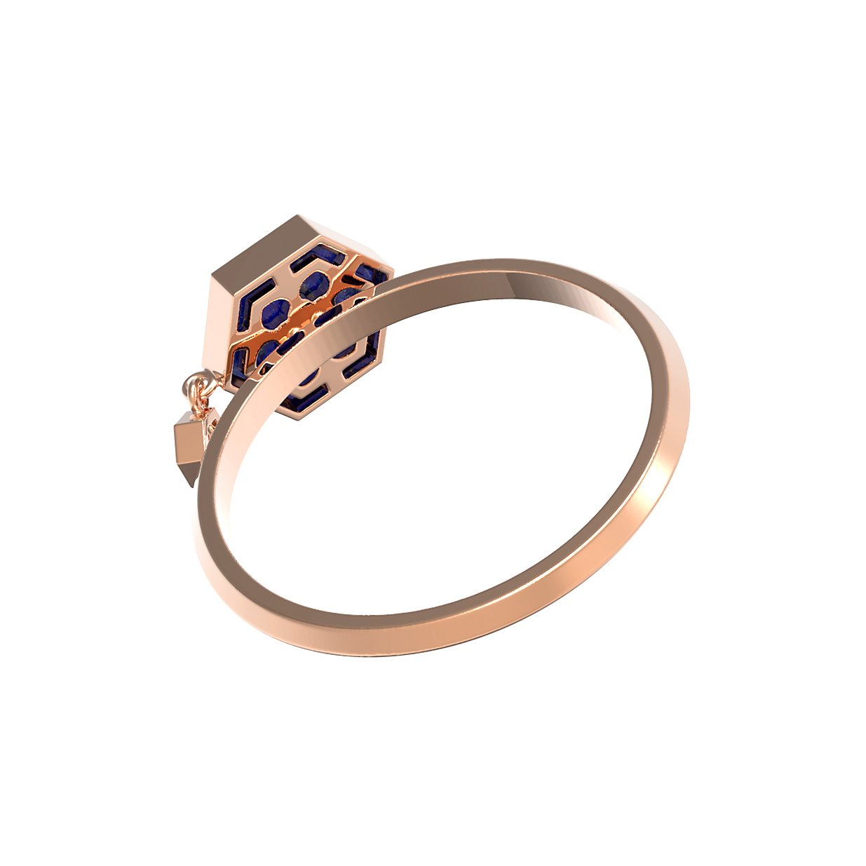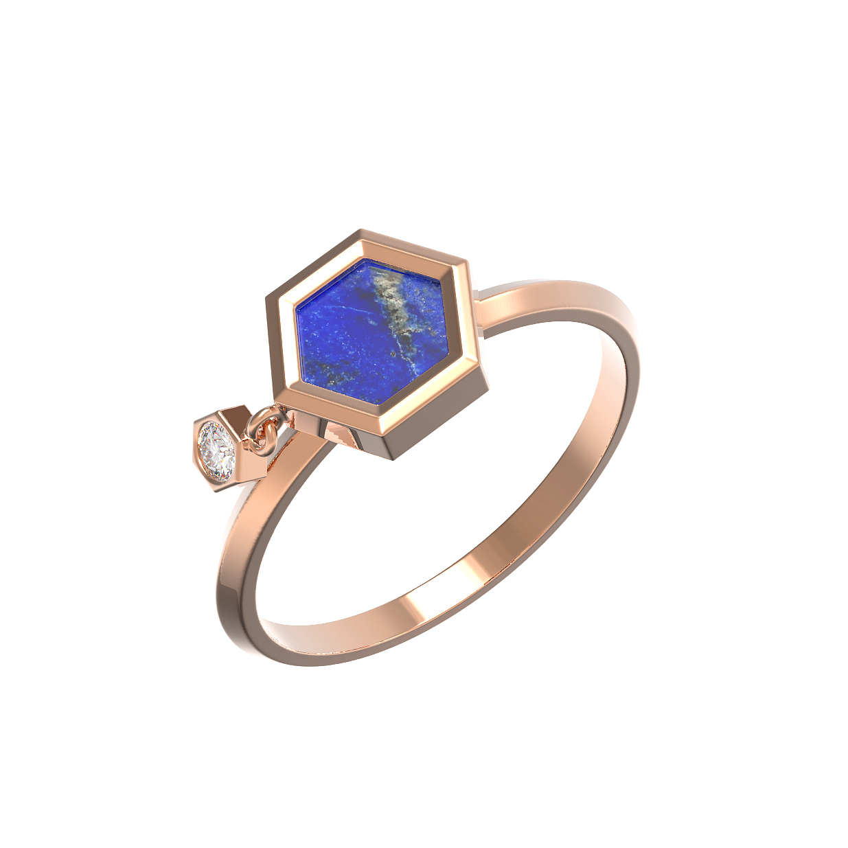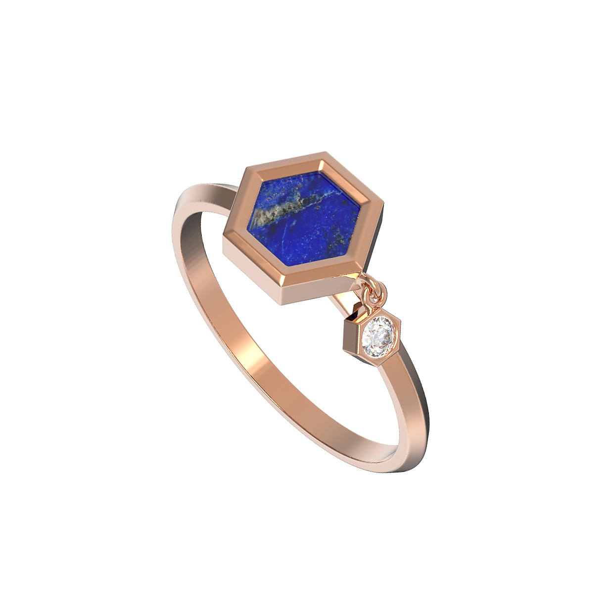 Откройте для себя оригинальное кольцо из красного золота 585 пробы из коллекции De Luxe — Молекула, которое станет ярким акцентом вашего стиля. Это украшение в современном дизайне «Молекула» гармонично объединяет благородство металла и природную красоту камней. Ювелирное изделие привлекает внимание необычной композицией: центральная вставка выполнена из насыщенного синего лазурита в форме шестигранника, рядом с которой на подвижном элементе расположился сверкающий белый бриллиант круглой огранки. Всего в украшении предусмотрено две вставки, создающие контрастный и динамичный образ.
