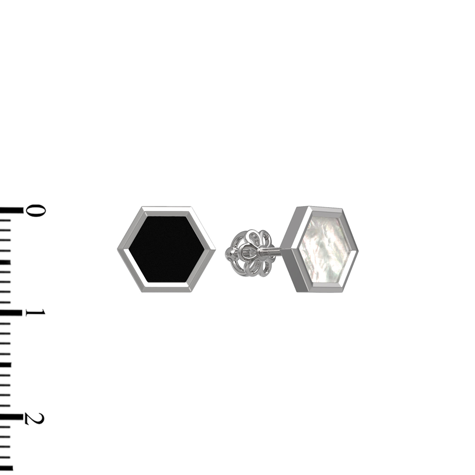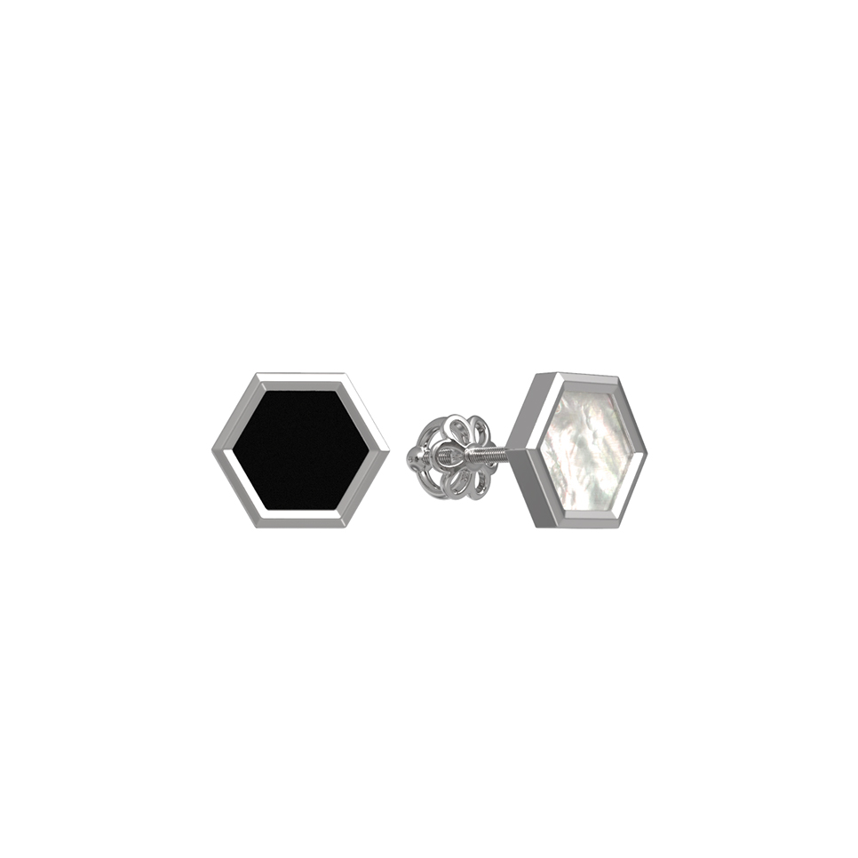 Элегантные серьги из белого золота 585 пробы из коллекции De Luxe — Молекула станут ярким дополнением вашего ювелирного гардероба. Этот аксессуар воплощает современный взгляд на геометрию — центральным элементом дизайна выступает форма шестигранника, напоминающая молекулярную структуру. Игра контрастов создает неповторимый визуальный эффект: одна серьга инкрустирована глубоким черным ониксом, а другая дополнена нежным перламутром.