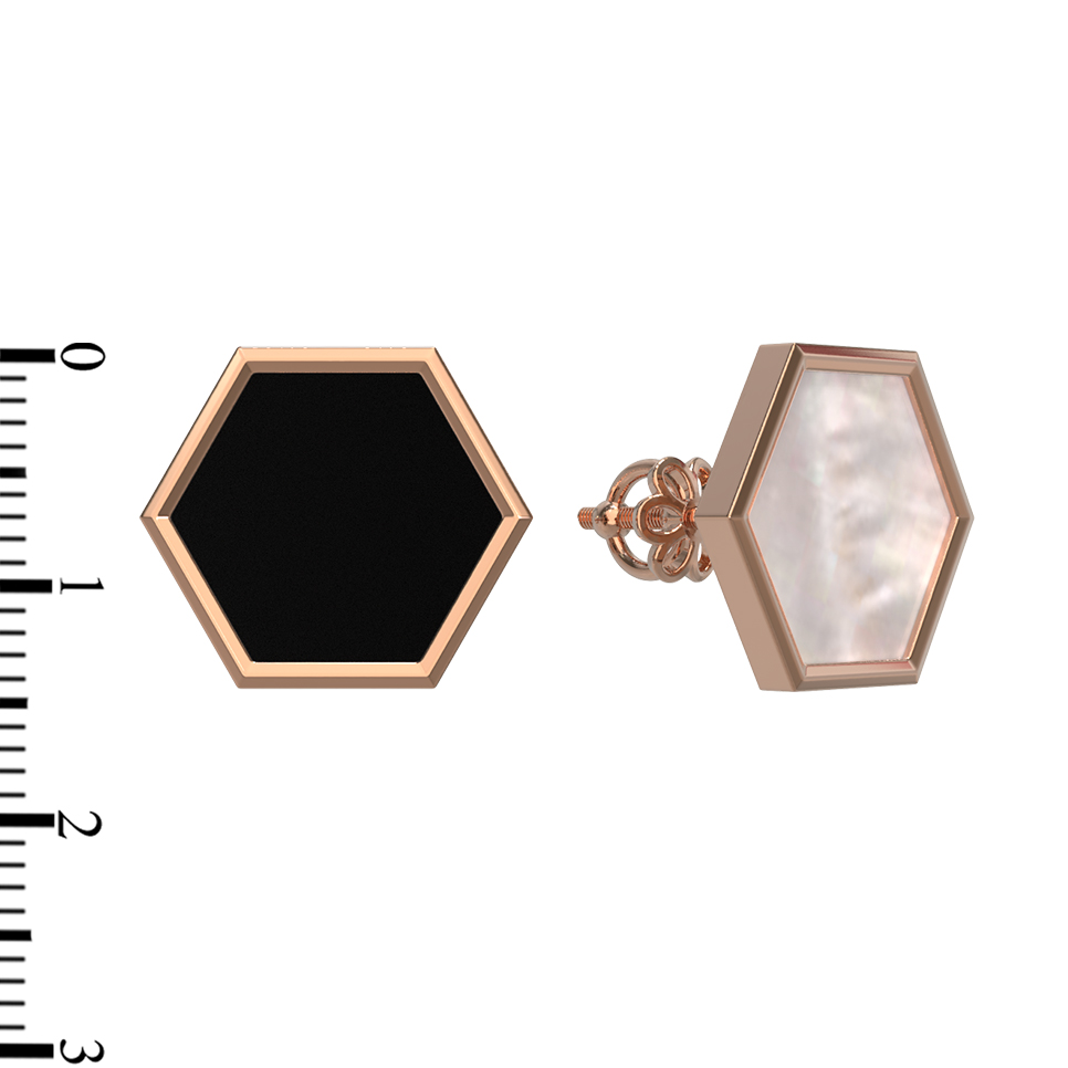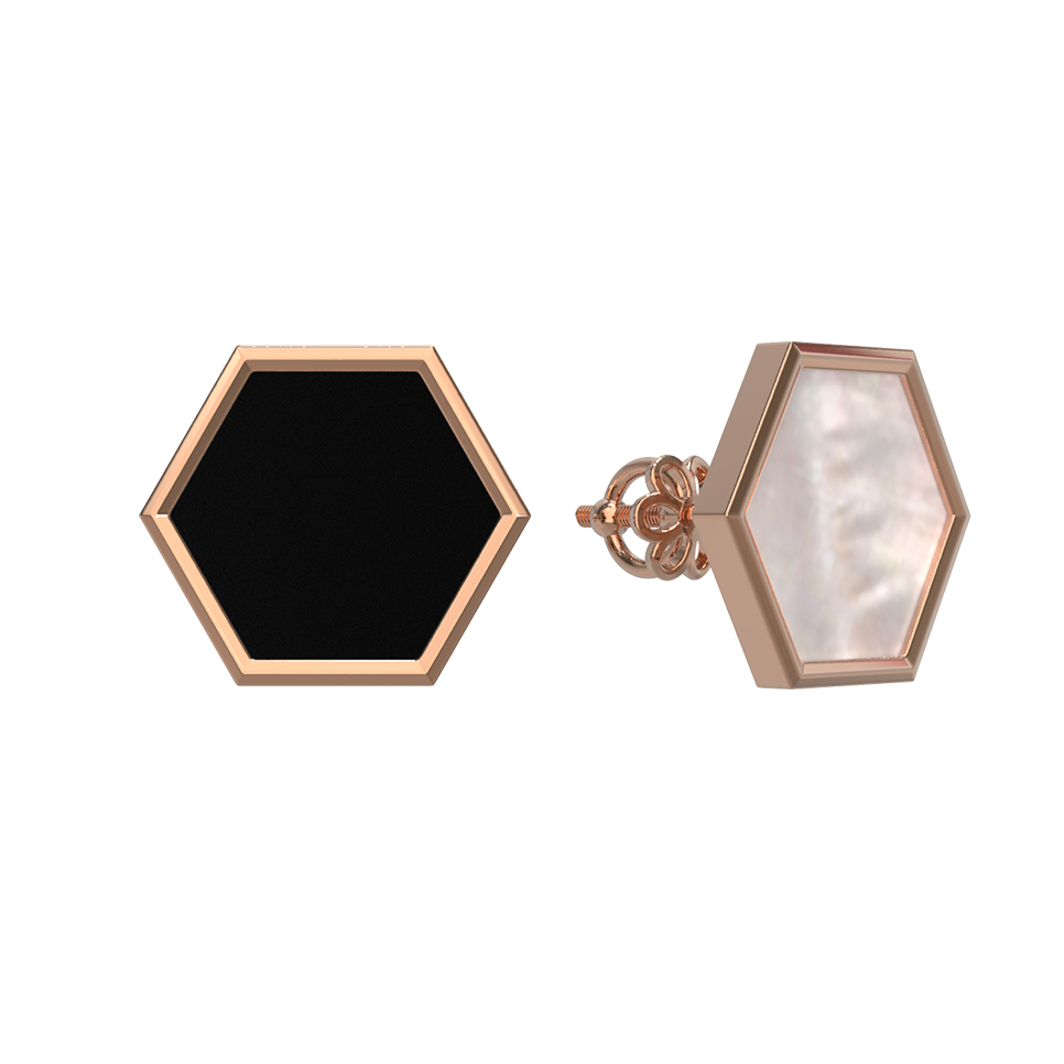 В основе композиции лежит игра контрастов: одна серьга инкрустирована глубоким черным ониксом, а другая дополнена нежным перламутром. Такое смелое дизайнерское решение позволяет создавать необычные стилистические комбинации. Геометрическая форма вставок — шестигранник — придает изделию динамичный и актуальный вид. Каждая серьга содержит по одной крупной вставке, которые притягивают взгляд своим природным сиянием и глубиной цвета.