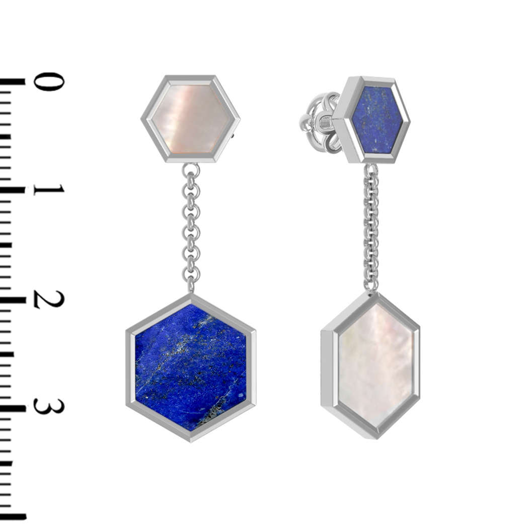Центральными элементами композиции стали две вставки, выполненные в форме шестигранника. Глубокий синий цвет натурального лазурита эффектно контрастирует с мягким сиянием перламутра, создавая завораживающий визуальный тандем. Изящная цепочка соединяет элементы, придавая серьгам динамику и легкость при каждом движении.