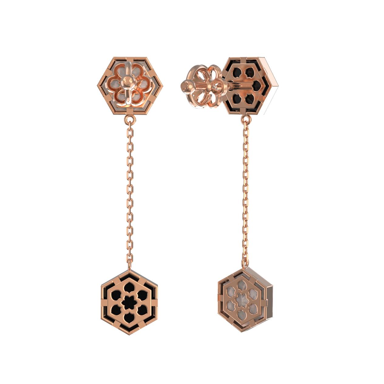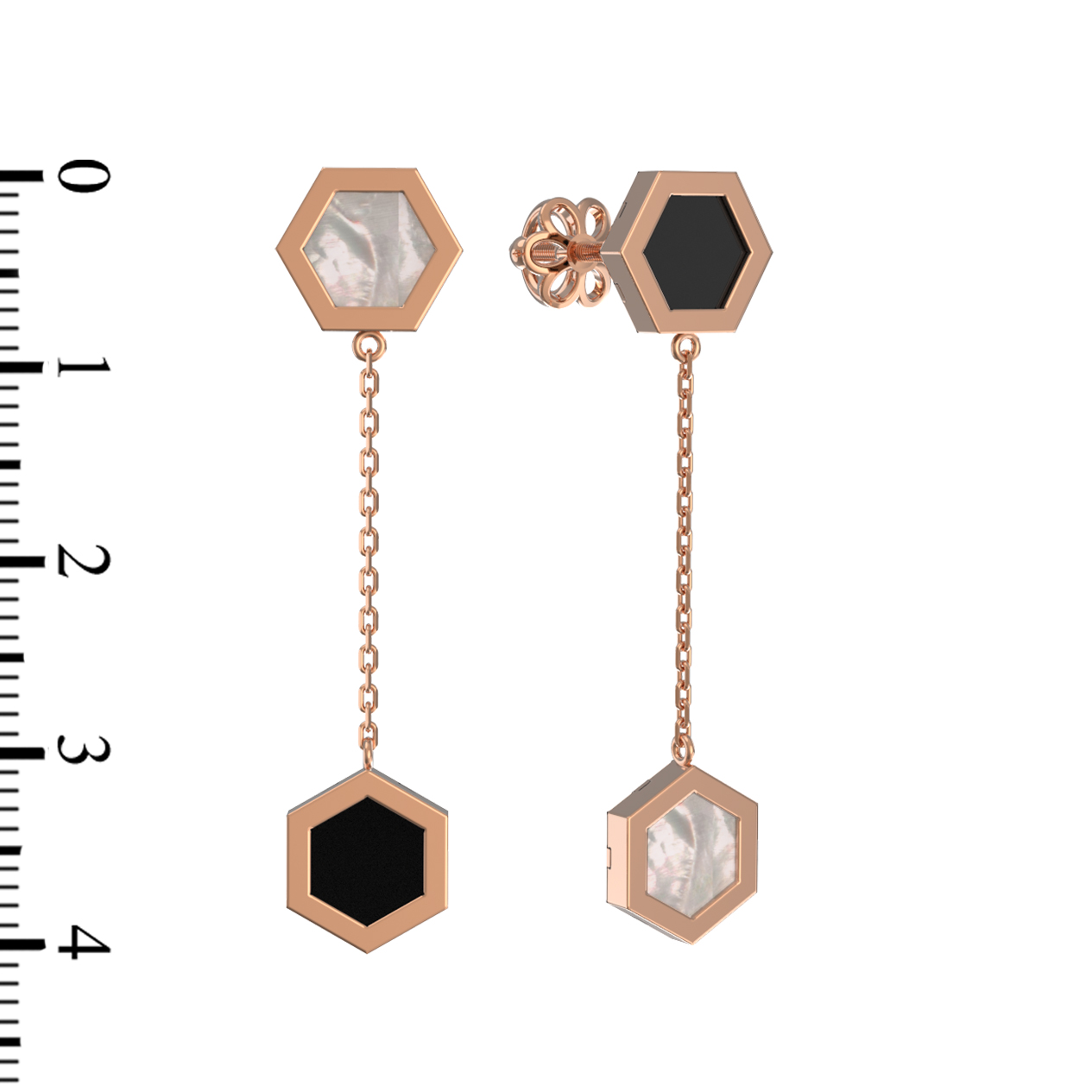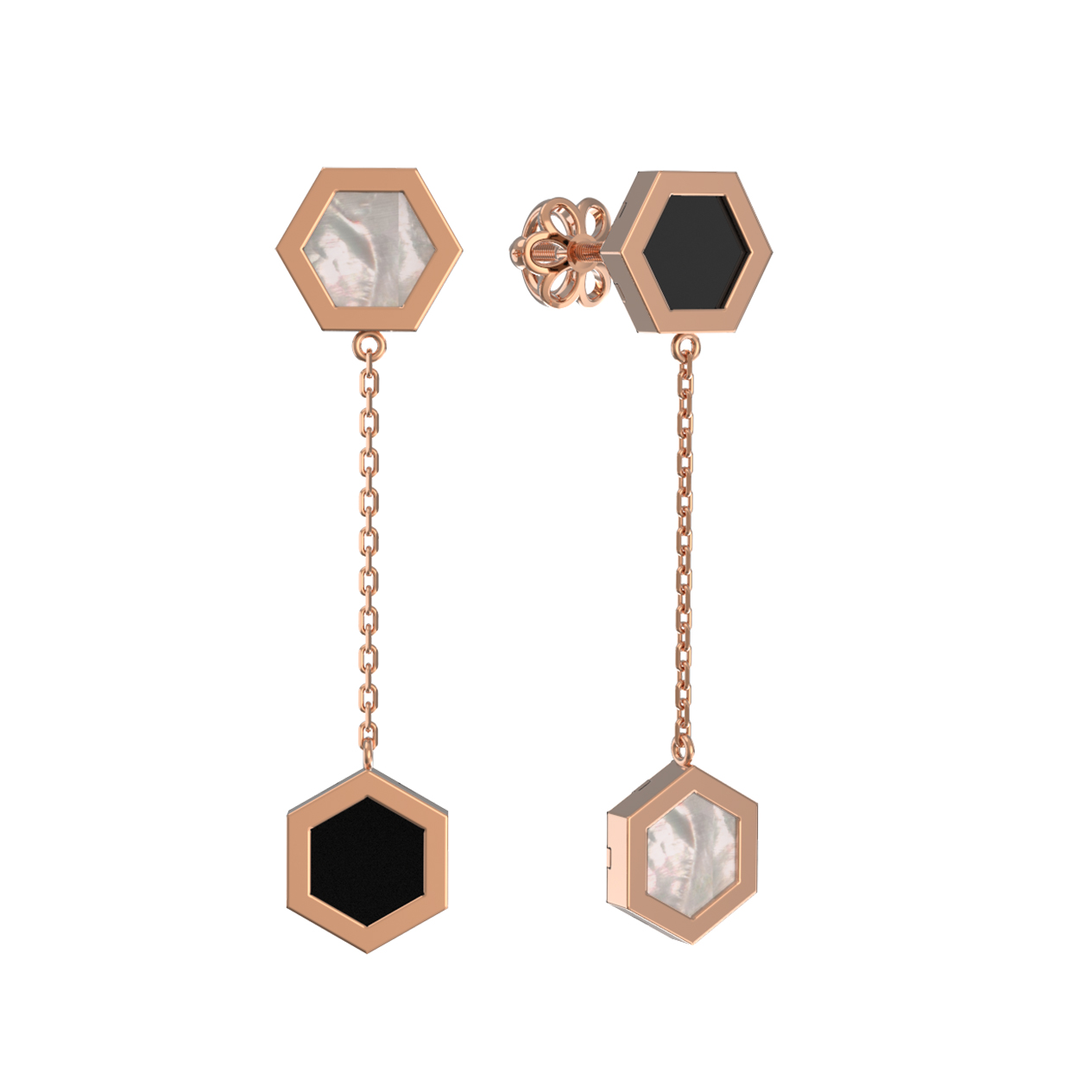Ключевым акцентом серег стала необычная форма вставок — шестигранник. Мастера гармонично скомбинировали два контрастных материала: глубокий черный оникс и нежный перламутр, мерцающий природным блеском. Всего в изделии использовано 2 вставки, которые создают эффектный визуальный баланс. Лаконичная цепочка, соединяющая элементы, добавляет серьгам легкости и подвижности, заставляя их красиво играть при каждом вашем движении.