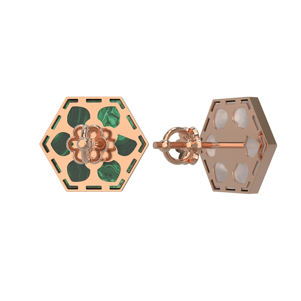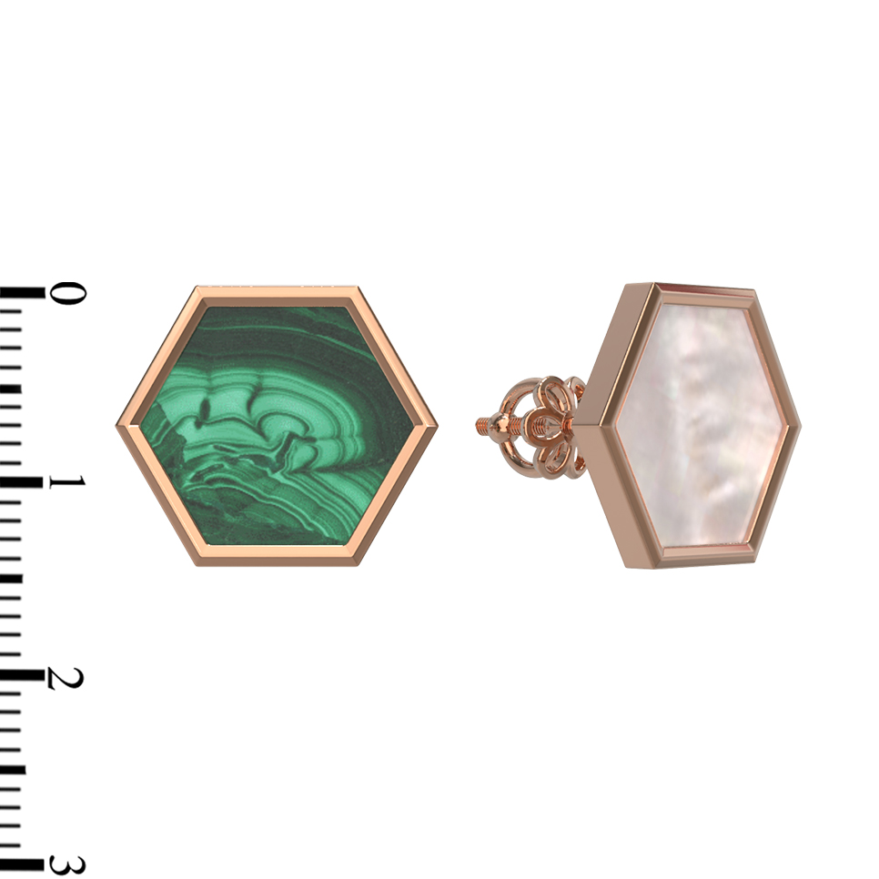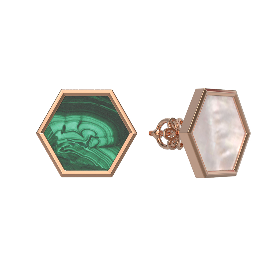 В центре композиции находится сочетание двух благородных материалов: глубокого зеленого малахита с его неповторимым рисунком и нежного, переливающегося перламутра. Каждая серьга содержит по одной вставке, которые притягивают взгляд своим контрастным цветом и природным сиянием. Геометрическая форма вставок — шестигранник — подчеркивает современный характер изделия.