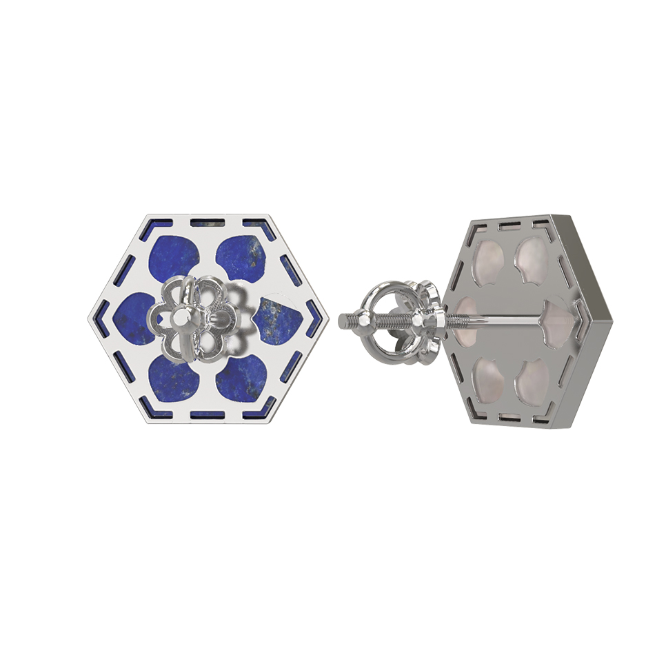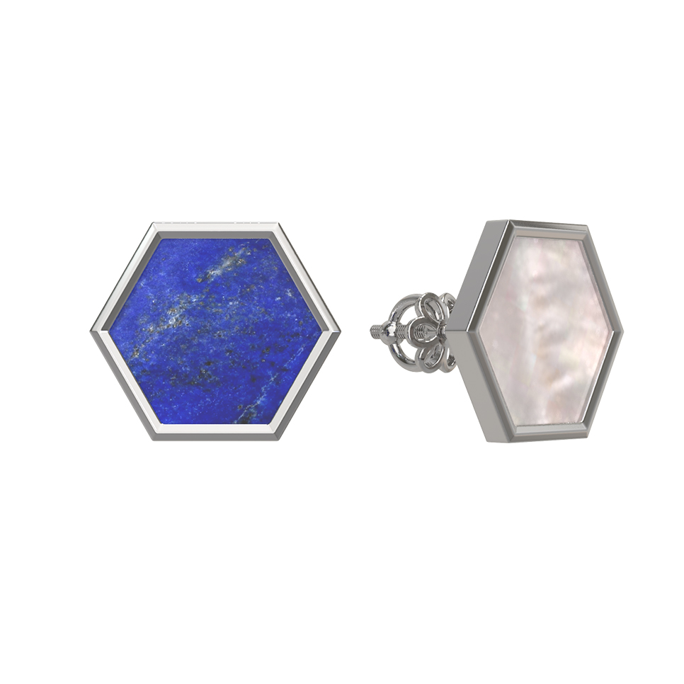 Особенностью этих серег является контрастное сочетание материалов. Одна вставка выполнена из насыщенного синего лазурита, напоминающего о глубине ночного неба, а вторая — из нежного перламутра с мягким переливом. Каждая сережка имеет одну вставку шестигранной формы, что создает гармоничную асимметрию, выделяющую вас из толпы. Универсальность модели позволяет носить эти серьги как женщинам, так и мужчинам, предпочитающим оригинальные ювелирные решения.