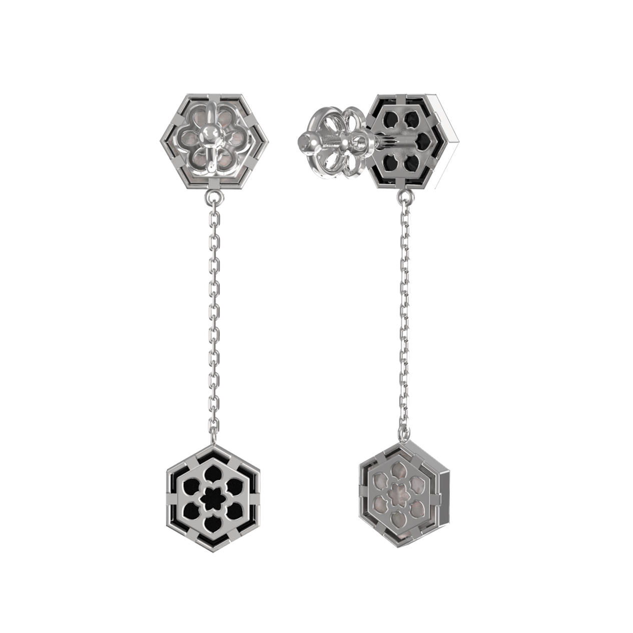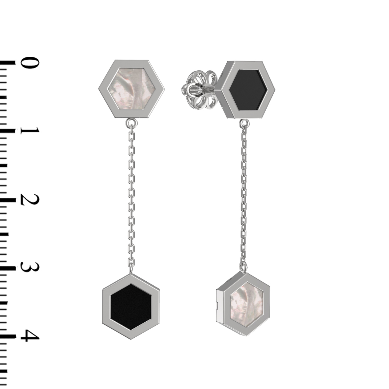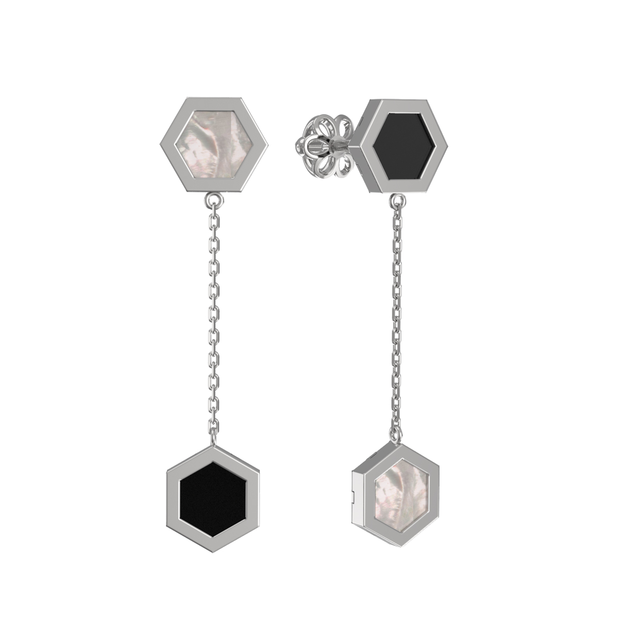Дизайн модели вдохновлен структурой молекулы, что выражается в использовании вставок правильной формы шестигранника. Необычное сочетание материалов делает эти серьги поистине универсальными: глубокий черный цвет оникса эффектно контрастирует с мягким переливчатым сиянием перламутра. Каждое изделие содержит 2 вставки, искусно встроенные в золотую оправу.