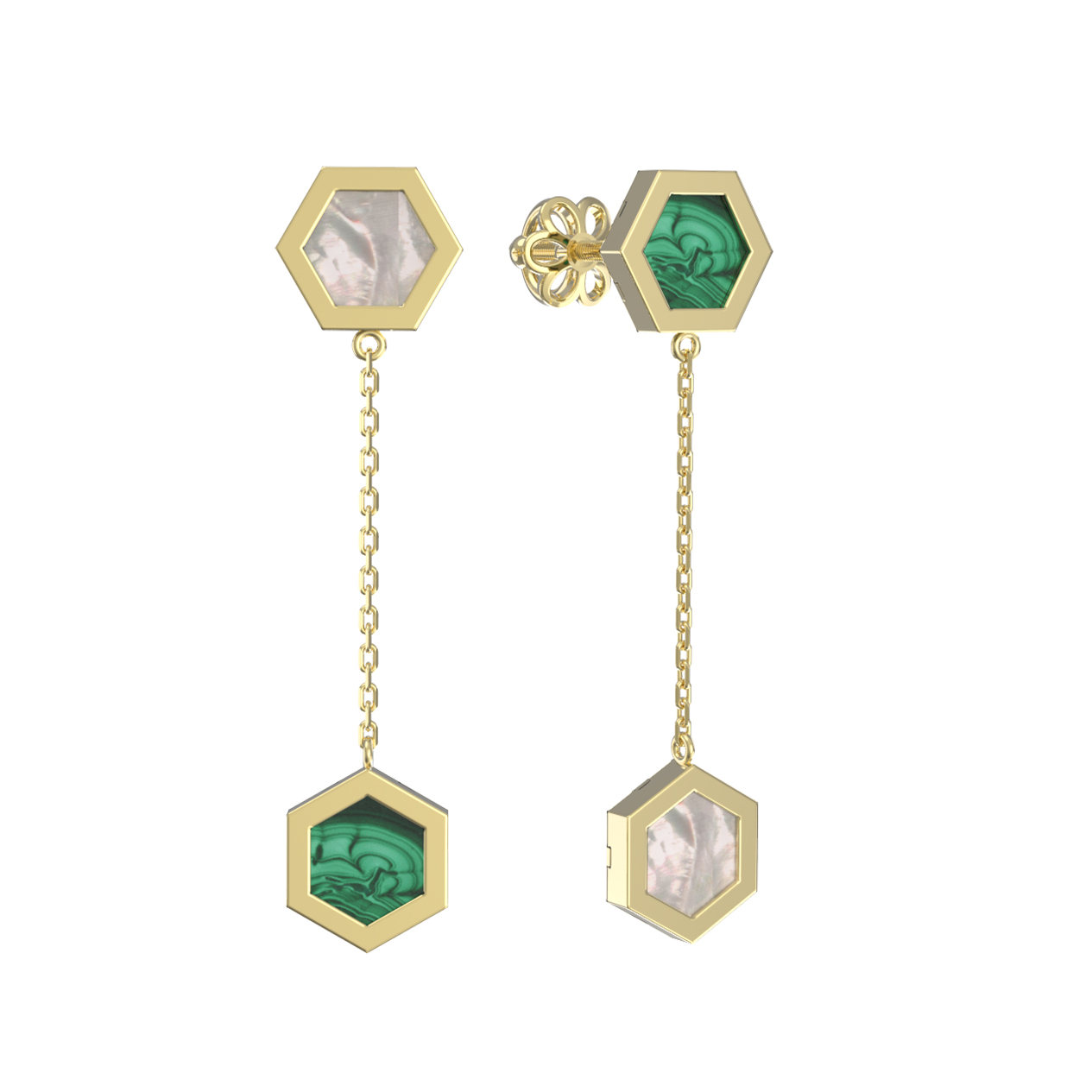 Дизайн модели вдохновлен структурой молекулы, что выражается в использовании четких форм. В центре внимания — вставки из малахита и перламутра, выполненные в виде правильных шестигранников. Зеленый оттенок малахита с его неповторимым природным рисунком гармонично контрастирует с нежным перламутровым переливом, создавая эффектный и сбалансированный дуэт. В каждой паре серег используется 2 вставки, которые притягивают взгляд своим качественным исполнением и яркостью.