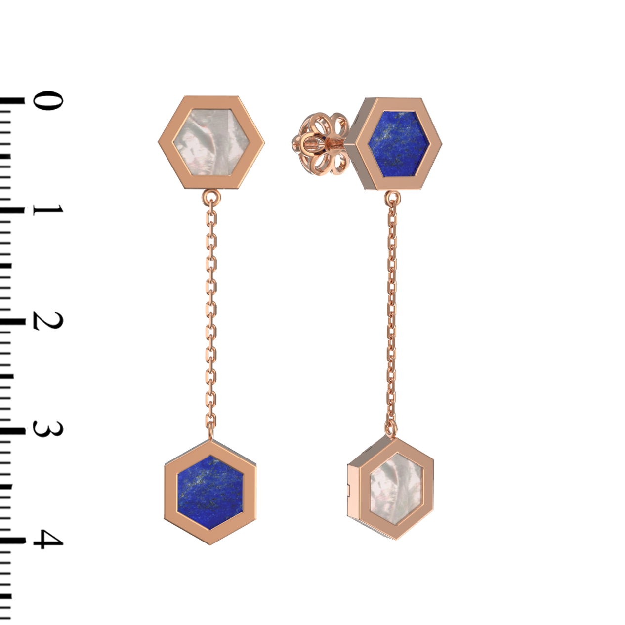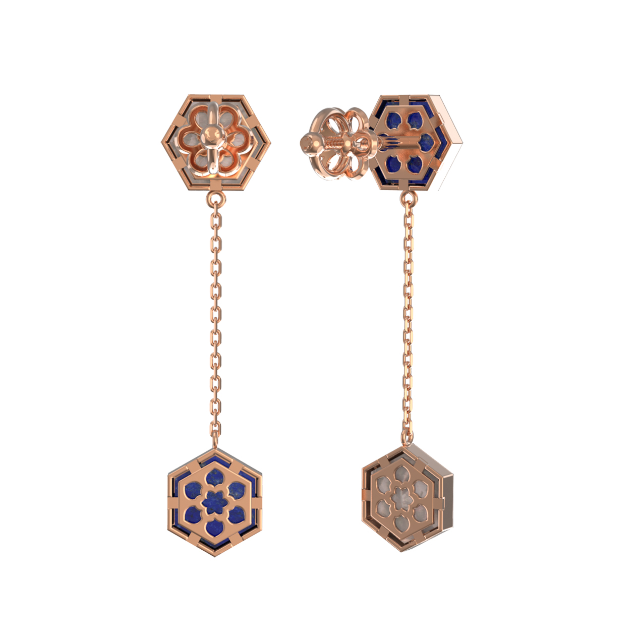 Серьги выполнены из красного золота 585 пробы, чей теплый оттенок идеально подчеркивает контраст вставок. Центральными элементами выступают два шестигранника, инкрустированные лазуритом и перламутром. Глубокий синий цвет лазурита создает эффектное сочетание с нежным сиянием перламутра, придавая композиции глубину и выразительность. Общее количество вставок составляет 2 штуки, гармонично распределенных в дизайне.
