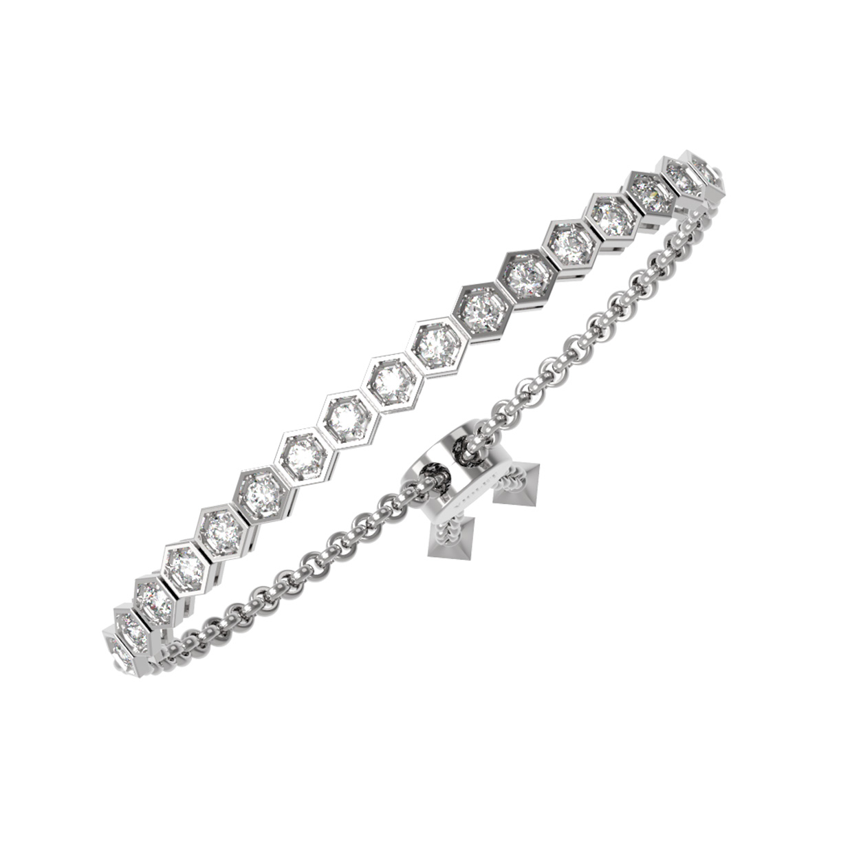 Элегантный и современный браслет из белого золота 585 пробы станет утонченным акцентом вашего образа. Дизайн украшения, вдохновленный концепцией Молекула, придает ему особую геометрическую выразительность и визуальную глубину. Это изделие из коллекции De Luxe — Молекула гармонично сочетает в себе холодный блеск благородного металла и сияние драгоценных камней, что делает его универсальным аксессуаром как для женщин, так и для мужчин.