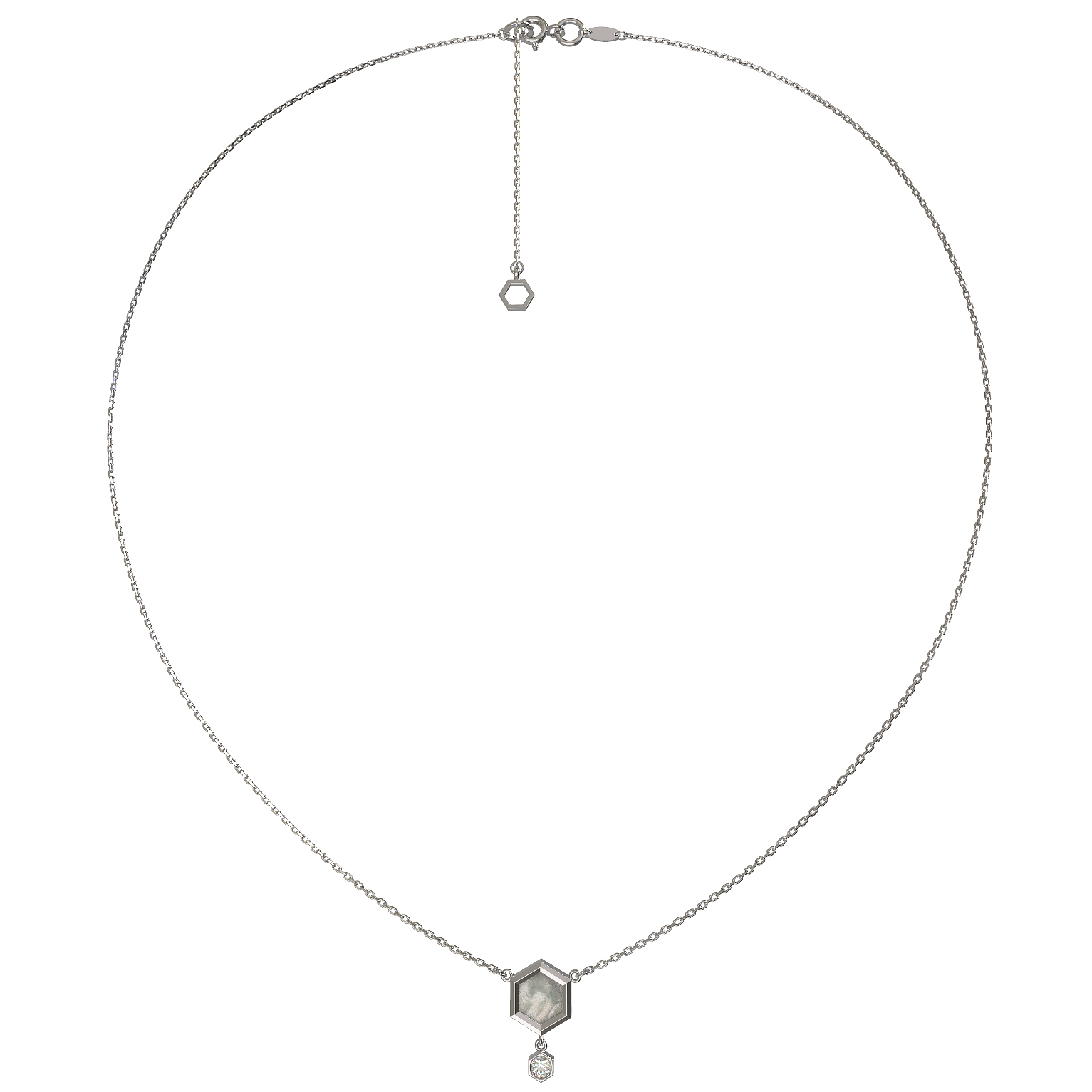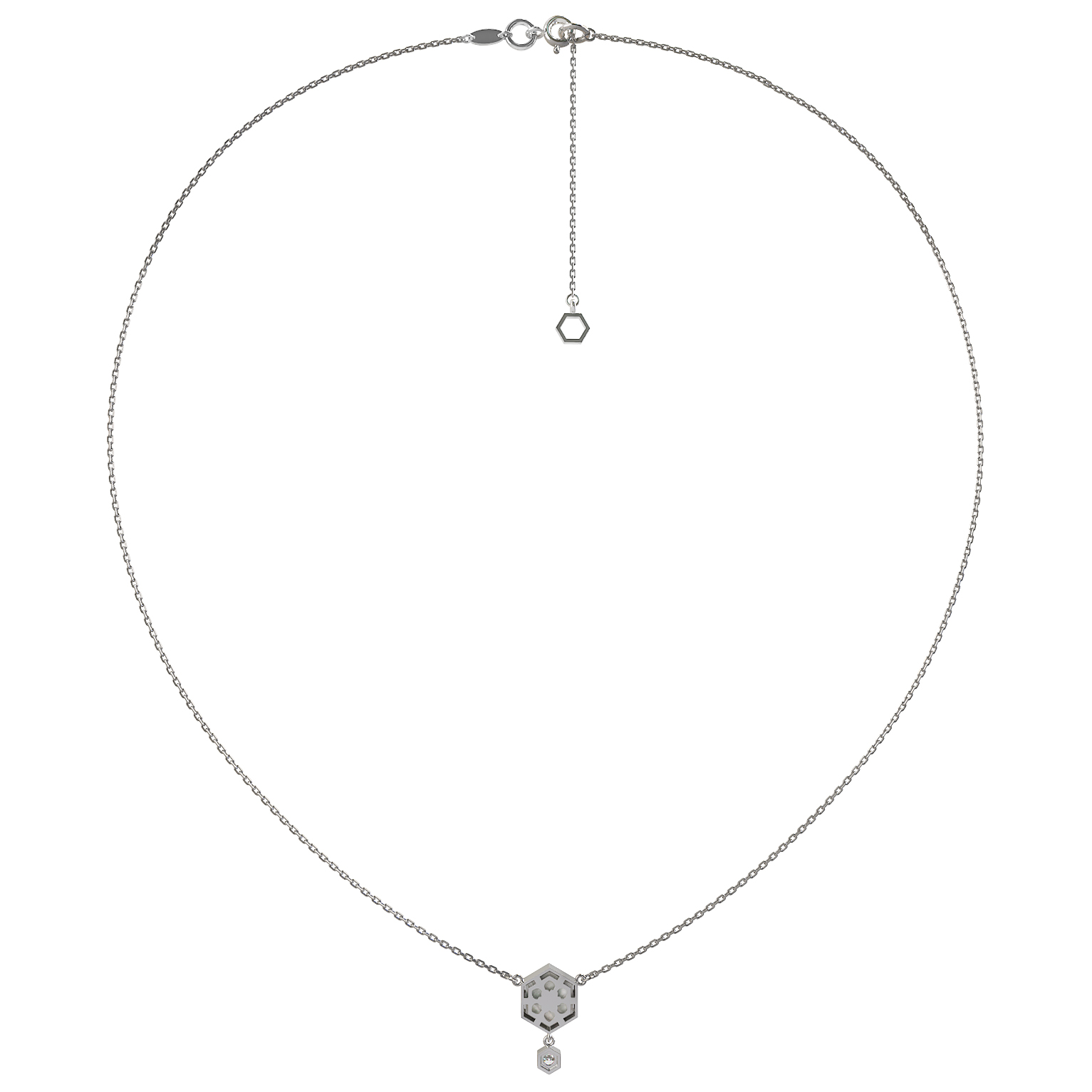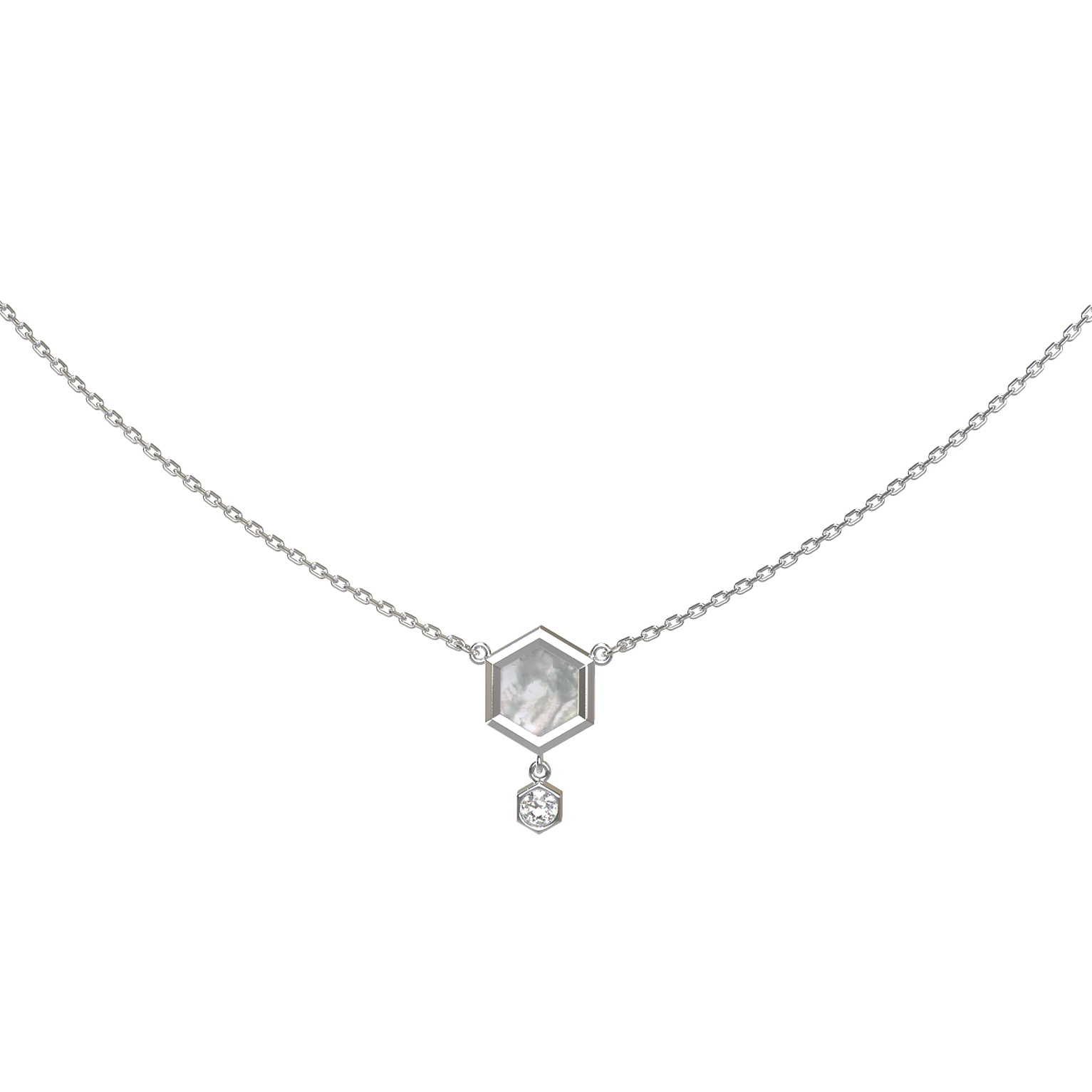 Элегантное колье из белого золота 585 пробы из коллекции De Luxe — Молекула станет безупречным акцентом в вашем образе. Дизайн изделия вдохновлен строгой геометрией молекулы, что придает украшению современный и лаконичный вид. В центре композиции расположен перламутр в шестигранной оправе белого цвета, который мягко переливается и притягивает взгляд. Дополняет дизайн изящная подвеска с круглой вставкой — сверкающим бриллиантом, создающим эффектный контраст с нежным перламутром.