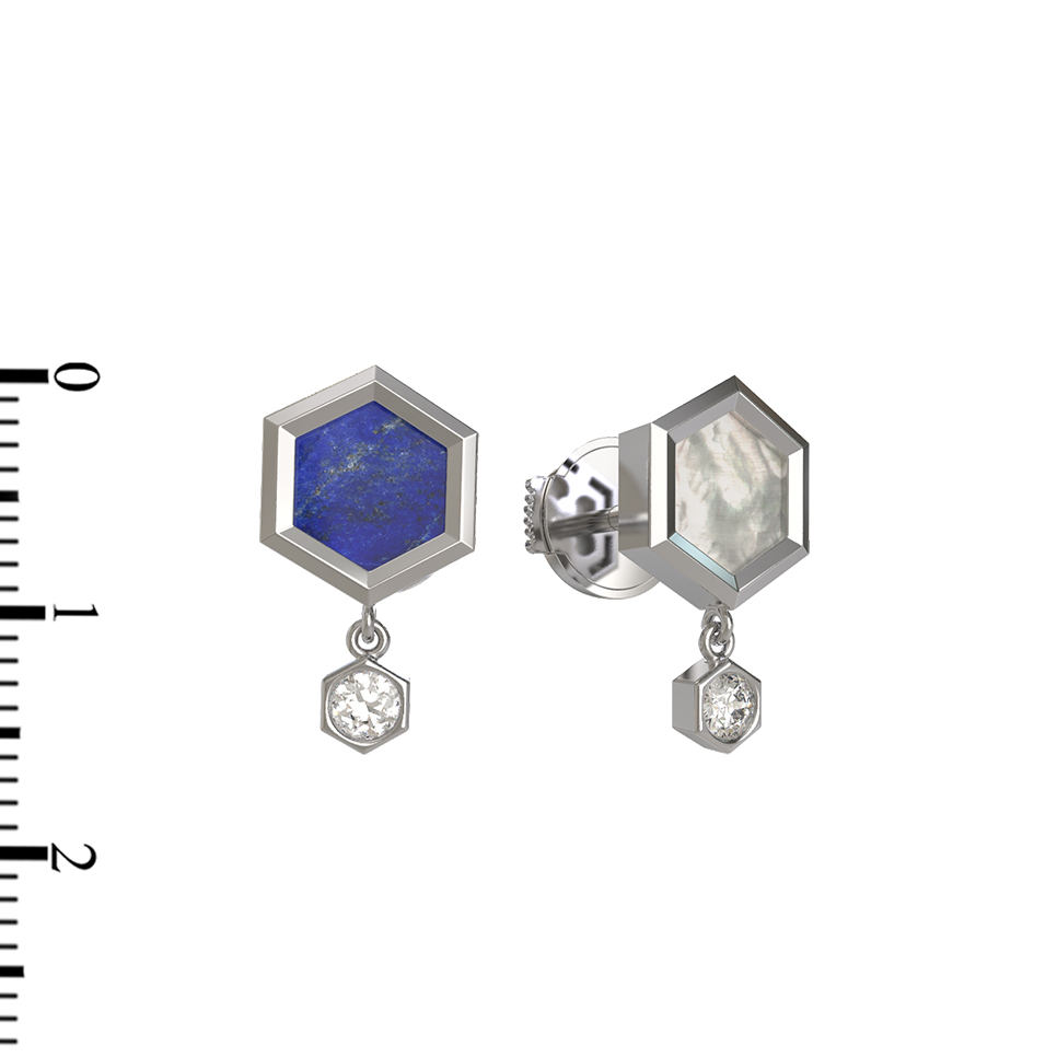 Центральные элементы выполнены из контрастных природных минералов: насыщенного синего лазурита и нежного перламутра с его мягким переливом. Такое сочетание делает аксессуар выразительным акцентом, который идеально вписывается в образ. Дополнительное сияние изделию придают 3 вставки: драгоценные бриллианты классической круглой огранки, изящно закрепленные на подвесной части серег.