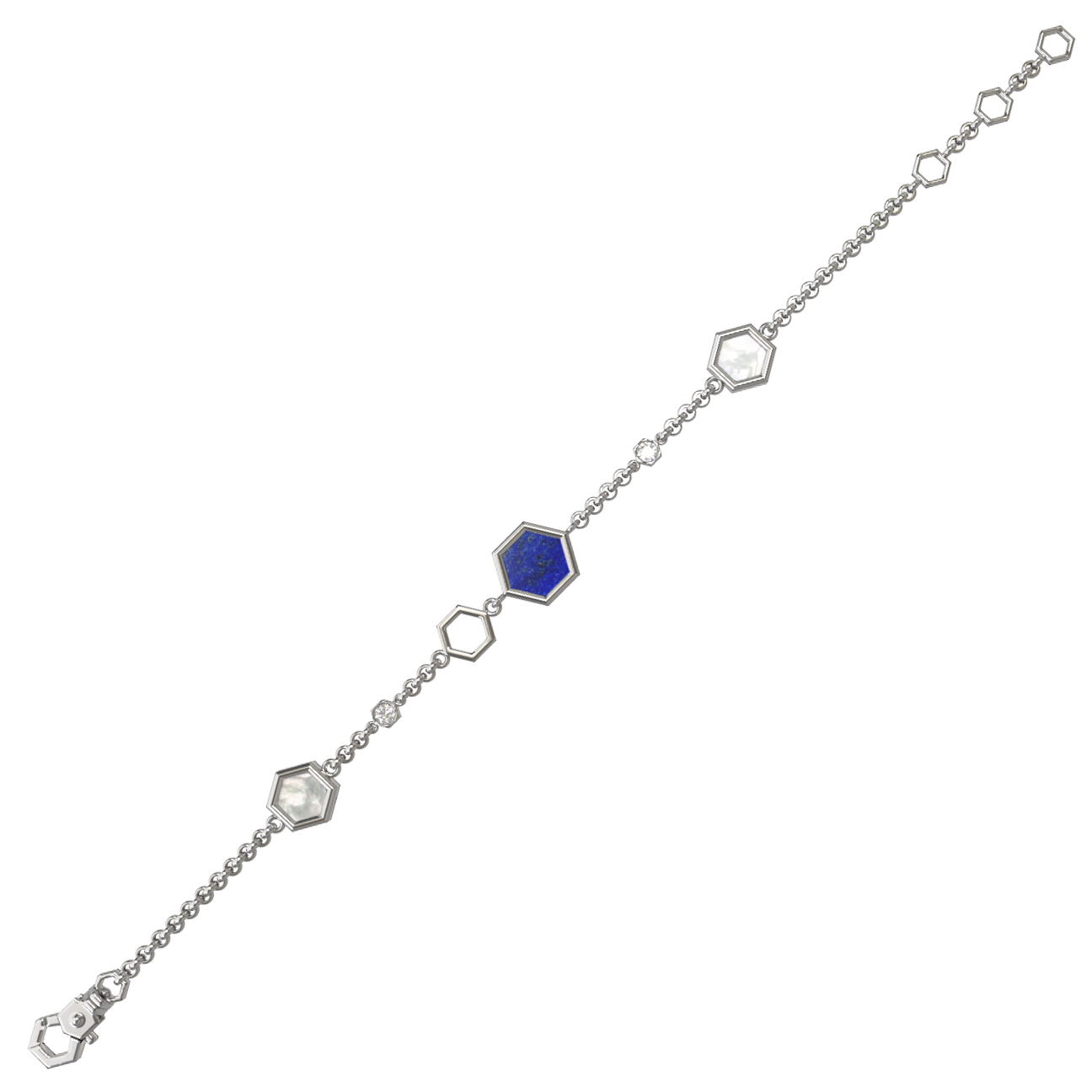 В центре композиции находится яркий синий лазурит в форме шестигранника, который контрастирует с нежным перламутром и холодным блеском белого золота. Три вставки, включая сияющий бриллиант, придают украшению особый шарм и выразительность. Общая цветовая палитра — белый, синий и перламутровый оттенки — позволяет легко сочетать этот браслет как с повседневным, так и с вечерним образом.