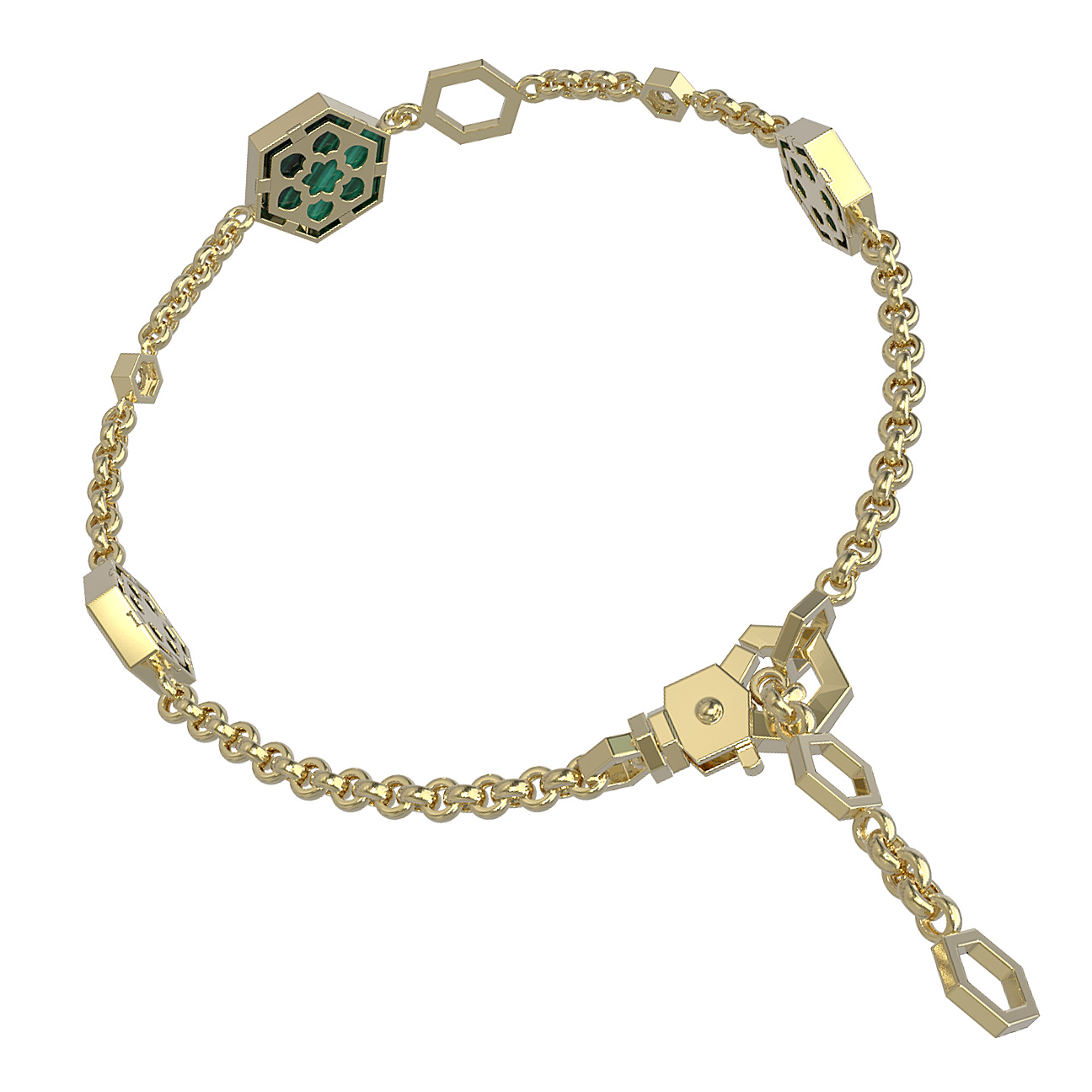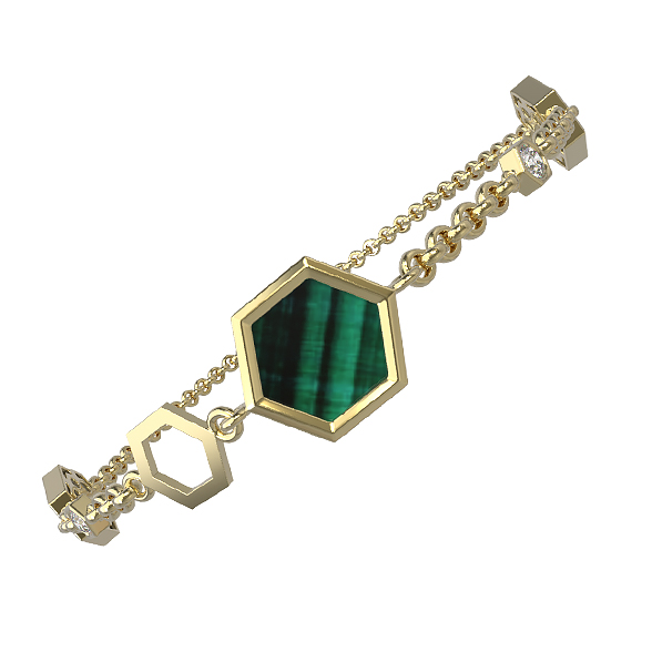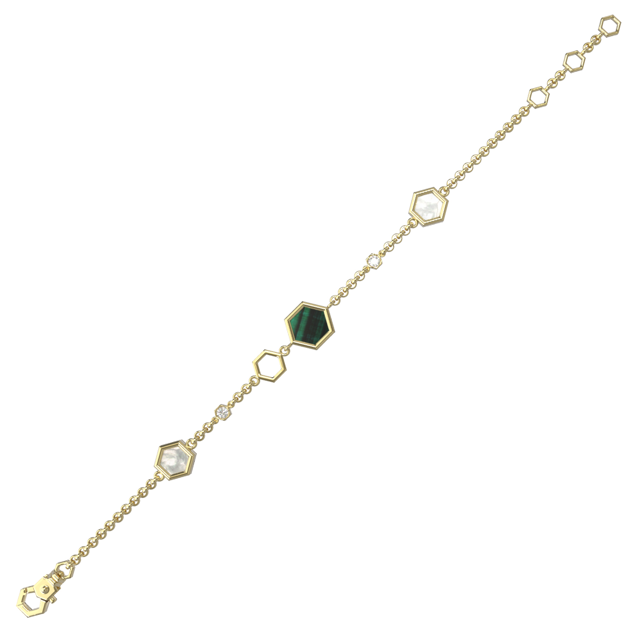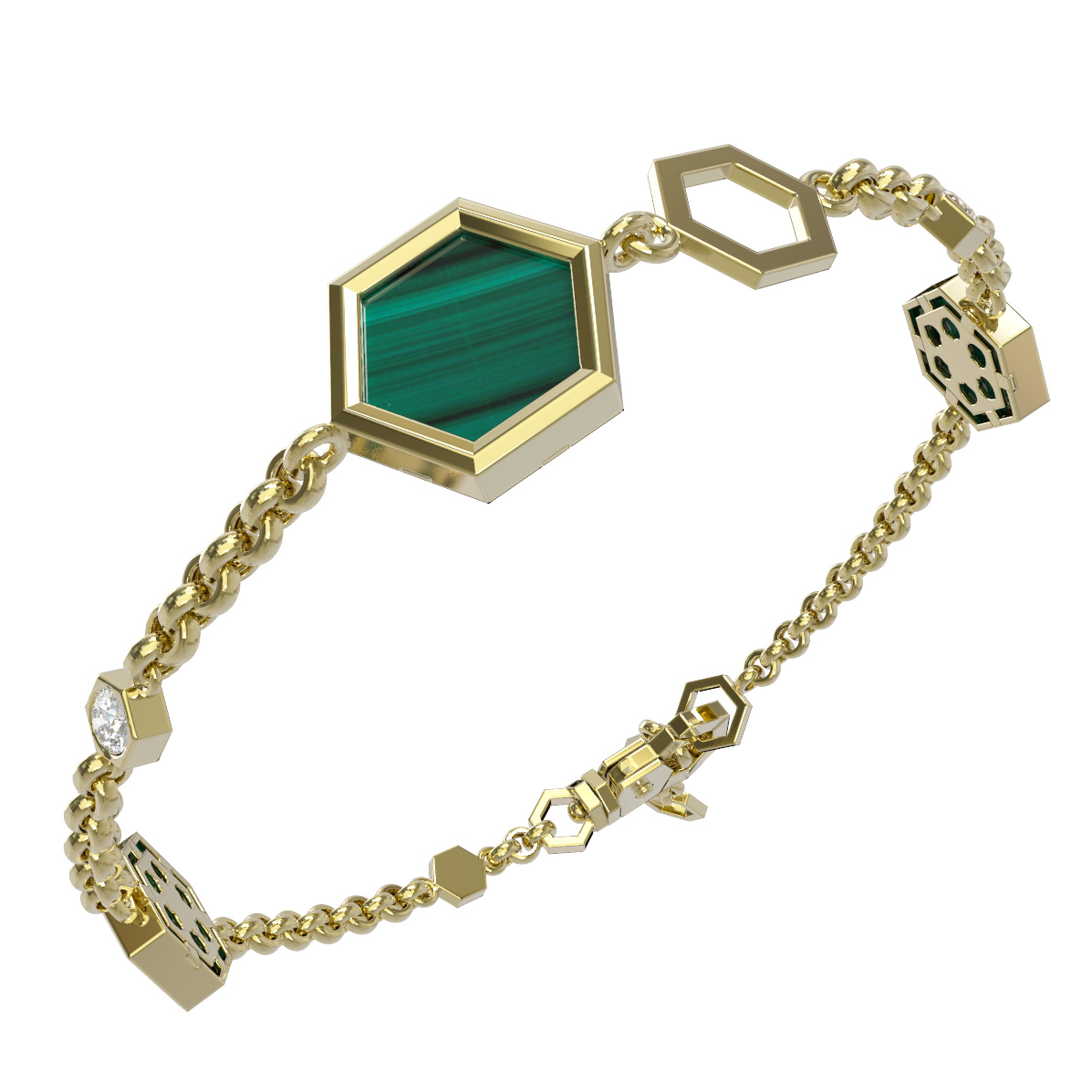 Представляем вашему вниманию изысканный браслет из лимонного золота 585 пробы, вдохновленный эстетикой природной геометрии. Это ювелирное изделие из коллекции De Luxe — Молекула воплощает концепцию молекулярного дизайна, где строгость линий гармонично сочетается с естественной красотой натуральных минералов. Уникальная композиция выполнена с использованием трех вставок, среди которых роскошный бриллиант, благородный малахит и нежный перламутр.