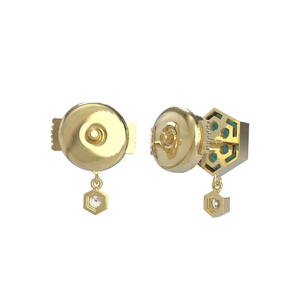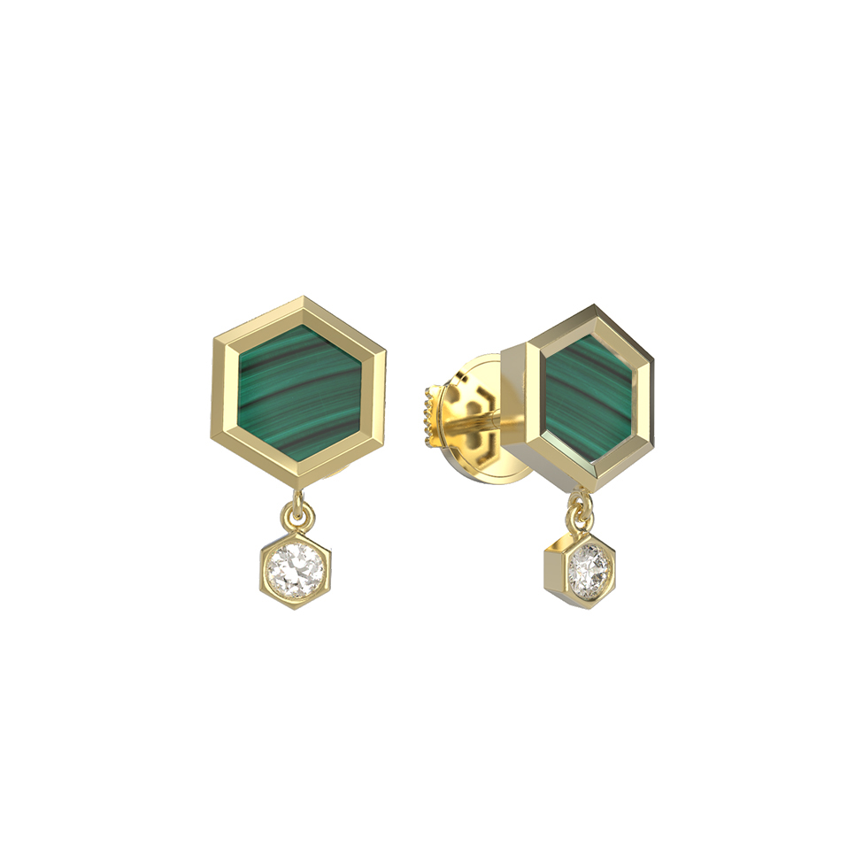 Серьги из лимонного золота 585 пробы из коллекции De Luxe — Молекула воплощают в себе смелый геометрический стиль и элегантность. Дизайн Молекула акцентирует внимание на четких линиях и гармоничном сочетании форм, превращая классическое ювелирное украшение в современный арт-объект. В основе композиции лежит шестигранник, декорированный насыщенным малахитом зеленого цвета, который дополняет сияющий бриллиант круглой формы.