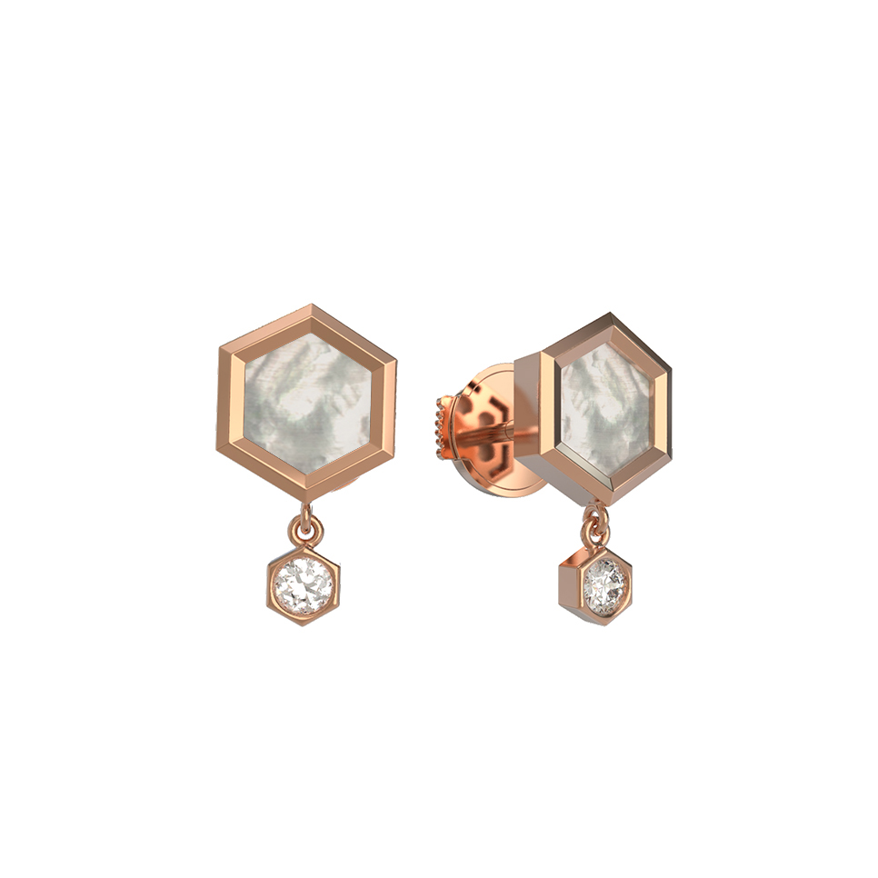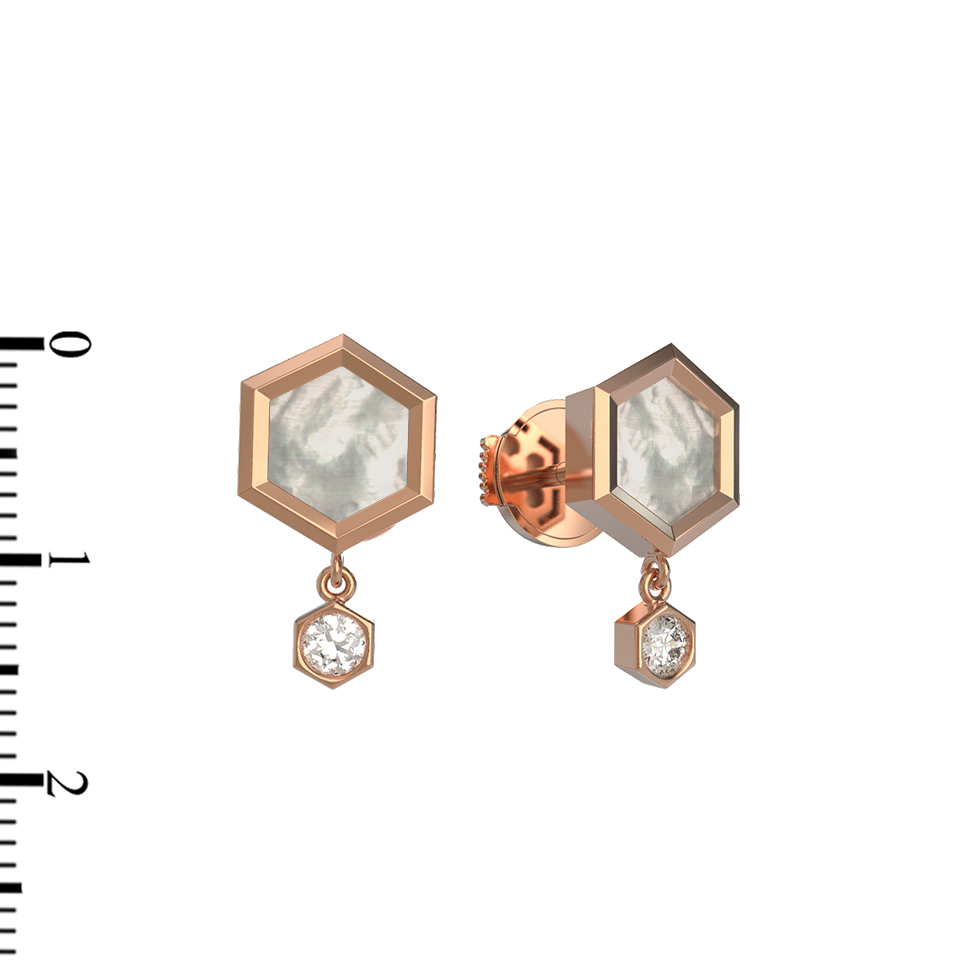 Серьги выполнены из красного золота 585 пробы, чей теплый оттенок подчеркивает благородство материалов. В центре каждой серьги расположен перламутр, обладающий мягким переливом, который притягивает взгляд своей естественной красотой. Дополняет композицию миниатюрный бриллиант круглой огранки, заключенный в шестигранную оправу, что создает деликатный акцент и добавляет изделию роскошного блеска.