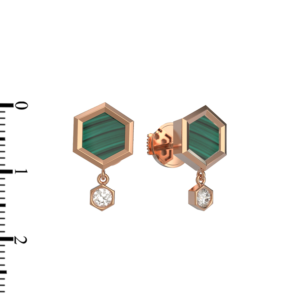 Элегантные серьги из коллекции De Luxe — Молекула станут ярким акцентом вашего образа. Дизайн украшения, вдохновленный структурой молекулы, подчеркивает современный подход к ювелирному искусству. Изделие выполнено из красного золота 585 пробы, чей теплый оттенок гармонично сочетается с насыщенным зеленым цветом малахита. Вставка из малахита имеет форму шестигранника, что придает украшению геометрическую четкость и стиль.